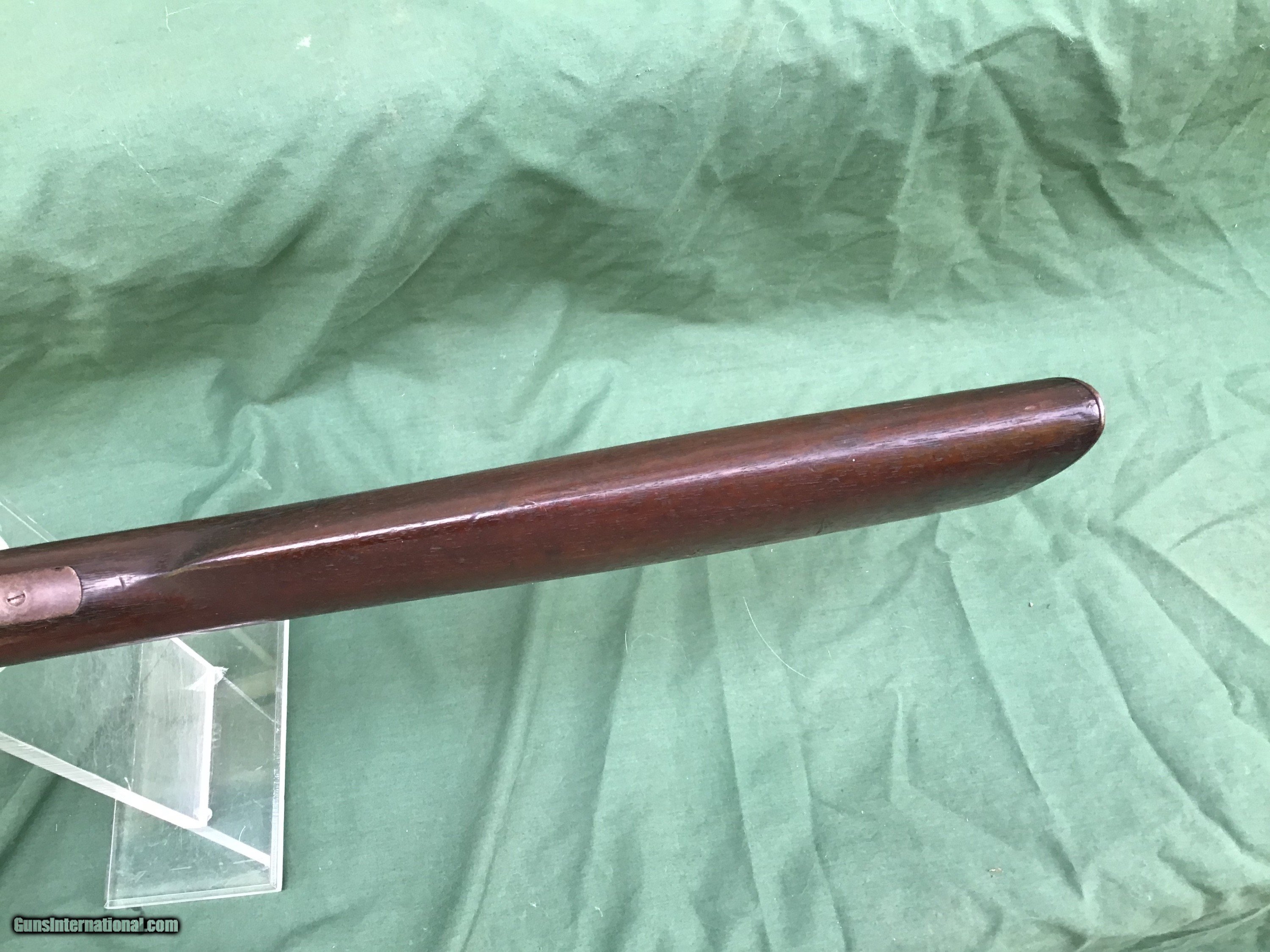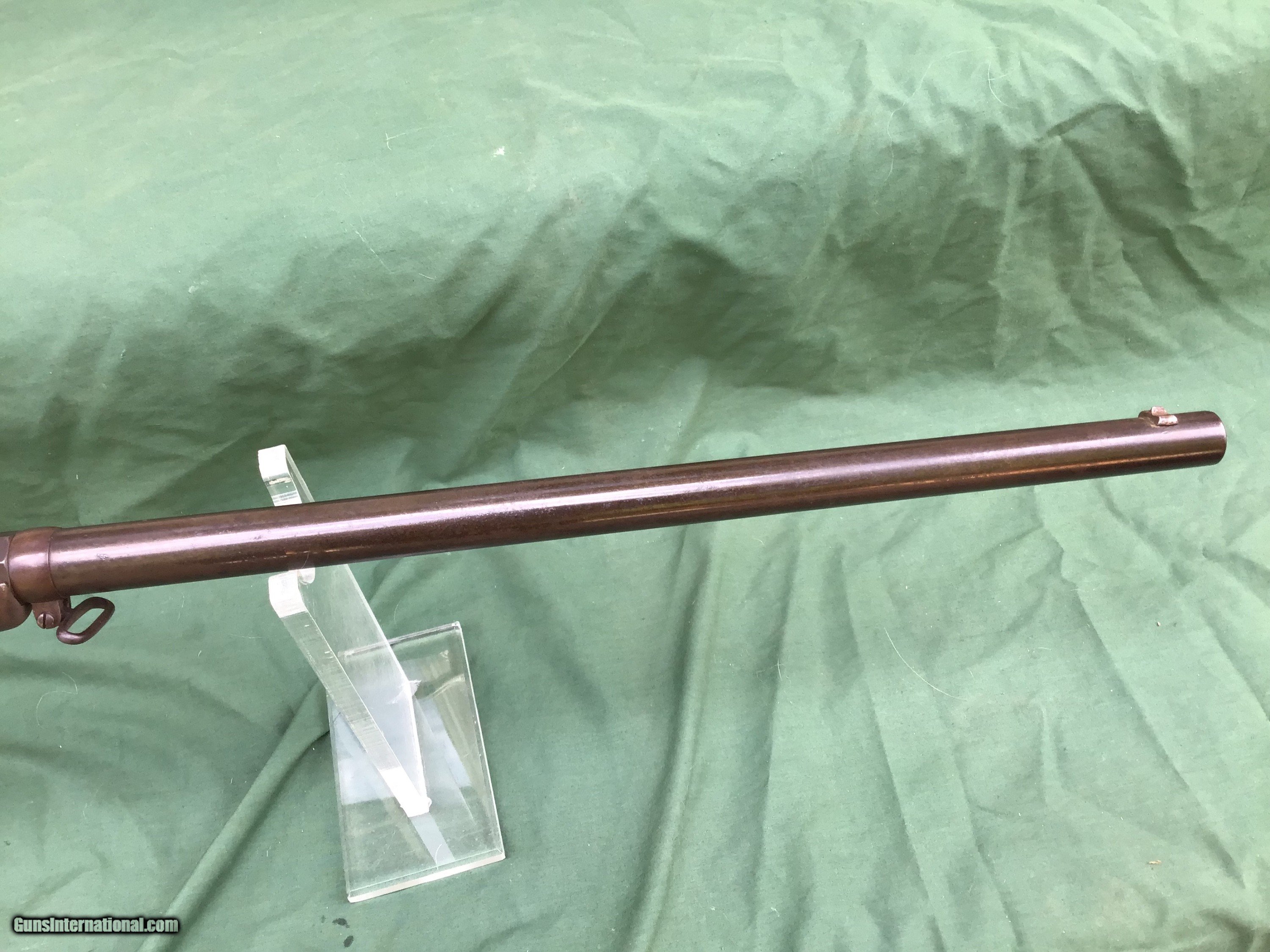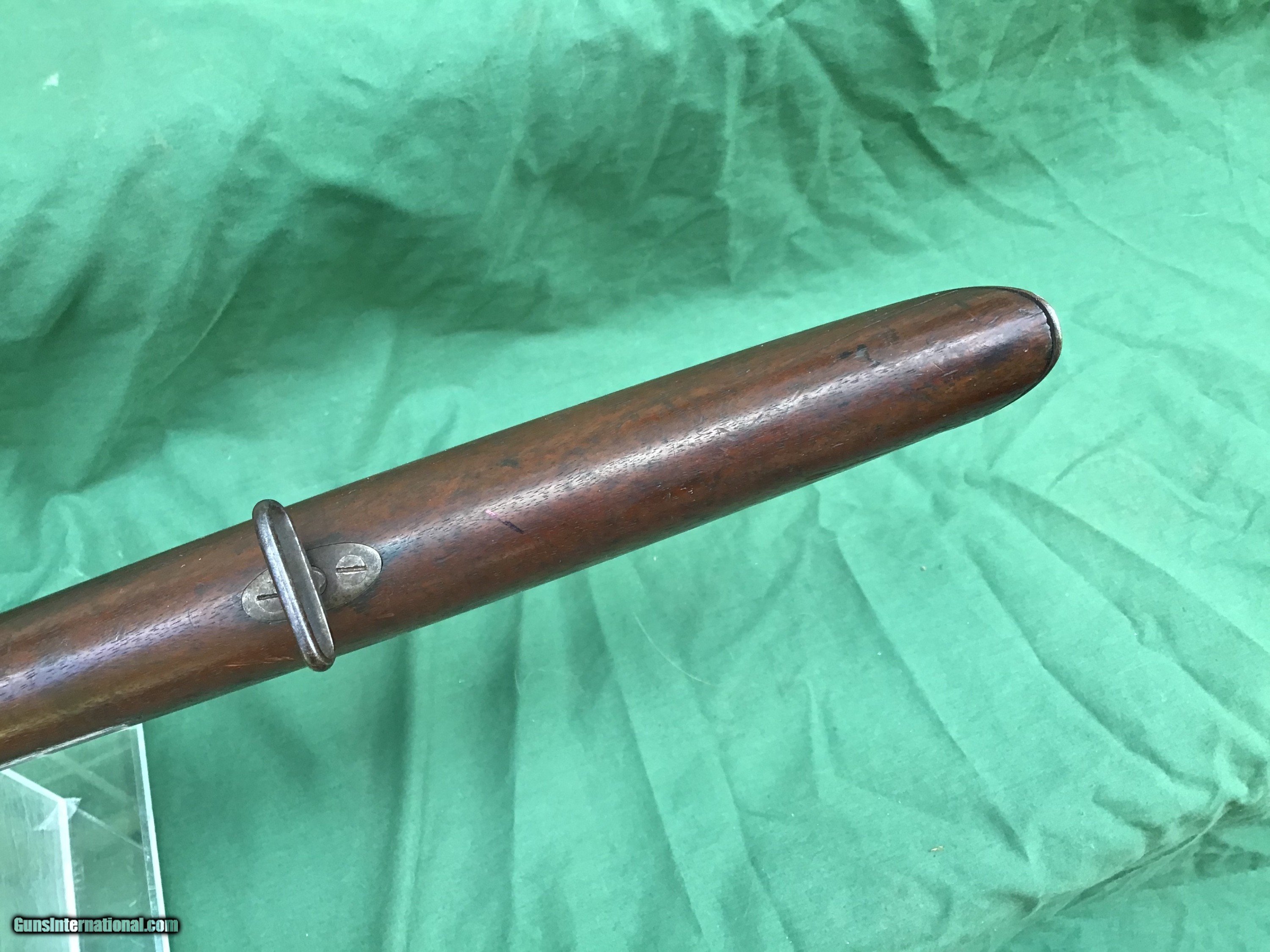 Description: This .41 caliber, drop breech, cartridge, single shot rifle has a part octagonal and part round 26" rifled barrel, marked on the top flat with “Allen & Wheelock, Allen’s Pat Sept 1860” The breech is opened by releasing a spring catch and lowering the trigger guard. The angled hammer head falls on the long firing pin which goes through the dropping breech block. This is the more desirable takedown version mark with the rare 1860 patent date. Very nice bore that I will rate a 7.5 on a scale from 1 to 10. This rifle has the low serial number 57 which is marked on lower tang and behind the sight. Action functions nicely. Rifle retains a smooth gray / brown patina. Both forend and buttstock are in good condition. Buttstock has small crack near the toe of buttplate (see pic). Buttplate has the trapdoor. This is a rarely seen rifle for sale and with the rare patent date, takedown feature, and low serial, this is a must have for the antique rifle collector. Antique and can be shipped directly to your doorsteps. Please feel free to ask questions. SOLD Antique: Yes |