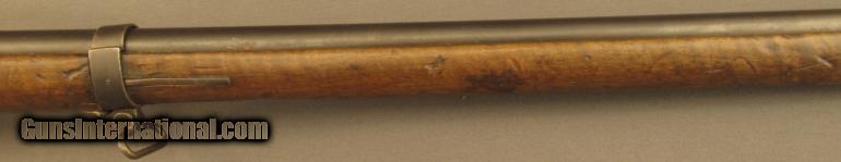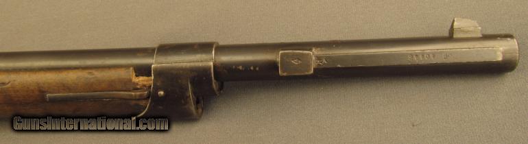 Description: Serial #A40446, 11mm Gras, 32 1/2" barrel with a fine, bright bore that has a small amount of freckling within the grooves. This is an 1875 dated rifle that has had the 1880 gas escape groove added to the receiver and retains about 80% of an armory re-applied blue finish that has left the markings and corners still crisp and sharp and exhibits a small amount of pitting towards the rear of the receiver around the guide screw. There is silvering and fading along the projections and bearing surfaces, mostly at the muzzle, while a dull gray patina with even brown freckling is present on the triggerguard and mixed number bolt. The mechanism is somewhat tight but fully functional and the walnut stock, numbered to a different gun on the right side of the butt, has numerous small handling marks and surface blemishes under the added varnish, and also has some small chips missing from the right side of the forend around and above the nosecap retention spring. There is no cleaning rod but the rifle is still a very good plus example of a French Gras. Antique SOLD Antique: Yes Manufacturer: French Model: 1874/80 Caliber Info: 11mm Gras Gauge Info: 11mm Gras |