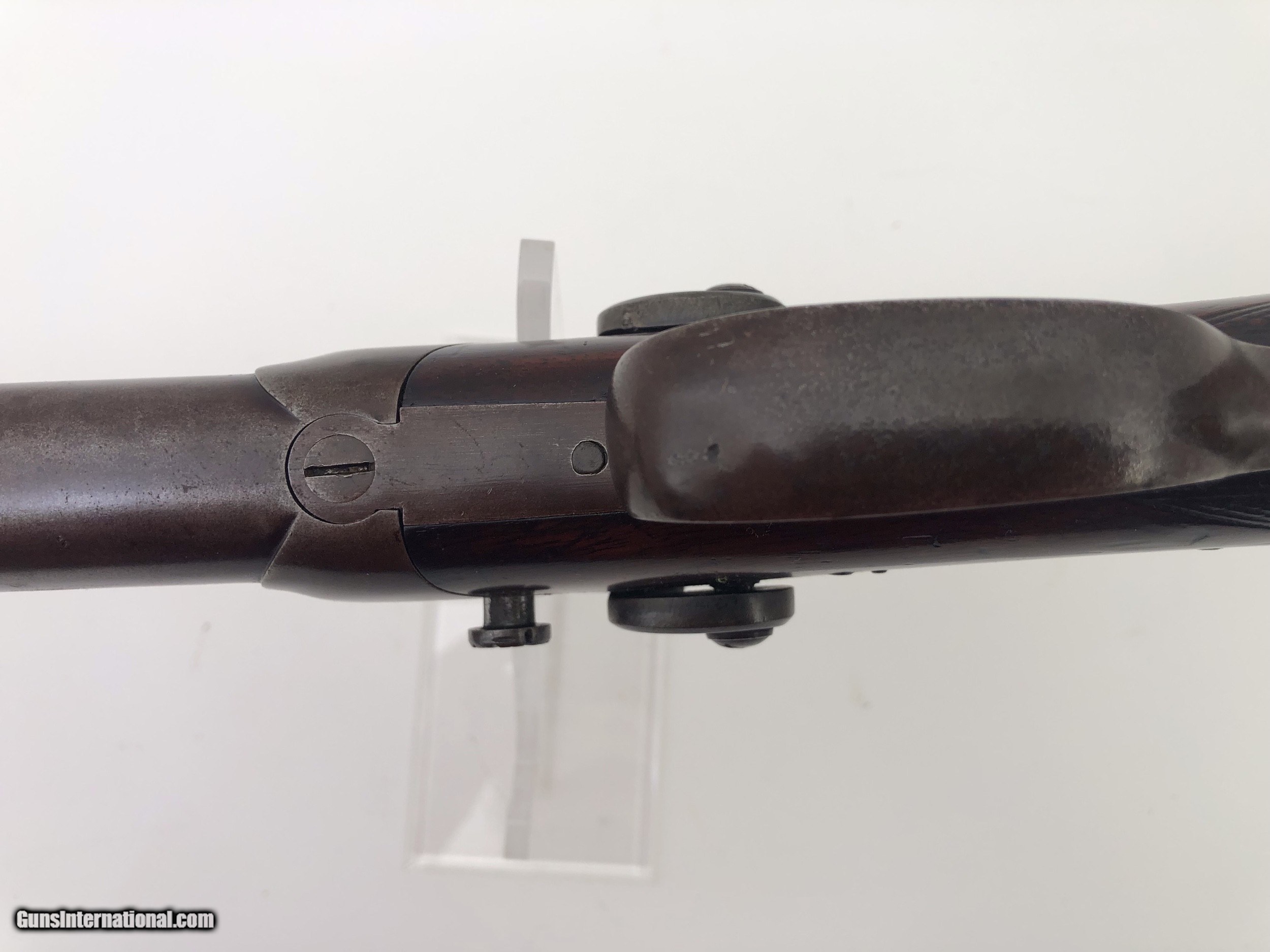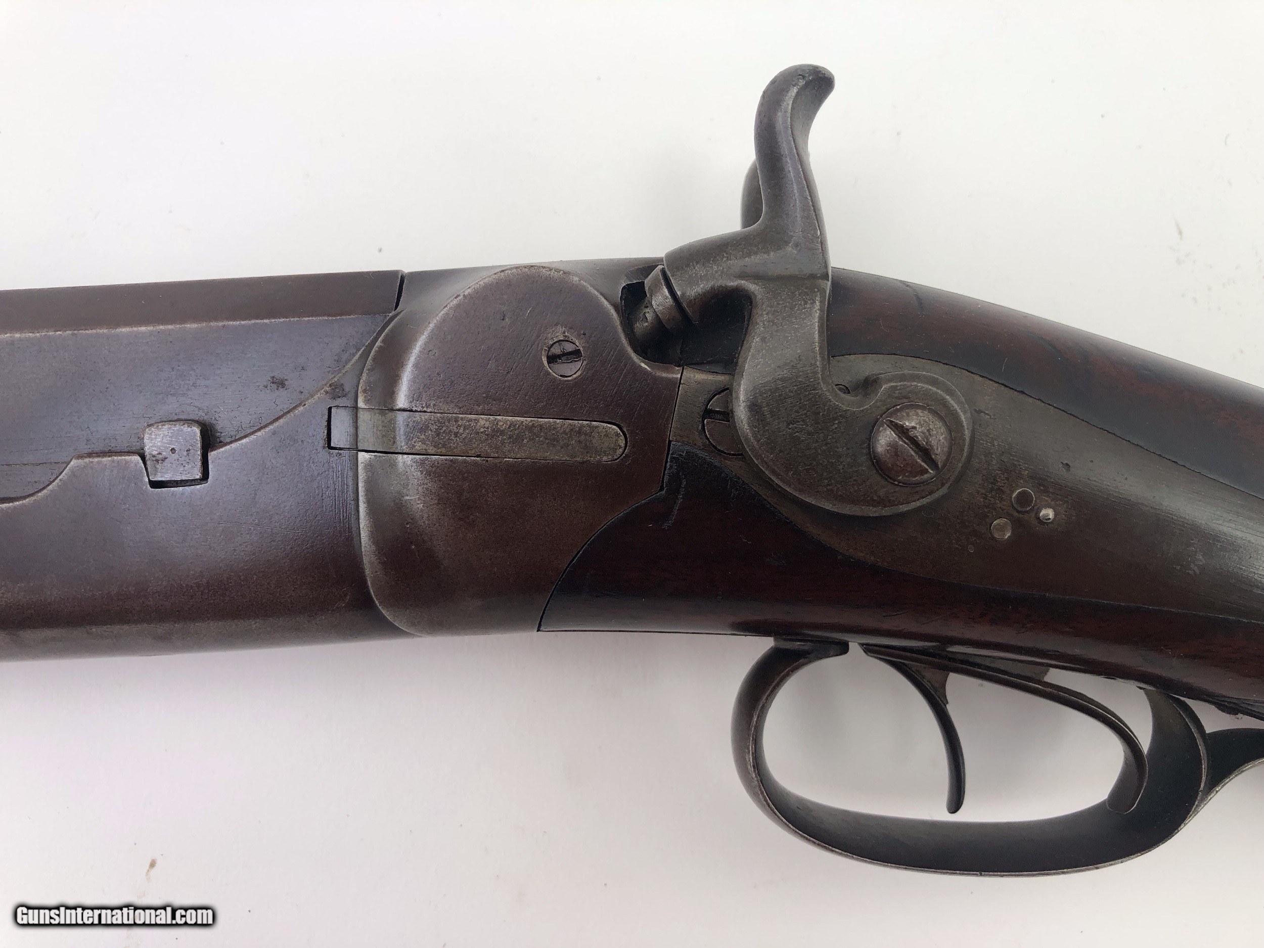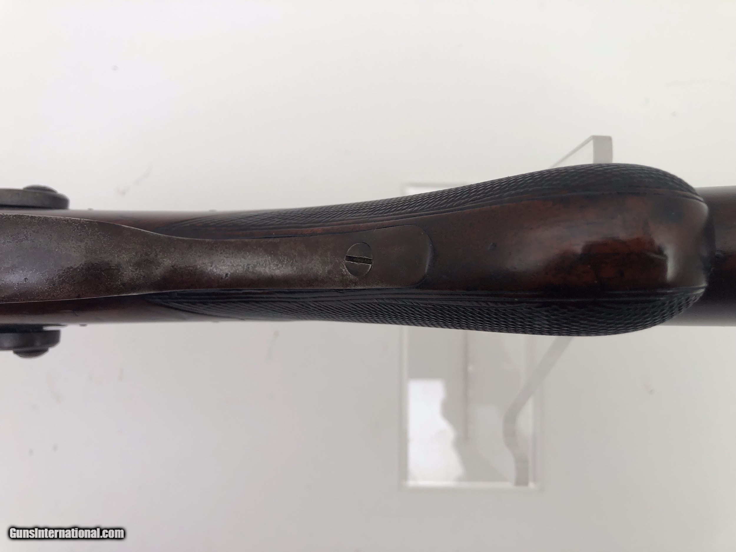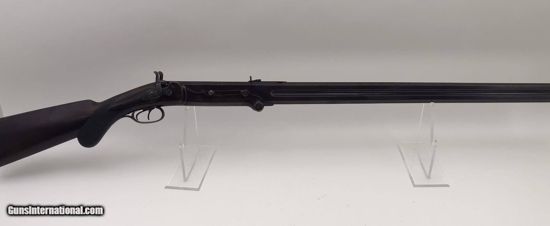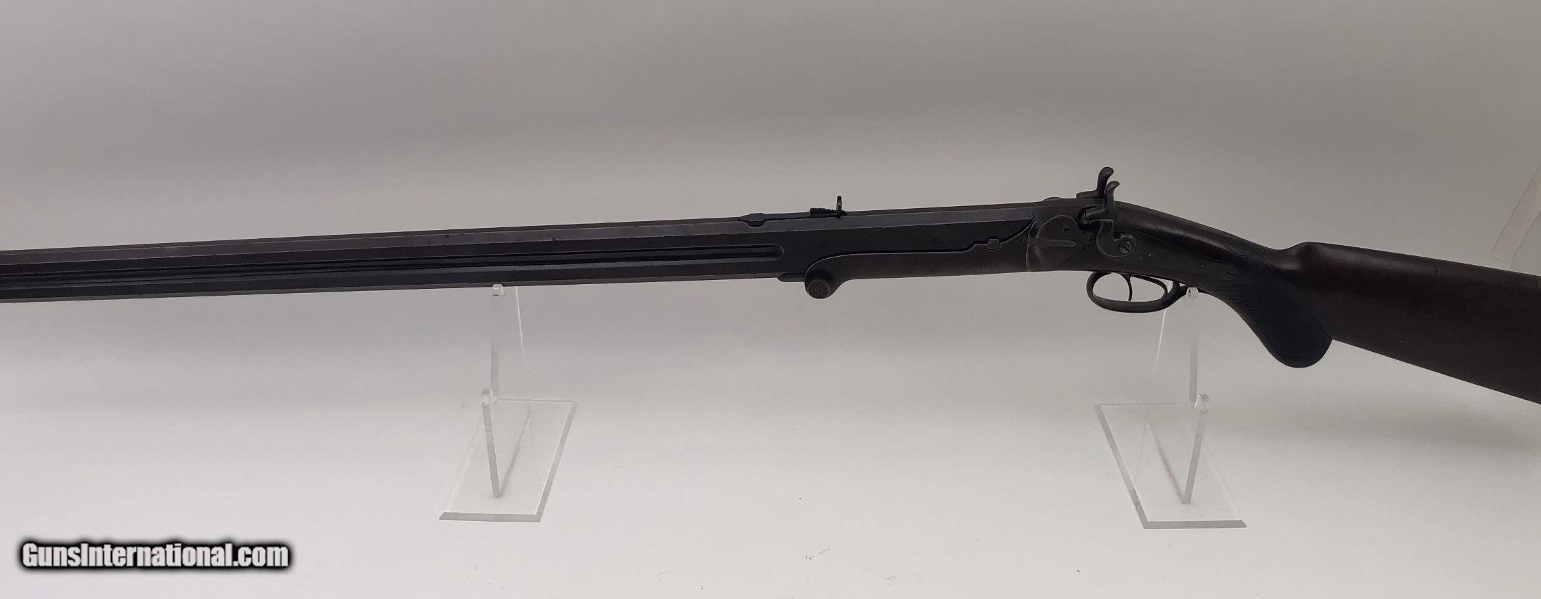 Description: Very unusual, possibly prototype over / under rifle shotgun combination gun. It has a tip down barrel, back action locks, and double exposed hammers. The wood stock has a checkered pistol grip and a rifle style butt plate. We have been unable to find any markings on the gun, or another like it. We feel it was built around 1880. It was once in the Frank Seller’s Collection, and was sold, after his death. Caliber: .40 Rifle / 16 Ga. Shotgun / Both Cartridge Overall Length: 49" Barrel Lengths: 32.1" Weight: Over 11.5 pounds Condition: Iron parts retain a high percentage of original blue finish with the balance turning brown – Stock is excellent with most of the original finish, and only minor nicks and bumps – Shotgun bore is brite and rifle bore a little rough – Action functions perfectly. SOLD Antique: Yes Manufacturer: unknown |