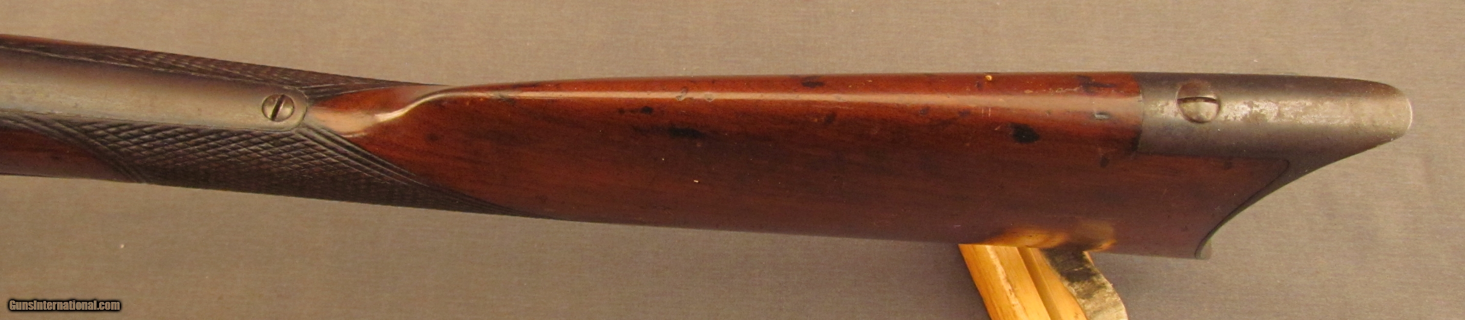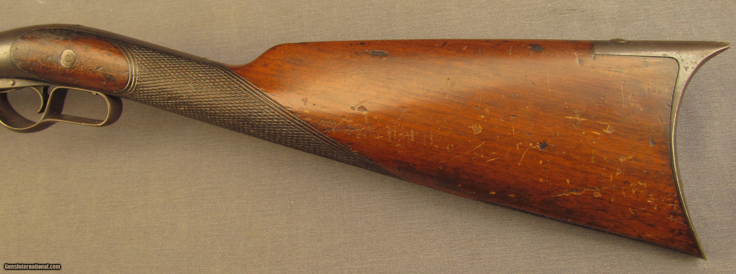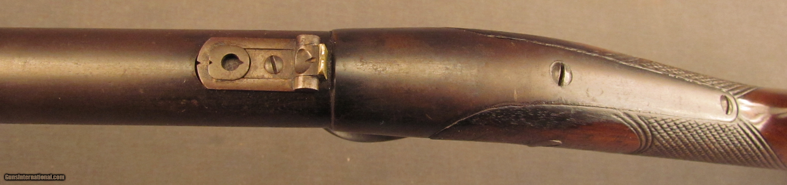 Description: Serial #1190, .44 RF, 24” barrel with a fine, bright bore that has some minor freckling within the grooves at the muzzle. This is a fairly scarce American rifle, less than 2,000 were ever made, and uses an underlever action operating a sliding breechblock. The metal has an overall dark plum-brown patina with scattered spots of mild surface freckling throughout and some traces of original blue on the frame. The checkered walnut stock is in fine shape with numerous small handling marks and minor surface blemishes scattered about the lightly flaked original varnish finish. The fragile action functions but the gun will not cock and fire. the rifle rates very good plus-fine condition overall. Antique SOLD Antique: Yes Manufacturer: Whitney Model: Thunderbolt Serial Number: 1190 Caliber Info: .44 cal Gauge Info: .44 cal |