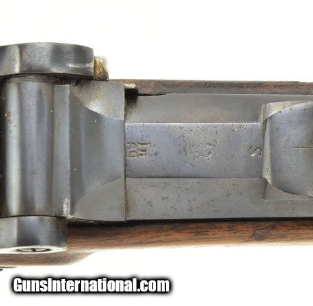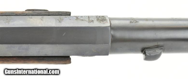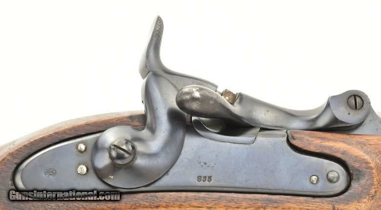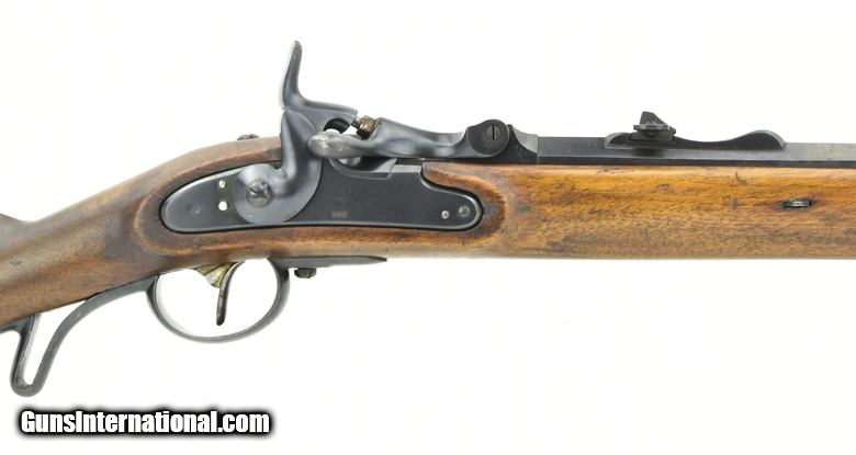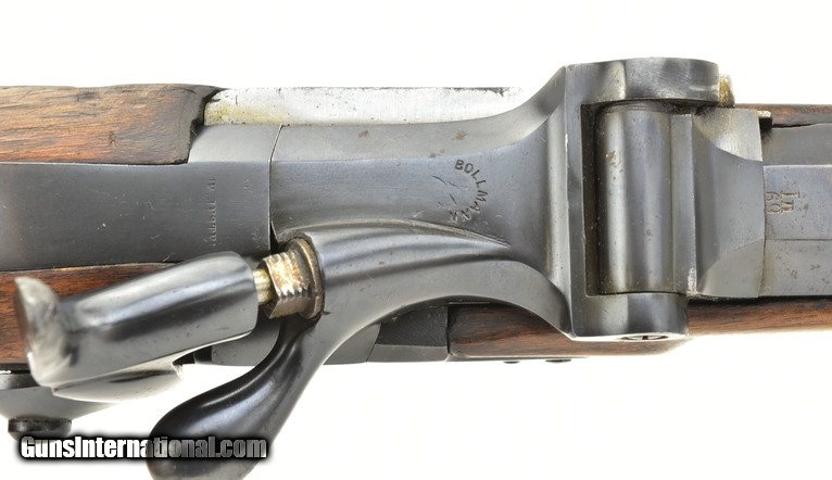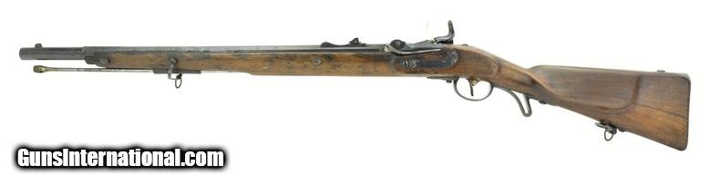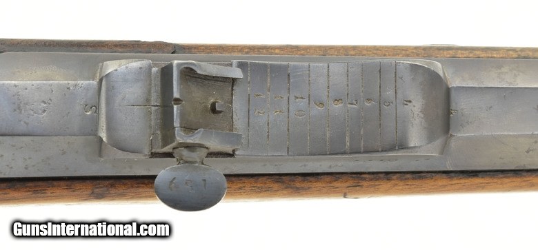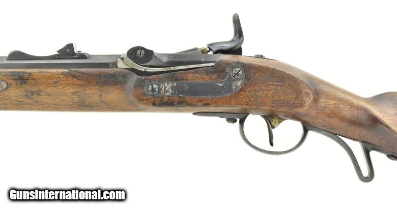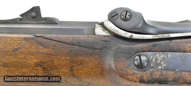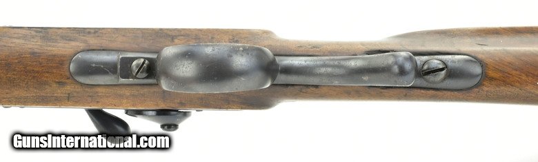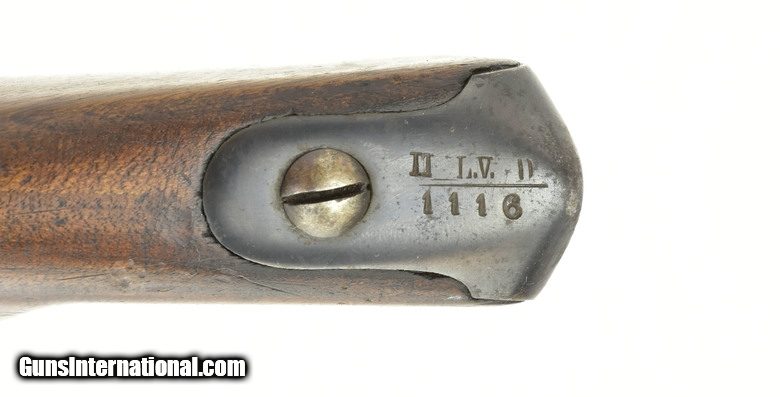 Description: Austrian Model 1854/67 Wänzl Jäger rifle. 25½” Octagon to round (the front 4¼”) rifled barrel with fine bore. Rifle fired the Austrian 14x33mm Rimfire cartridge. Metal has approximately 85% arsenal refinish blue. Left-side of the barrel has several area of light to moderate pitting from the muzzle to the rear sight. The nose cap is missing. Stock is very good, Has an approximately 3” crack from the forward lock screw to the rear sight area. Lock is dated “1855” (855). Action works correctly. Trapdooe is marked “Bollman”. There are two unit markings on the butt plate. This is an interesting early cartridge conversion Jäger rifle. SOLD Antique: Yes |