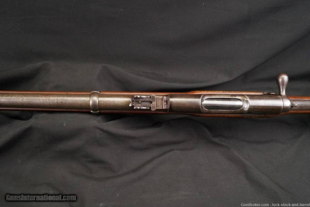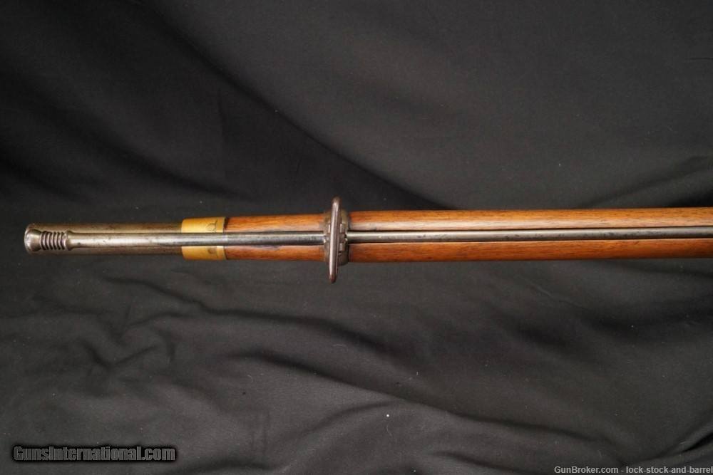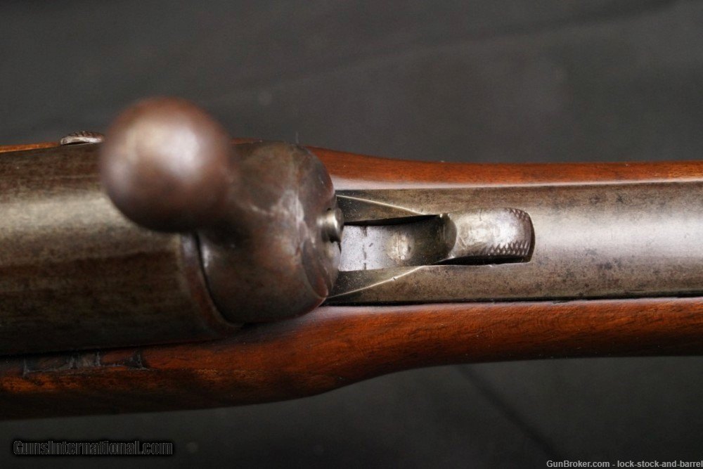 Description: Make: Brown Manufacturing Company Model: Brown-Merrill Rifle Serial#: NSN Year of Manufacture: Circa 1871-1873, Antique Caliber: .58 Caliber Berdan-primer Centerfire cartridges Action Type: Single-Shot Breech-Loaded Bolt-Action Rifle Markings: The bolt is marked “BROWN MFG. Co. NEWBURY PORT, MASS. / PATENTED OCT.17.1871”. The right side of the butt is marked with a crown above “B / S A / T” surround by “BIRMINGHAM /SMALL ARMS TRADE”. Barrel Length: Approximately 35” Sights/ Optics: There is a bayonet lug at the top of the muzzle which can be used for a front sight and a standard Enfield Pattern 1853 rear sight. Stock Configuration & Condition/ Grip: The stock is one-piece wood featuring a brass nose-cap, a slot in the forend for a ramrod, a total of three barrel bands (the forward barrel band has a sling swivel fixed to the bottom), a straight wrist, a straight comb and a brass butt-plate. The stock has some light handling marks, nicks and scuffs. Notably, the left and right sides of the forend, adjacent to the receiver, have been patch repaired. Also, there is a light nick behind the top tang. The LOP is 13.75” from the trigger to the rear of the butt-plate. The butt-plate has some light handling marks and is slightly tarnished. Overall, the stock is in Fine condition for an Antique. Type of Finish: Bright Finish Originality: Original Bore Condition: The bore is semi-bright with sharp rifling. There is some light erosion concentrated in the grooves. Overall Condition: The rifle retains about 10% of its metal finish. The brass parts of the rifle are moderately tarnished and have some light handling wear. The bright parts of the rifle are coated in light surface oxidation and it has taken a dull patina color. The gun has some light handling marks, nicks and scuffs. The markings remain clear. The screwheads are lightly tooled and remain serviceable. Overall, the rifle is in Fine condition for an Antique. Mechanics: The action functions correctly. We have not fired this rifle. As with all used firearms, a thorough cleaning may be necessary to meet your maintenance requirements. Box Paperwork and Accessories: None. Our Assessment: The Brown-Merrill Rifle was an early bolt-action design that was manufactured by Brown Manufacturing Company between 1869-1873 (originally the company was known as Ball & Williams). These rifles were not scratch built firearms, they were converted Enfield Pattern 1853 muzzleloaders that were given new actions. The Enfield Pattern 1853 had been imported in large numbers for use during the Civil War, thus there was no shortage of surplus Enfields. The gun’s patented action was designed by George Merrill, he was the Secretary of Brown Manufacturing Company. The gun had an action that was similar to the French Chassepot and Prussian Dreyse, and it was submitted to the U.S. Army’s 1872 trials held to find a new standard issue rifle. Unfortunately, the Brown-Merrill failed to impress the Army and the design was not adopted for service. Instead of selecting a number of innovative submissions (the Remington Rolling Block, Brown-Merrill and Peabody were all submitted), the government decided to adopt an in-house design, which was admittedly more cost effective, the Trapdoor Rifle, which was created at the State owned arsenal Springfield Armory by its Master Armorer, Erskine S. Allin. The United States would eventually end up adopting bolt-action rifle in the 1890s, the Krag-Jorgensen Rifle. The Brown-Merrill also failed to take off on the commercial market. In 1873 an economic downturn for the country led to Brown Manufacturing Co. going under. The assets of the firm were acquired by former Colt employee John Marlin, who used them to found Marlin Firearms Company. This particular specimen is surprisingly well preserved. The stock has only a few imperfections, and it retains a well defined British stamp which indicates the firm that sent the Enfield Pattern 1853 to the U.S. which was used to construct this gun. The gun has some light wear, but its action remains fully functional and it remains aesthetically pleasing. This is a great option for historical firearms collectors. SOLD Antique: Yes Rifle Caliber: .58 |