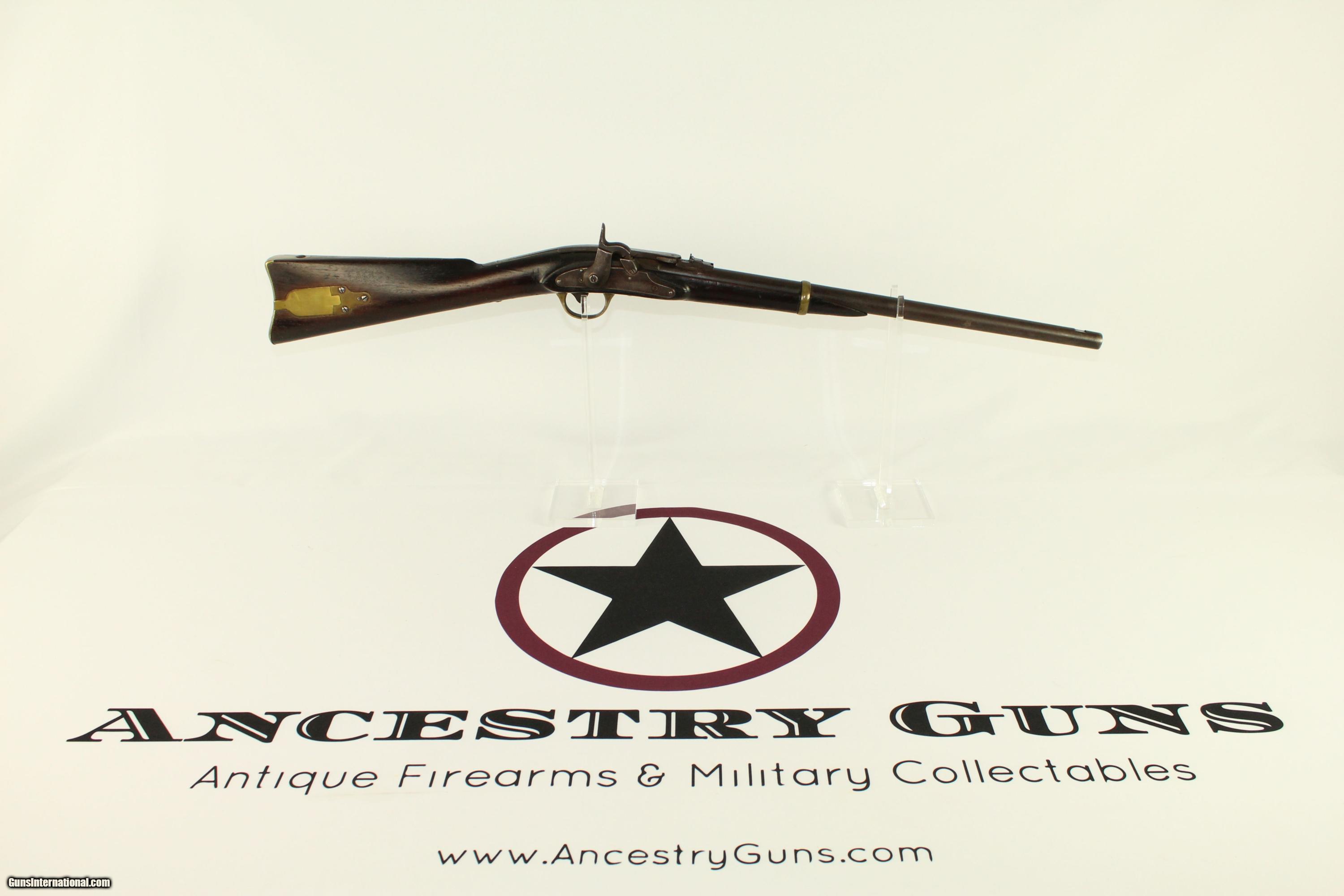 Description: Antique Civil War Merrill Saddle Ring Cavalry Carbine Much Used U.S. Cavalry Carbine Here we present an antique Merrill First Type Saddle Ring Carbine from the American Civil War. These were made by the company of H. Merrill in Baltimore, Maryland in the 1860s, with a total production of 14,500. These carbines are known to have been allocated to the following cavalry regiments: NY 1st, 5th and 18th; Pennsylvania 11th, 17th, and 18th; NJ 1st; Indiana 7th; Wisconsin 1st and 3rd; Kentucky 27th; and finally the Delaware 1st. This specimen is in very good condition. The stock is very nice and shows a bit of handling but is smooth, sound and well kept. Barrel, lock and saddle ring bar have an even dark patina. Front sight not present. Serial numbers match. Bore is in good condition. Action is very good. Own the original! This is a legitimate antique and not a reproduction. Barrel is round and 22 inches in length. Caliber: .54 percussion Bore good condition and the mechanism in in very good condition. Overall condition as seen in photos. Make this famous Civil War carbine a part of your collection and display it in a place of prominence. Very Fast. Very Safe. FREE SHIPPING WORLDWIDE. Delivered directly to your door by express mail! Guaranteed AUTHENTIC & Includes CERTIFICATE OF AUTHENTICITY. ancestryguns $2500 #10308 SOLD Antique: Yes |