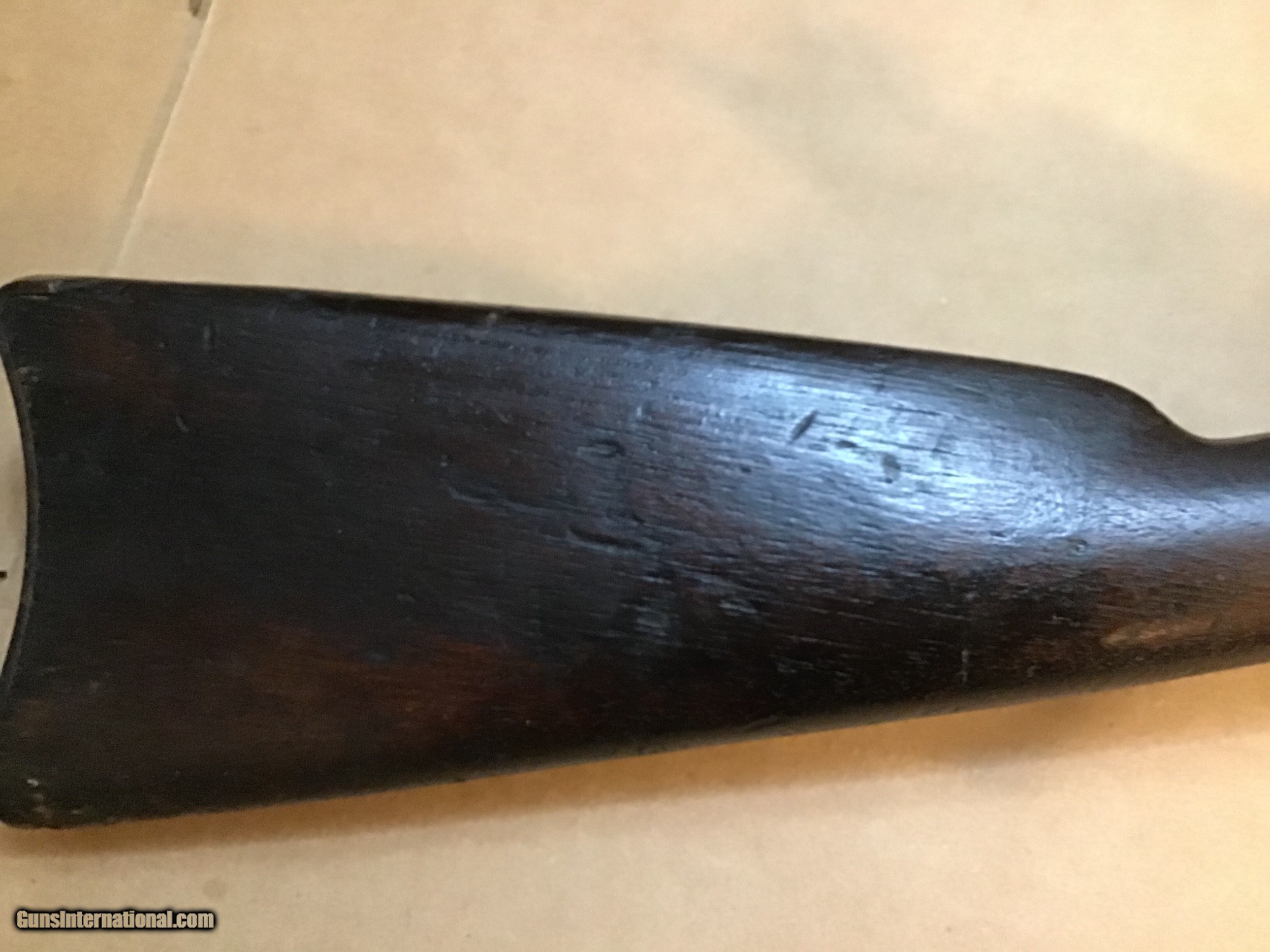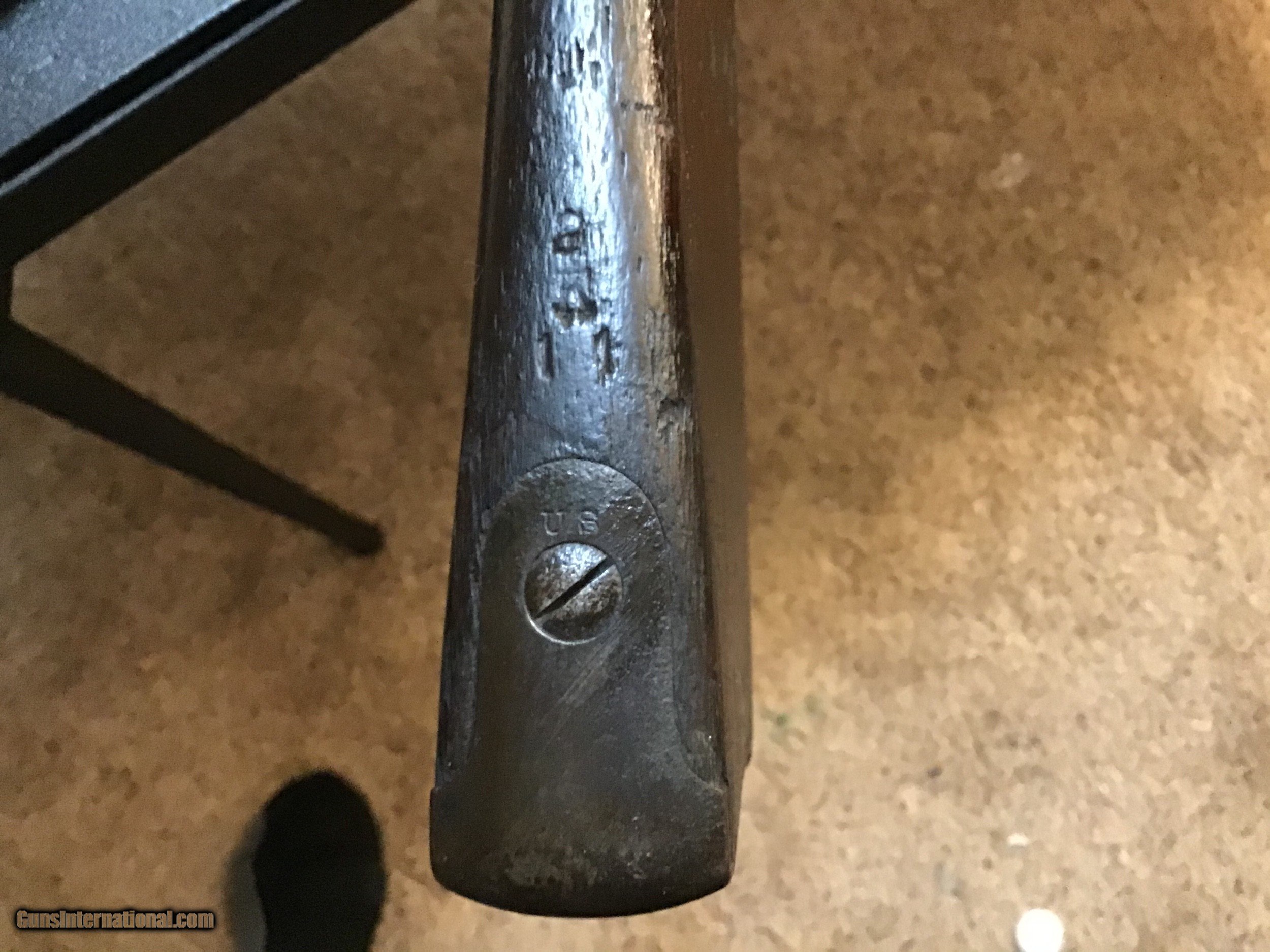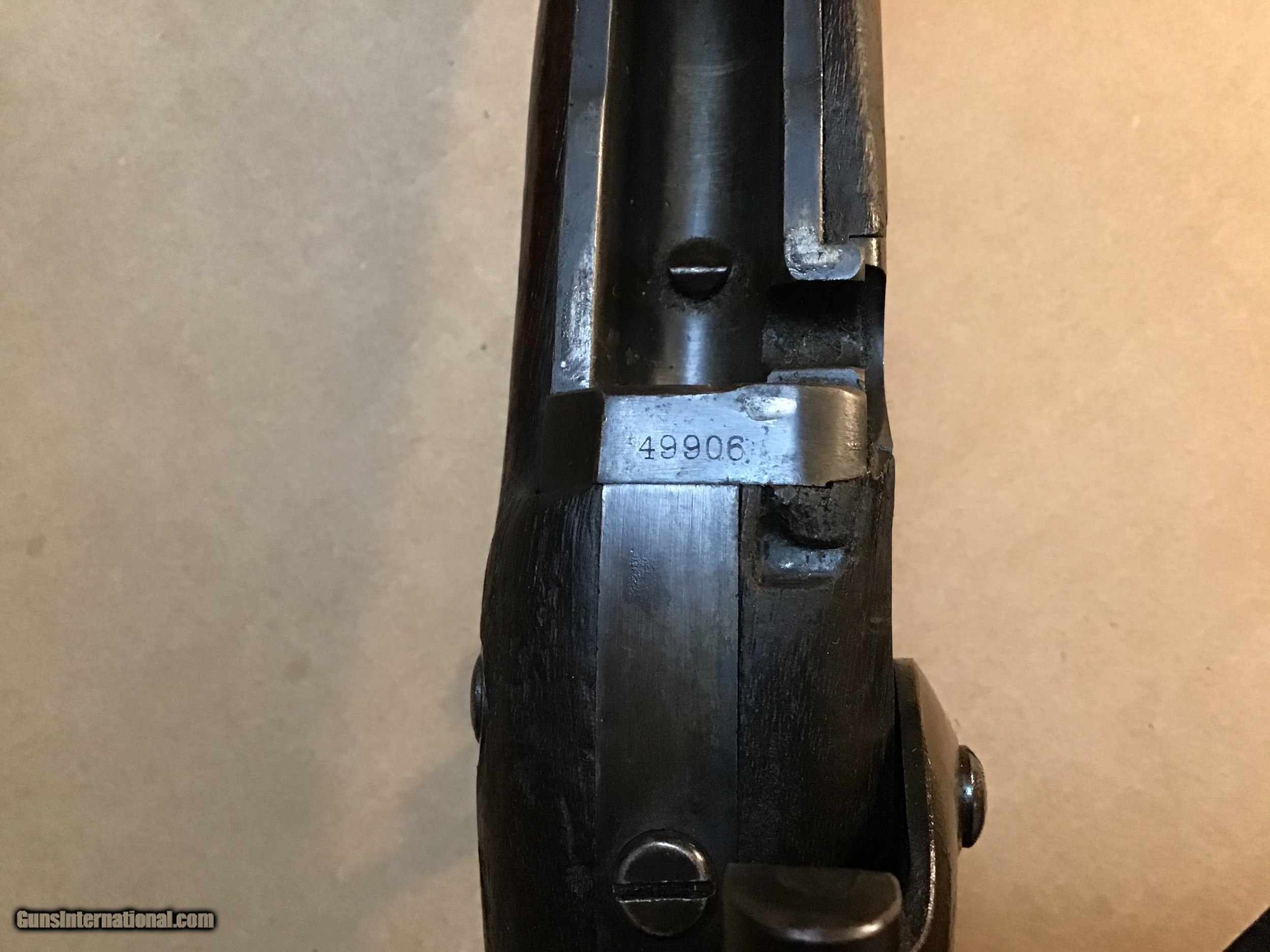 Description: Antique early Indian wars Long wrist US Model 1873 Springfield 45-70 caliber army rifle. Full 2 band very dark walnut stock has numerous dents and dings has seen a lot of service with faint but present ESA and circle P cartouches and a unit and rack number present near the but plate. The full length stock has the correct front and early 1873 rifle leaf rear site held by slotless screws. The 2 click lock is marked US Springfield 1873 with the American eagle and functions fine. The tight breach block is marked model 1873 US with the eagle head and crossed arrows. The metal parts original finish has turned dark brown. A good original early Springfield complete with sling swivels and original cleaning rod. Please feel free to contact me with any questions. Shipping will be actual cost by usps priority insured mail with tracking. SOLD Antique: Yes Manufacturer: US Springfield Model: 1873 Serial Number: 49906 |