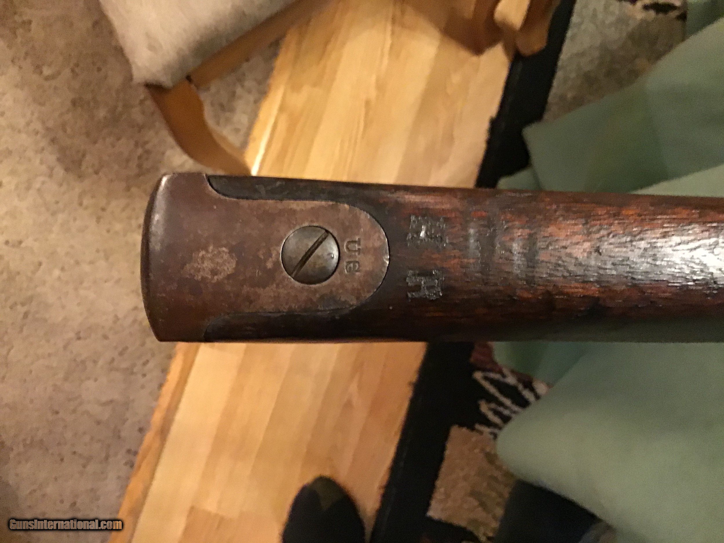 Description: On Hold Sale Pending .Early Indian wars Springfield model 1873 Trapdoor 45-70 caliber army rifle. This rifle appears to have all the correct features of a early long wrist Model 1873 army rifle. The functioning lock is marked US Springfield 1873 with the American eagle and 2 click tumbler. The full length 2 band dark walnut stock is in very good condition and both ESA cartouche and circle P fireing cartouche showing normal wear. The full length 32" barrel has front and correct first model rear sight held by slottless screws. The correct tight high arch breach block is marked US Model 1873 with the eagle head has a strong extraction system and the spring in the firing pin. The bore is bright with good rifling. The metal parts have most of there smooth blue original finish starting to turn brown and thin in places. The gun is complete and I believe correct with both sling swivels and original cleaning rod. Overall a very good to fine original early long wrist trapdoor rifle which functions well. Please feel free to contact me with any questions. Shipping will be actual cost by usps insured priority mail with tracking. On Hold Sale Pending SOLD Antique: Yes Manufacturer: US Springfield Model: 1873 Serial Number: 68,804 Barrel Length: 32 Condition: Very good Metal Condition: Very Good Wood Condition: Very Good Bore Condition: Very Good |