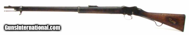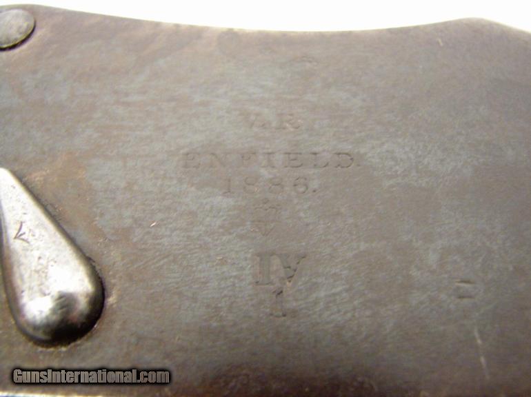 Description: Enfield .577-450 Martini Henry long lever Infantry rifle. Mark IV. Bore has very good rifling and dark in the grooves. Gun has a blue-brown patina. Action works perfectly. Stock is good with numerous nicks and dings from British Empire Service. Frame has a crown VR cypher and is dated 1886.