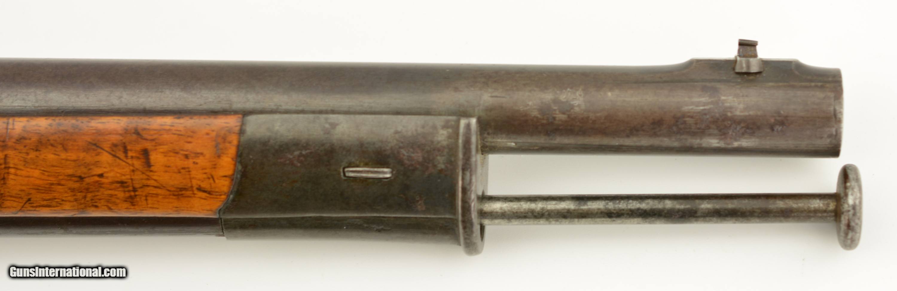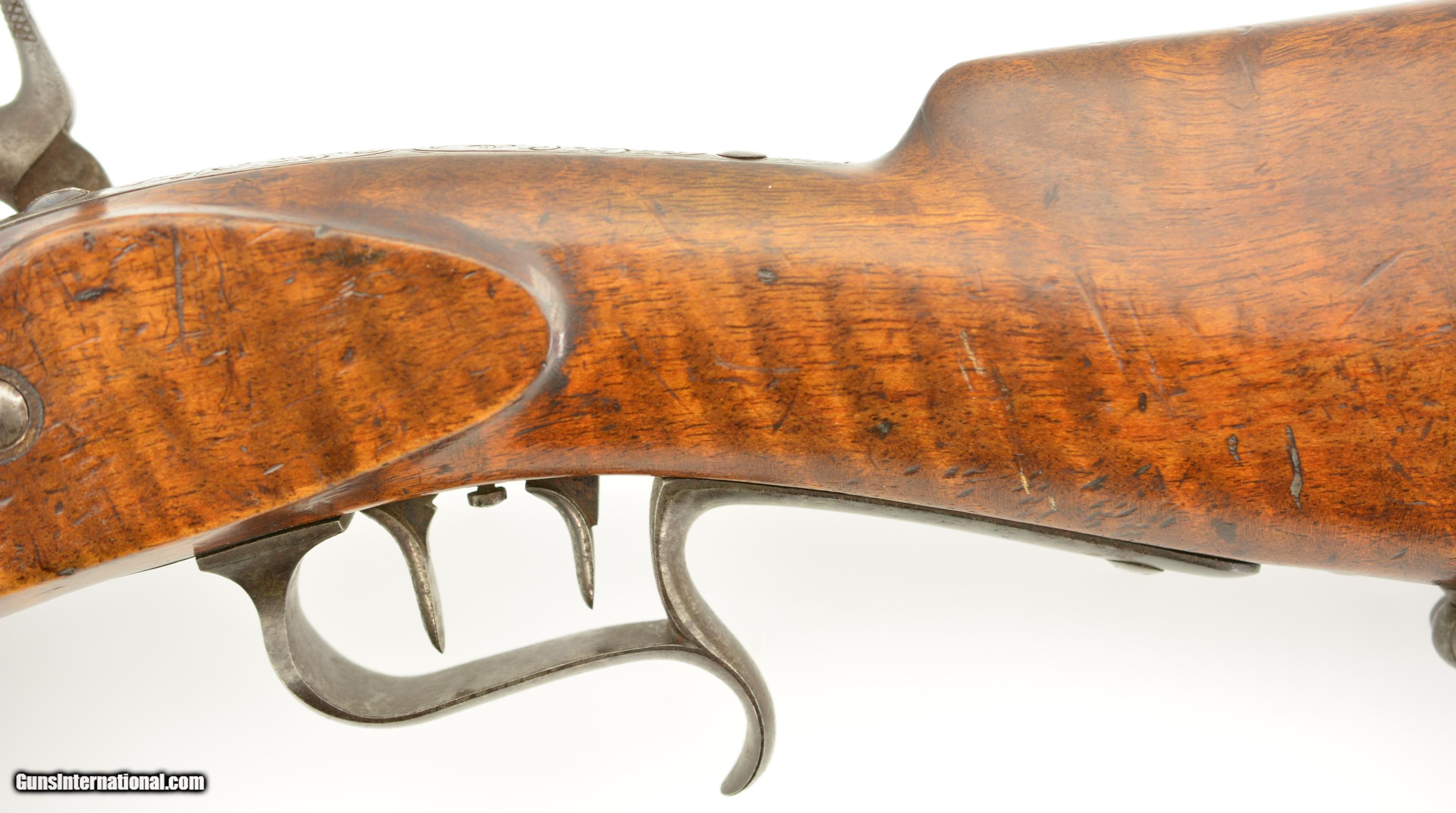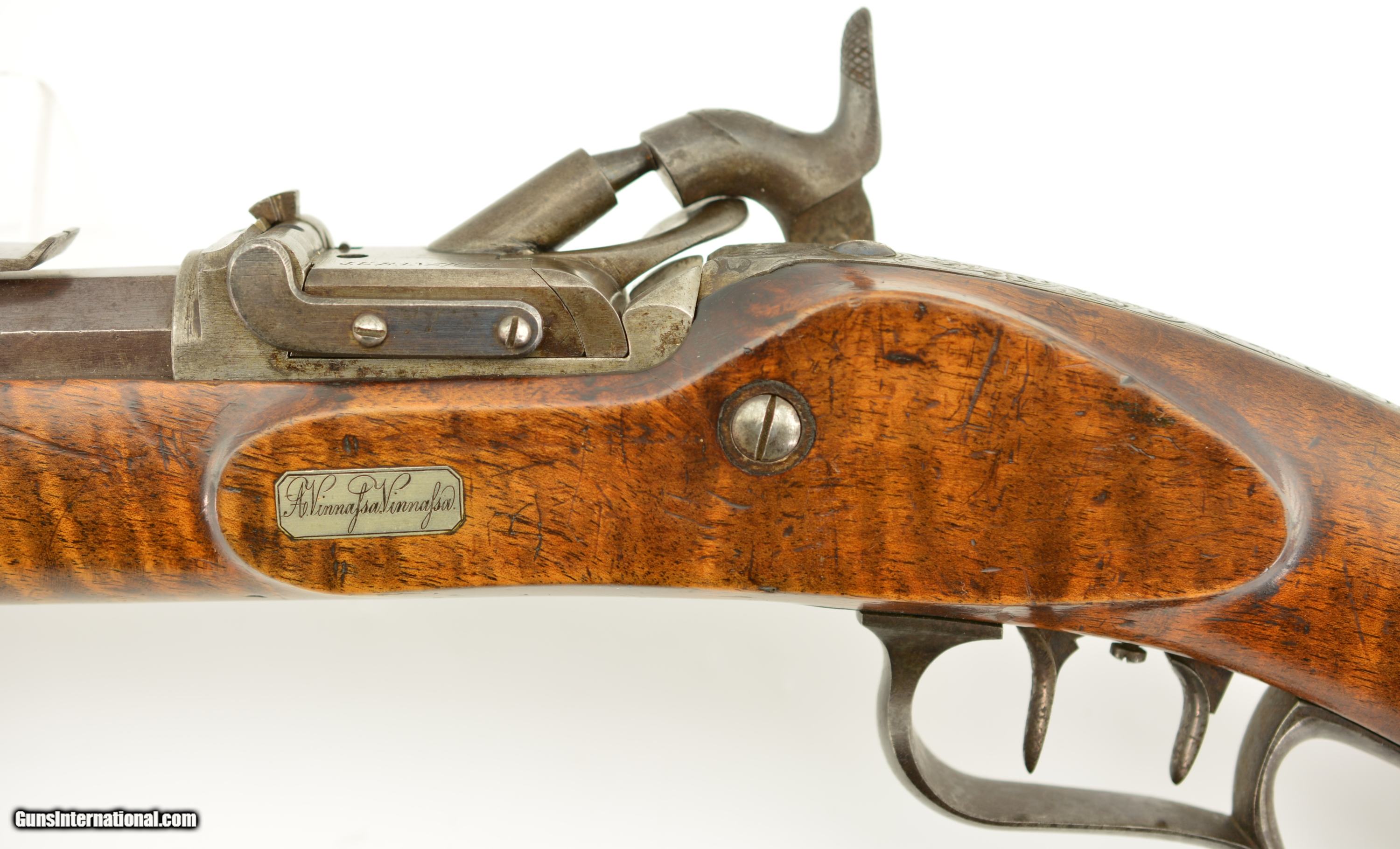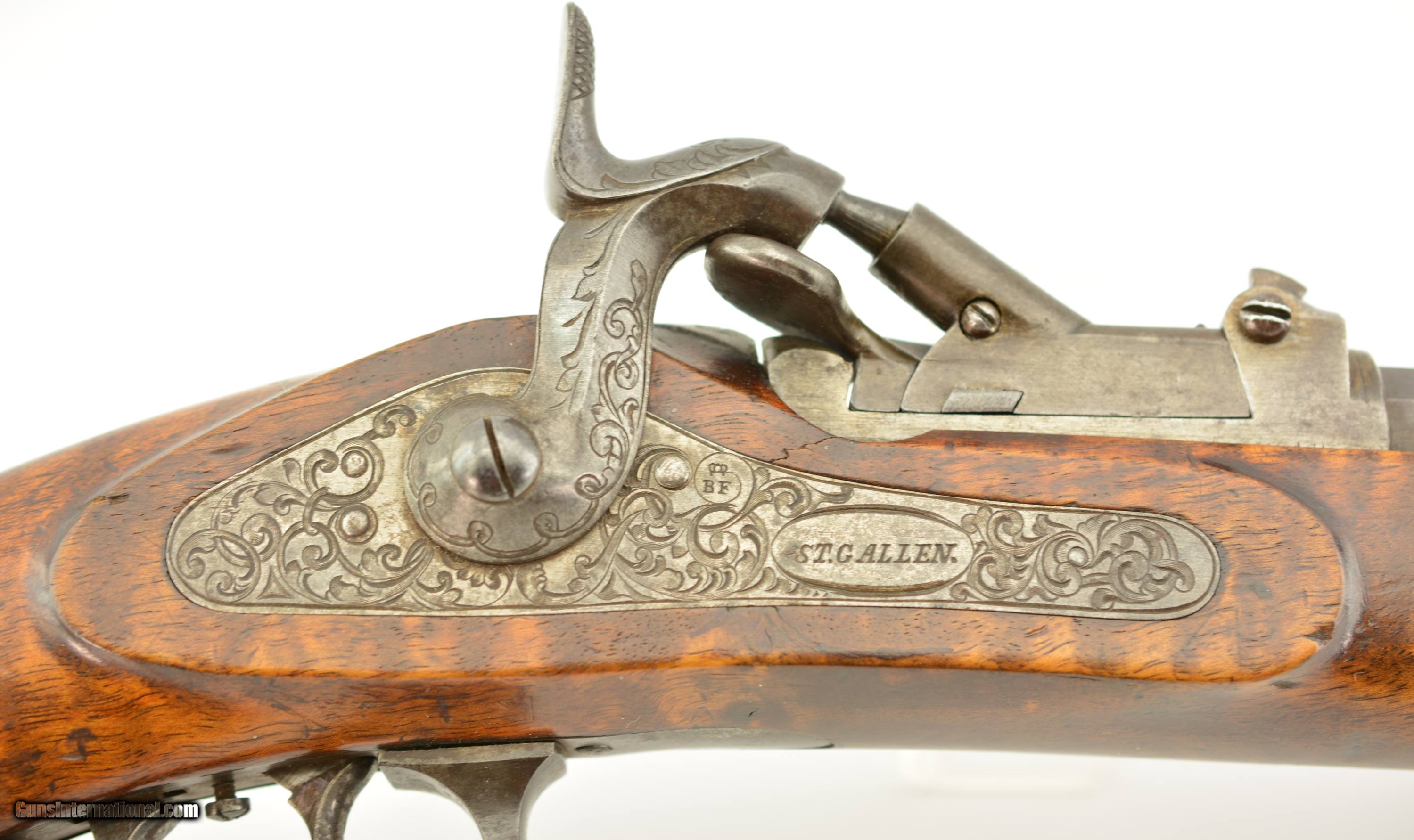 Description: NSN, .41 Swiss RF, 30" barrel with an excellent, bright bore. This is a handsome military pattern, commercial "scharfschutzen" rifle with double-set triggers, that has an extensively engraved, "ST. GALLEN" marked lock, "J.U. BANZIGER" on the breech-block, and a small engraved escutcheon opposite the lock that reads, "A. Vinnassa-Vinnassa" (probably the name of the original owner of the rifle). The "2"-marked barrel has traces of original blue remaining, with the balance turned to a smooth plum-brown patina with some silvering at the muzzle, as well as some minor freckling towards the breech end, and some small spots of pinprick pitting around the typical Swiss rear sight (a somewhat delicate, sporting/target front sight is also fitted that appears original to the rifle). The lock and hammer have a similar, but slightly more grayer patina, while the receiver has a mottled gray color with some of the original fire blue remaining on the hinge arm on the left side. The wedge-fastened stock has visible "tiger stripe" grain, with numerous small handling marks and blemishes throughout the added varnish finish, as well as a short crack at the top of the lockplate, just ahead of the hammer. The stock furniture and correct, button-headed ramrod have a matching plum-brown patina, and the action is fully functional. This is a very nice example of a high grade Milbank-Amsler Stutzer, and would make a great addition to any collection. Antique SOLD |