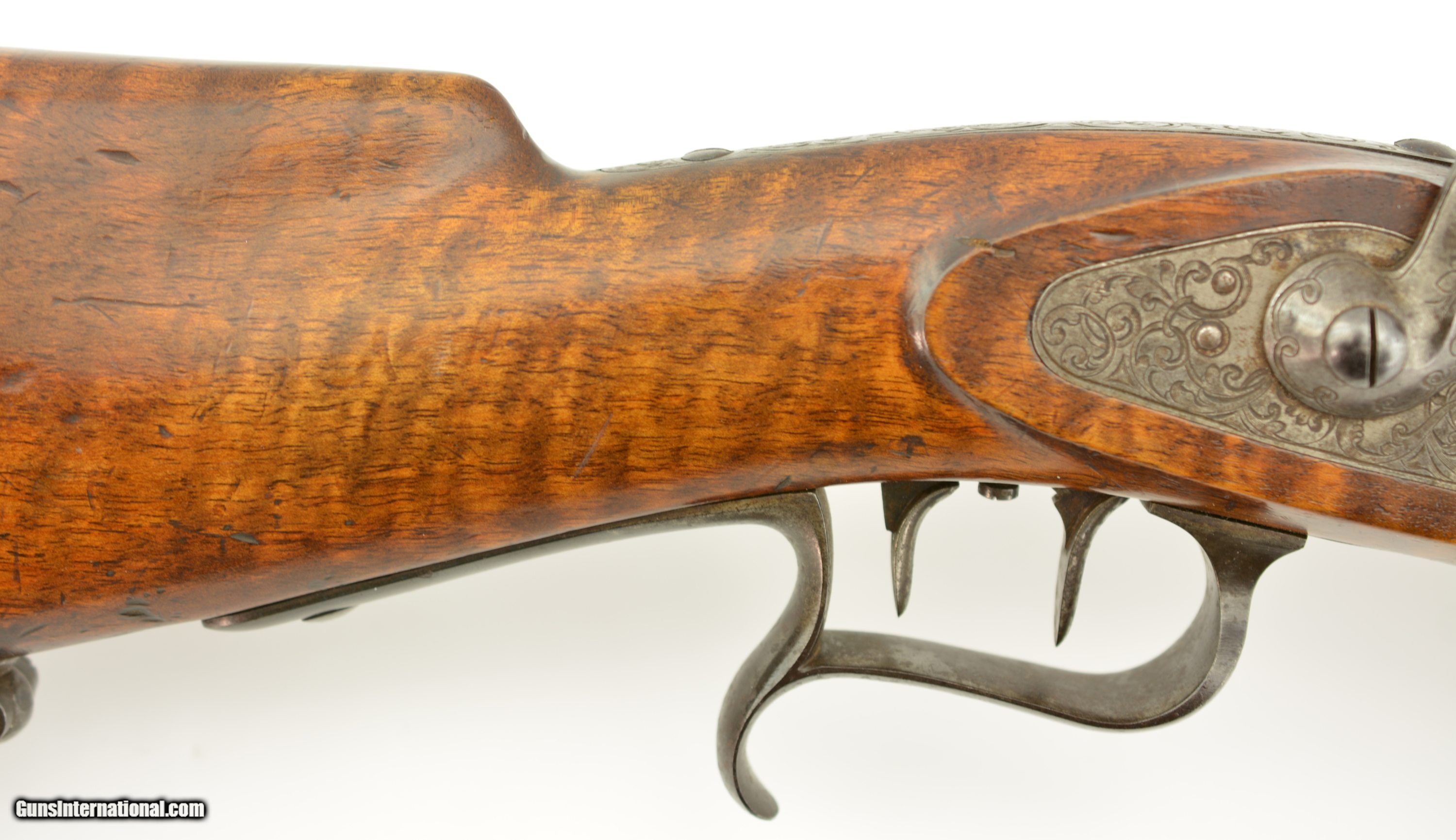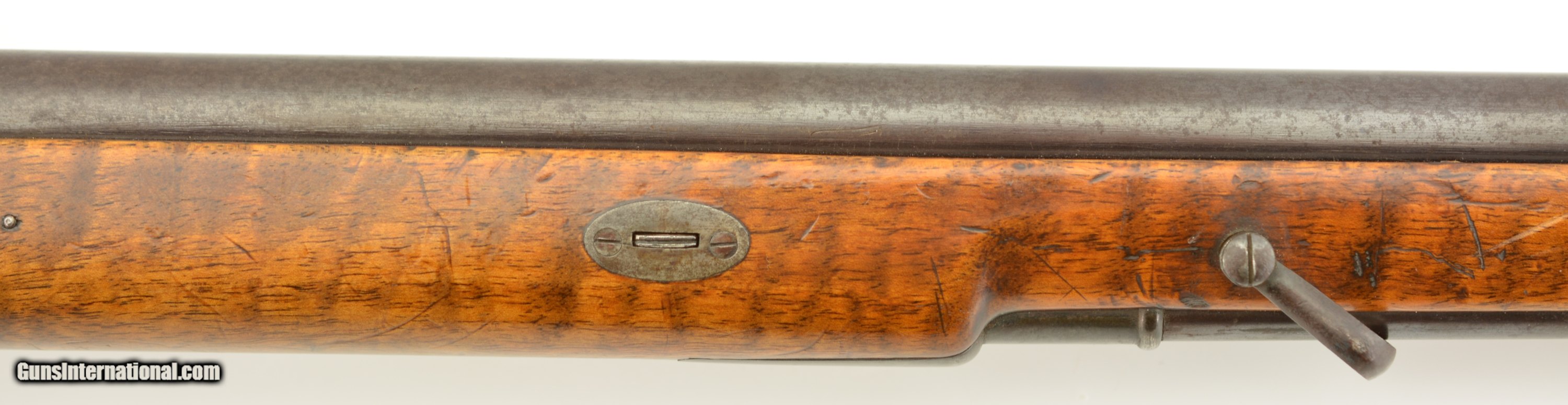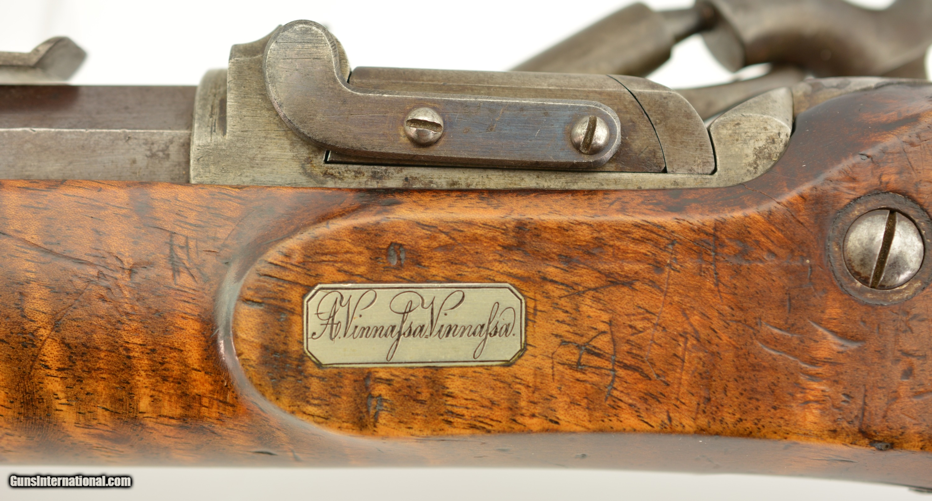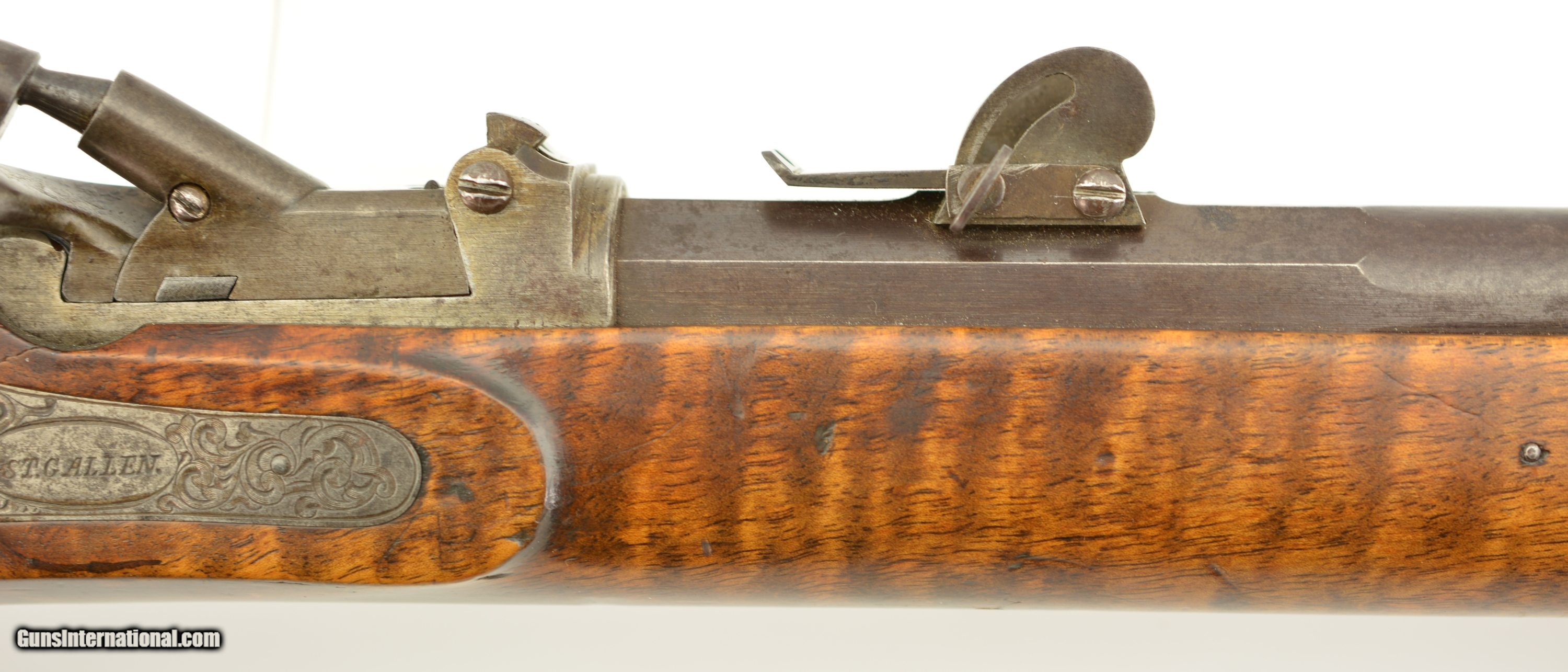 Description: NSN, .41 Swiss RF, 30" barrel with an excellent, bright bore. This is a handsome military pattern, commercial "scharfschutzen" rifle with double-set triggers, that has an extensively engraved, "ST. GALLEN" marked lock, "J.U. BANZIGER" on the breech-block, and a small engraved escutcheon opposite the lock that reads, "A. Vinnassa-Vinnassa" (probably the name of the original owner of the rifle). The "2"-marked barrel has traces of original blue remaining, with the balance turned to a smooth plum-brown patina with some silvering at the muzzle, as well as some minor freckling towards the breech end, and some small spots of pinprick pitting around the typical Swiss rear sight (a somewhat delicate, sporting/target front sight is also fitted that appears original to the rifle). The lock and hammer have a similar, but slightly more grayer patina, while the receiver has a mottled gray color with some of the original fire blue remaining on the hinge arm on the left side. The wedge-fastened stock has visible "tiger stripe" grain, with numerous small handling marks and blemishes throughout the added varnish finish, as well as a short crack at the top of the lockplate, just ahead of the hammer. The stock furniture and correct, button-headed ramrod have a matching plum-brown patina, and the action is fully functional. This is a very nice example of a high grade Milbank-Amsler Stutzer, and would make a great addition to any collection. Antique SOLD |