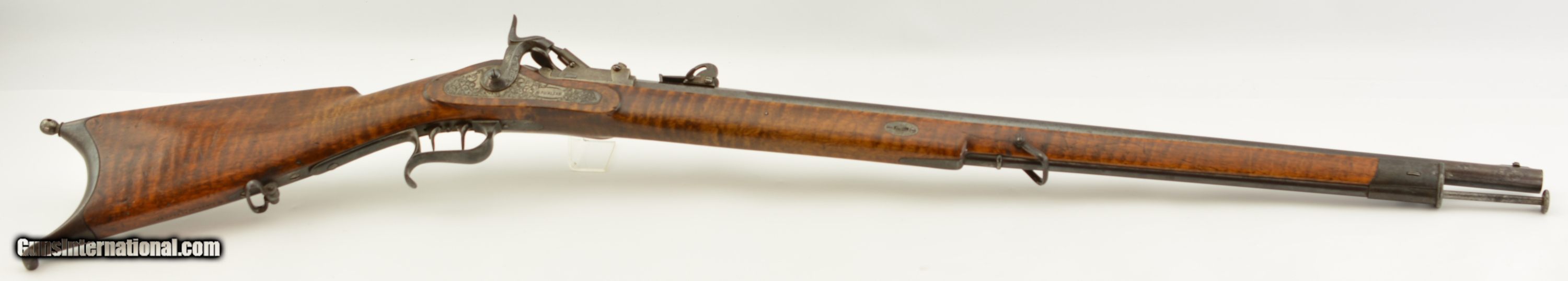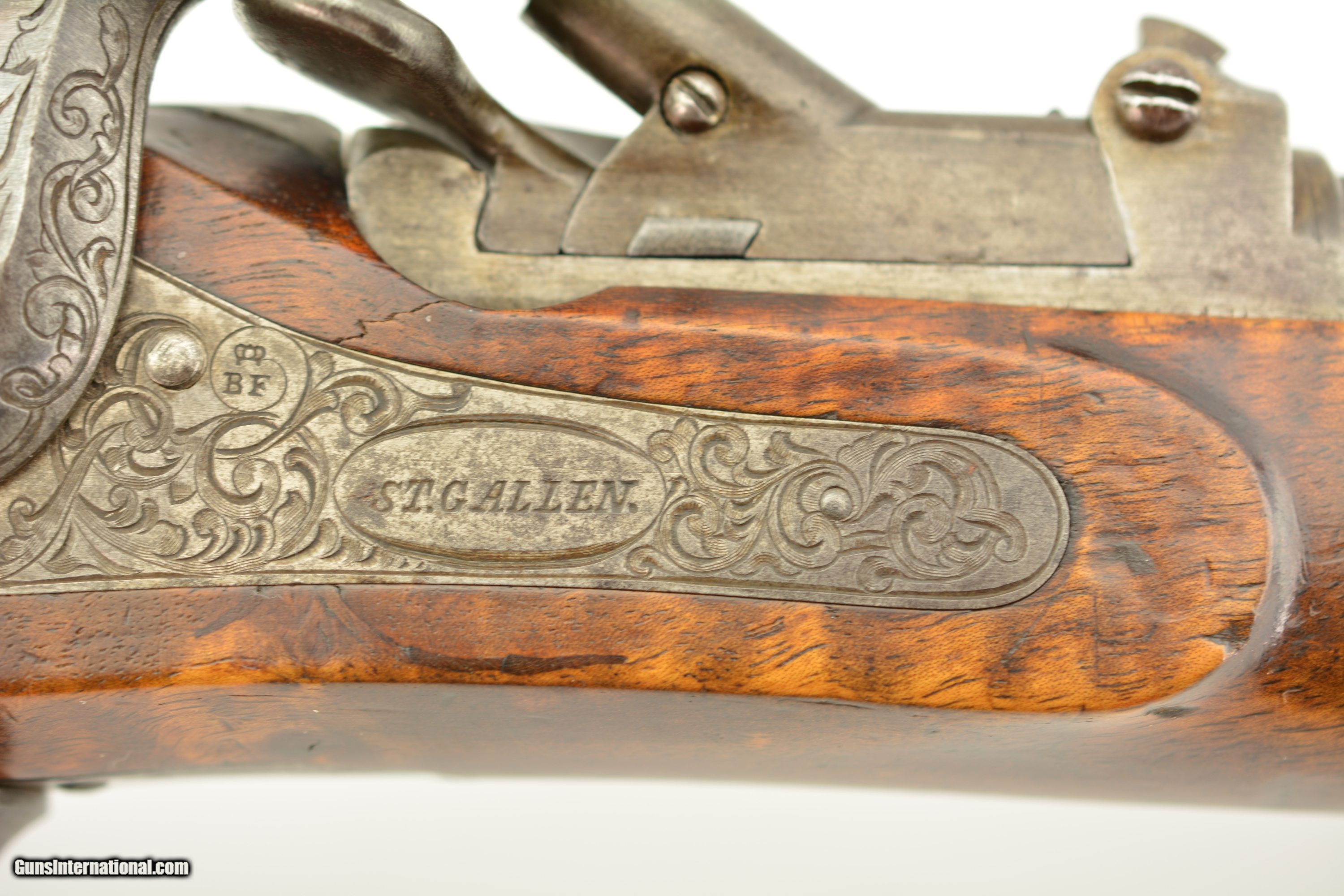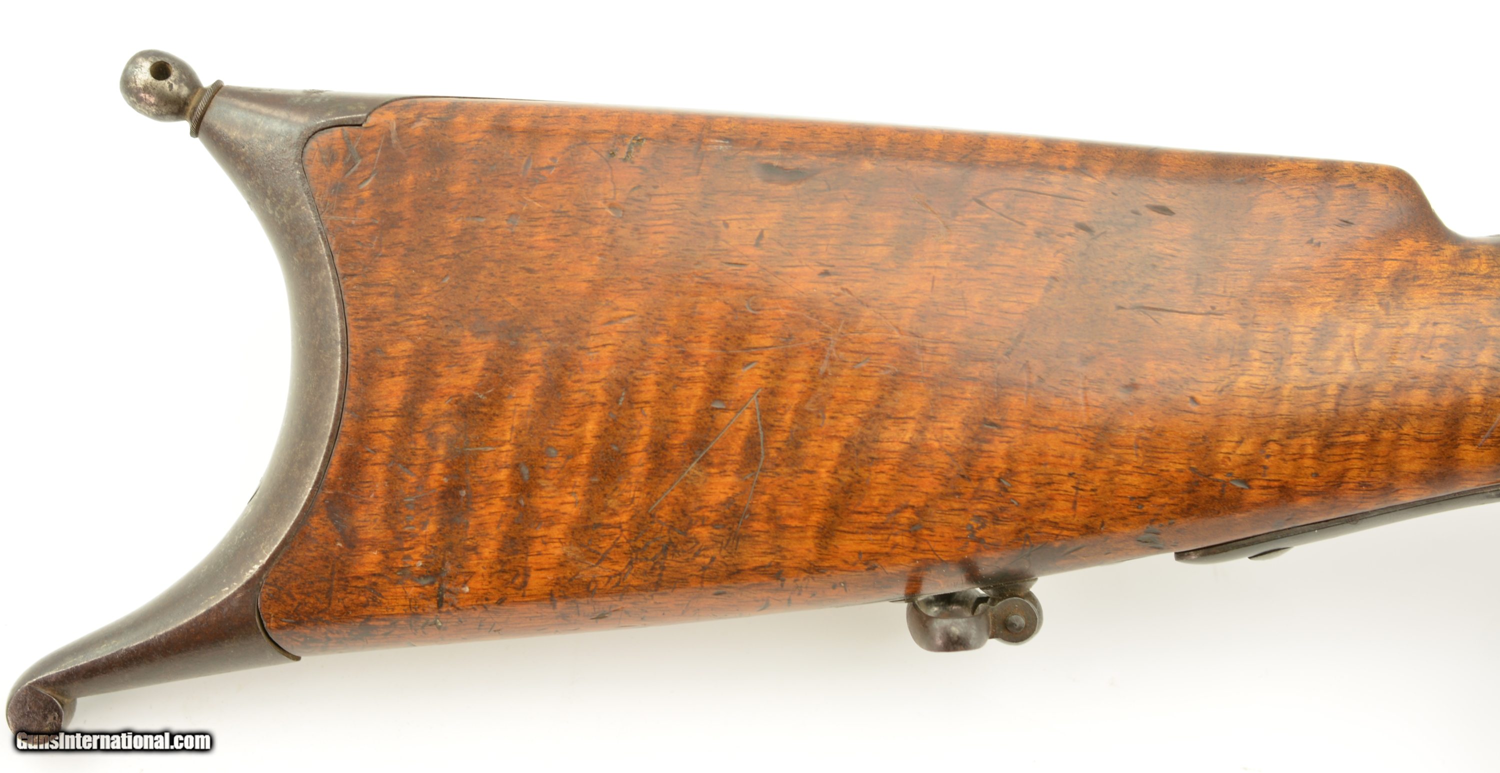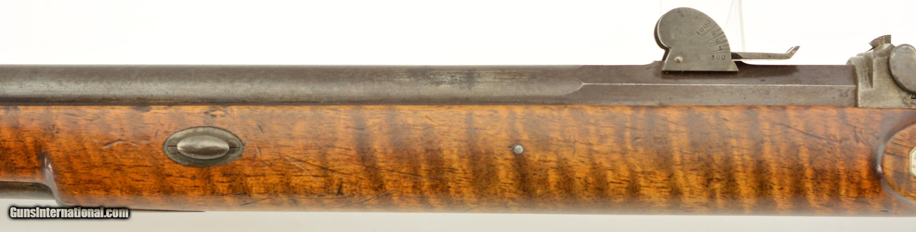 Description: NSN, .41 Swiss RF, 30" barrel with an excellent, bright bore. This is a handsome military pattern, commercial "scharfschutzen" rifle with double-set triggers, that has an extensively engraved, "ST. GALLEN" marked lock, "J.U. BANZIGER" on the breech-block, and a small engraved escutcheon opposite the lock that reads, "A. Vinnassa-Vinnassa" (probably the name of the original owner of the rifle). The "2"-marked barrel has traces of original blue remaining, with the balance turned to a smooth plum-brown patina with some silvering at the muzzle, as well as some minor freckling towards the breech end, and some small spots of pinprick pitting around the typical Swiss rear sight (a somewhat delicate, sporting/target front sight is also fitted that appears original to the rifle). The lock and hammer have a similar, but slightly more grayer patina, while the receiver has a mottled gray color with some of the original fire blue remaining on the hinge arm on the left side. The wedge-fastened stock has visible "tiger stripe" grain, with numerous small handling marks and blemishes throughout the added varnish finish, as well as a short crack at the top of the lockplate, just ahead of the hammer. The stock furniture and correct, button-headed ramrod have a matching plum-brown patina, and the action is fully functional. This is a very nice example of a high grade Milbank-Amsler Stutzer, and would make a great addition to any collection. Antique SOLD |
