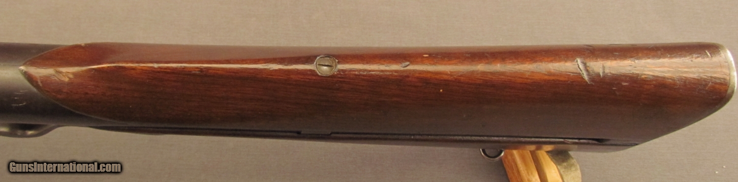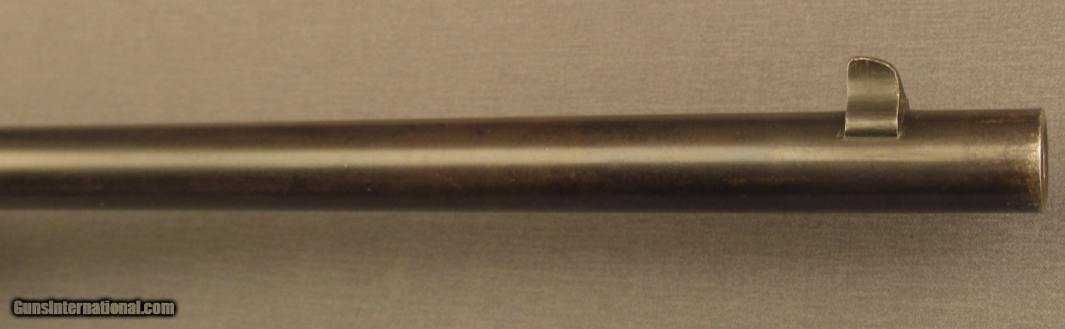Description: NSN, .44 Evans, 22” barrel with an excellent, bright bore. This is a rare New Model Carbine, one of about 4,000 made, that retains about 90% of the original blue finish with mild fading and freckling along the edges and at the muzzle. The lever, hammer, and some of the buttstock fittings have retained a like amount of their original color case-hardening which has dulled slightly, but is still fairly bright. Additionally, some of the original bright, nitre blue is still present on the rear ladder sight base. The checkered walnut forend with schnabel tip and unique, two-piece buttstock are also in excellent condition with only some very minor handling marks in the original varnish finish. The mechanism is in excellent condition as well, and functions flawlessly. The Evans was the first firearm to be mass-produced in Maine and utilizes a helical magazine in the buttstock that originally held 34 rounds of ammunition, but by the time the New Model was released the capacity had been reduced to 28 rounds. This particular example retains an exceptionally high degree of original finish and is mechanically superb (most surviving examples are pretty much gray guns nowadays). This is a rare piece that would make a stellar addition to any collection of unusual firearms or early American repeaters. Antique SOLD Antique: Yes Manufacturer: Evans Model: Carbine Caliber Info: .44 Gauge Info: .44 |