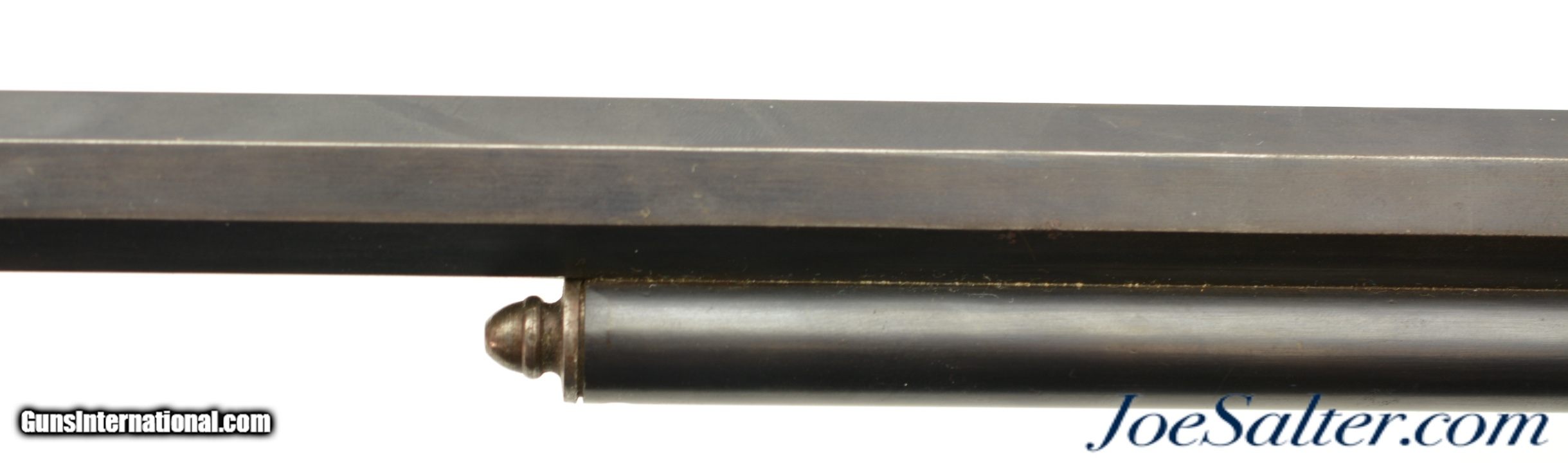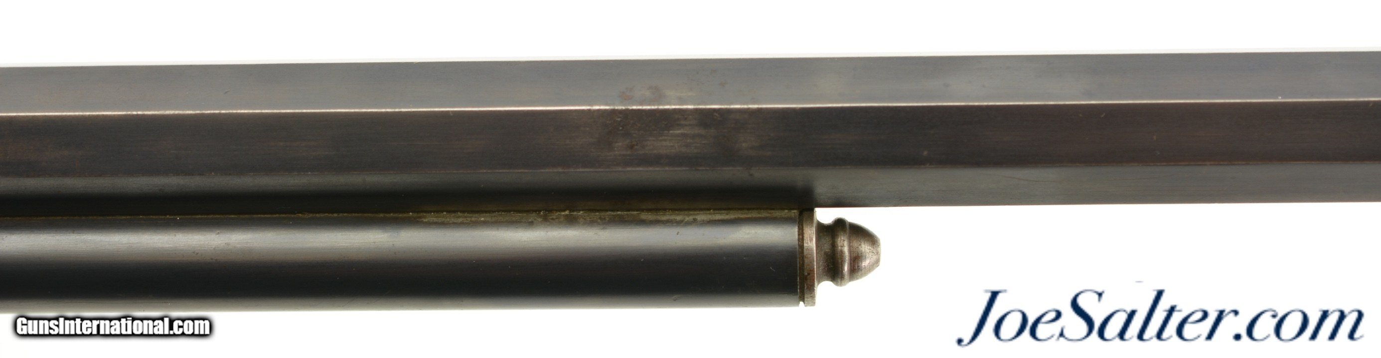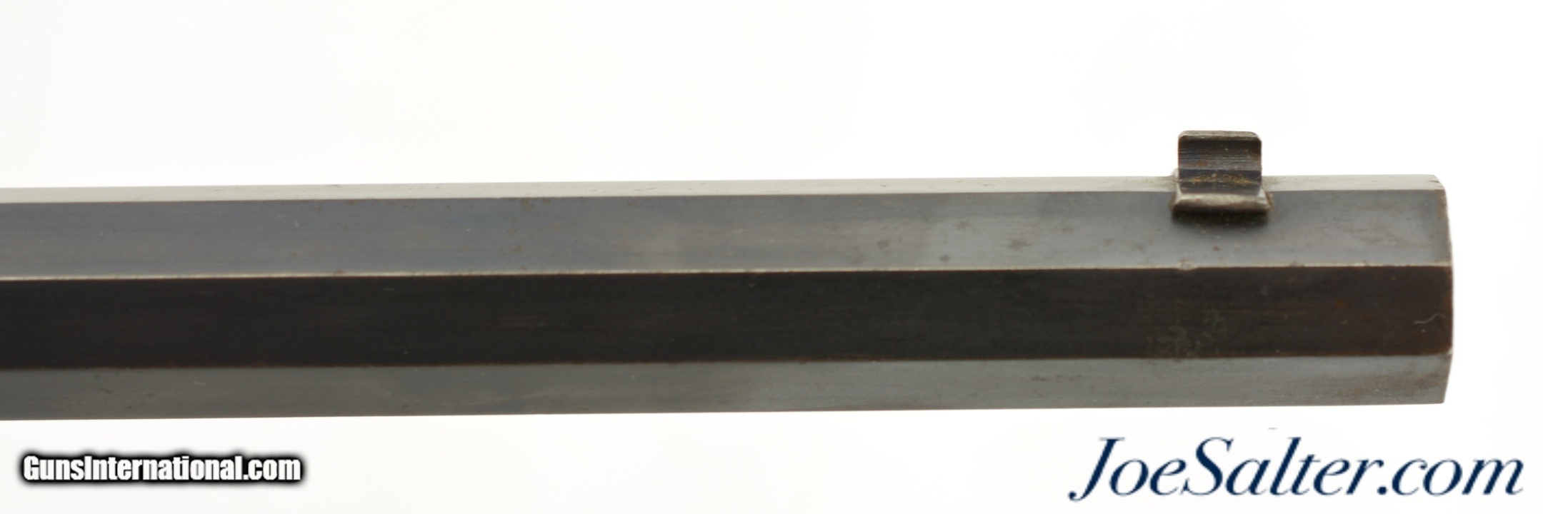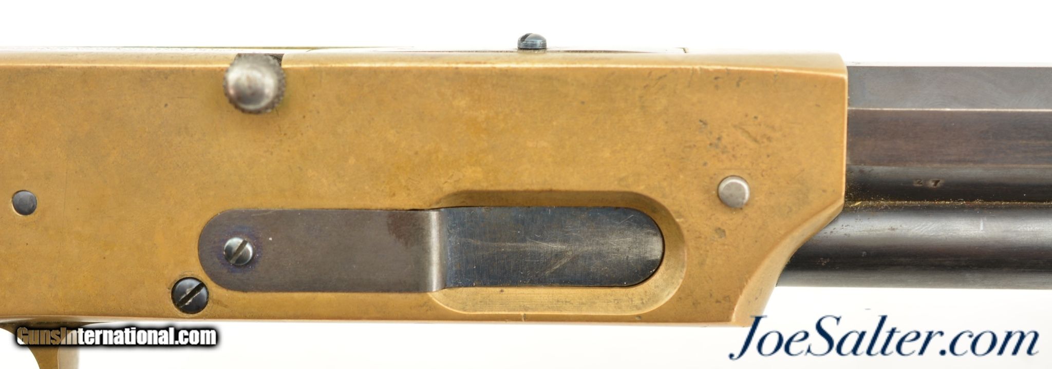 Description: Serial #27, .44 RF, 24 3/4" octagon barrel with an excellent, bright bore. This is a plain, but handsome rifle, built on Orville Robinson’s April 23, 1872, patent, and utilizes a manually-operated toggle lock that rides in a mortise along the top of the receiver operated via a knurled handle on the right side. The brass frame has an overall dull yellow-ochre patina with a series of small impact marks on the forward portion of the both sides of the frame surrounding the ends of the barrel pin. The bolt and early, spring steel, Winchester style, push in loading gate cover have retained a good portion of their original bright fire blue, with the balance aged to a mellow blue-brown patina. The rear toggle link and hammer retain a commensurate amount of muted original color case-hardening, with freckled gray on the balance. The barrel and magazine tube have about 85-90% of the original blue remaining, with thin silvering at the muzzle and along the edges of the barrel facets. A period sporting bead front sight blade and elevation-adjustable rear sight are installed, as is an original folding aperture rear sight on the top wrist tang. The walnut buttstock is also in excellent shape, with only minor handling marks and small blemishes scattered about the original varnish. This is quite possibly the highest condition original Robinson Model 1872 repeating rifle in existence, and would make a fantastic addition to any collection. Antique; Orville Moses Robinson was an upstate New York gunsmith and inventor who received three US patents for breech-loading and repeating firearms. In 1870 Robinson, in partnership with A.S. Babbitt and two others, formed the Adirondack Firearms Co. to manufacture rifles based on his patents at their manufactory in Plattsburgh, NY. The firm is known to have employed Daniel Wilkinson (possibly J.D. Wilkinson, another upstate New York gunmaker and inventor) and Robinson’s son, William (who would’ve been about 10 years old at the formation of the company!) Adirondack Firearms Co. operated until 1874, ultimately producing what is thought to be slightly fewer than 1,000 rifles of all types, when it was purchased by the Winchester Repeating Arms Co. and permanently shut down. The Adirondack Firearms Co., and Robinson’s repeating rifle designs, represent an interesting footnote in the then rapidly advancing field of repeating breechloading long guns. ; SOLD Antique: Yes |