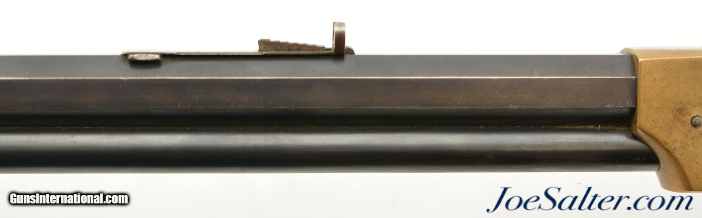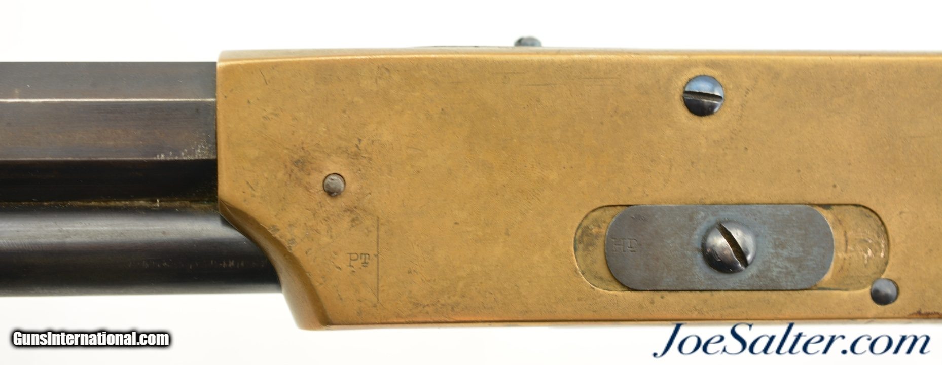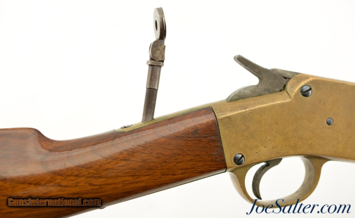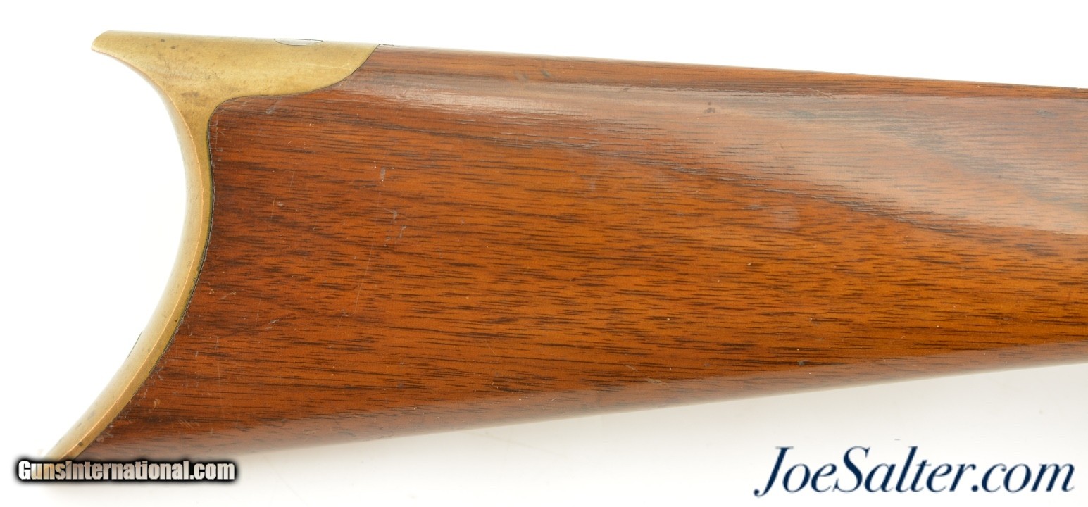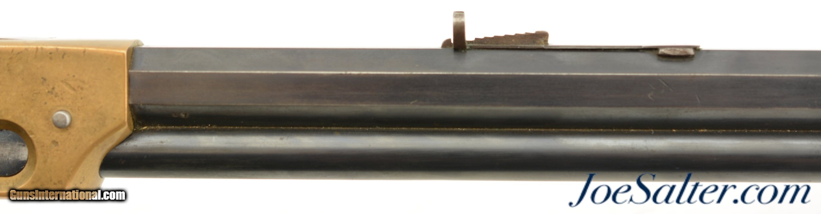Description: Serial #27, .44 RF, 24 3/4" octagon barrel with an excellent, bright bore. This is a plain, but handsome rifle, built on Orville Robinson’s April 23, 1872, patent, and utilizes a manually-operated toggle lock that rides in a mortise along the top of the receiver operated via a knurled handle on the right side. The brass frame has an overall dull yellow-ochre patina with a series of small impact marks on the forward portion of the both sides of the frame surrounding the ends of the barrel pin. The bolt and early, spring steel, Winchester style, push in loading gate cover have retained a good portion of their original bright fire blue, with the balance aged to a mellow blue-brown patina. The rear toggle link and hammer retain a commensurate amount of muted original color case-hardening, with freckled gray on the balance. The barrel and magazine tube have about 85-90% of the original blue remaining, with thin silvering at the muzzle and along the edges of the barrel facets. A period sporting bead front sight blade and elevation-adjustable rear sight are installed, as is an original folding aperture rear sight on the top wrist tang. The walnut buttstock is also in excellent shape, with only minor handling marks and small blemishes scattered about the original varnish. This is quite possibly the highest condition original Robinson Model 1872 repeating rifle in existence, and would make a fantastic addition to any collection. Antique; Orville Moses Robinson was an upstate New York gunsmith and inventor who received three US patents for breech-loading and repeating firearms. In 1870 Robinson, in partnership with A.S. Babbitt and two others, formed the Adirondack Firearms Co. to manufacture rifles based on his patents at their manufactory in Plattsburgh, NY. The firm is known to have employed Daniel Wilkinson (possibly J.D. Wilkinson, another upstate New York gunmaker and inventor) and Robinson’s son, William (who would’ve been about 10 years old at the formation of the company!) Adirondack Firearms Co. operated until 1874, ultimately producing what is thought to be slightly fewer than 1,000 rifles of all types, when it was purchased by the Winchester Repeating Arms Co. and permanently shut down. The Adirondack Firearms Co., and Robinson’s repeating rifle designs, represent an interesting footnote in the then rapidly advancing field of repeating breechloading long guns. ; SOLD Antique: Yes |