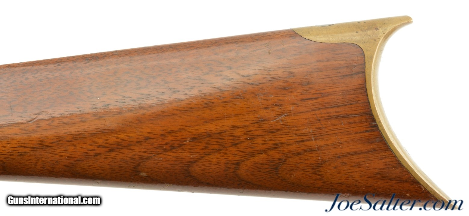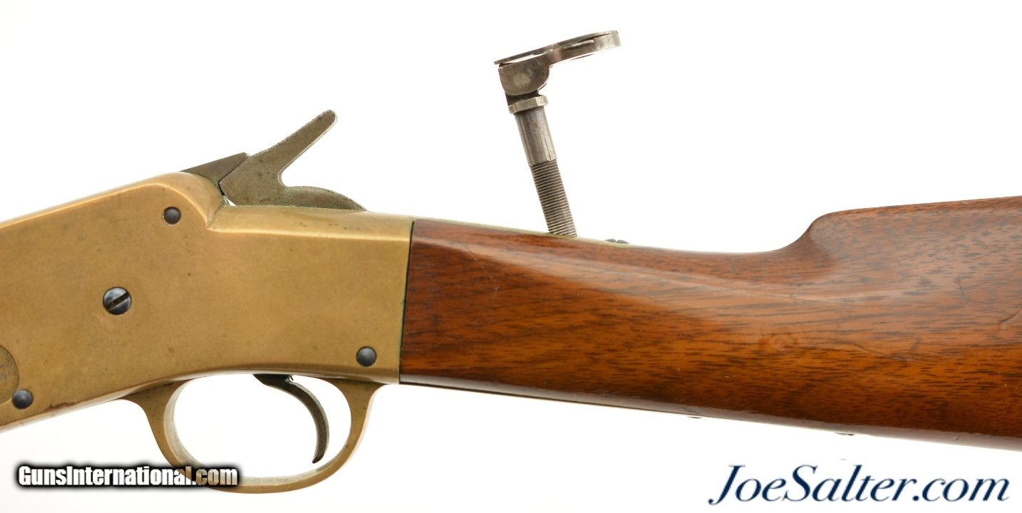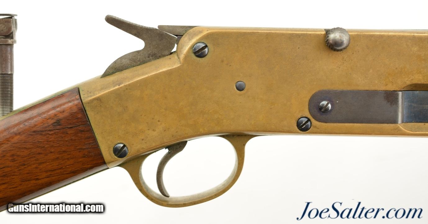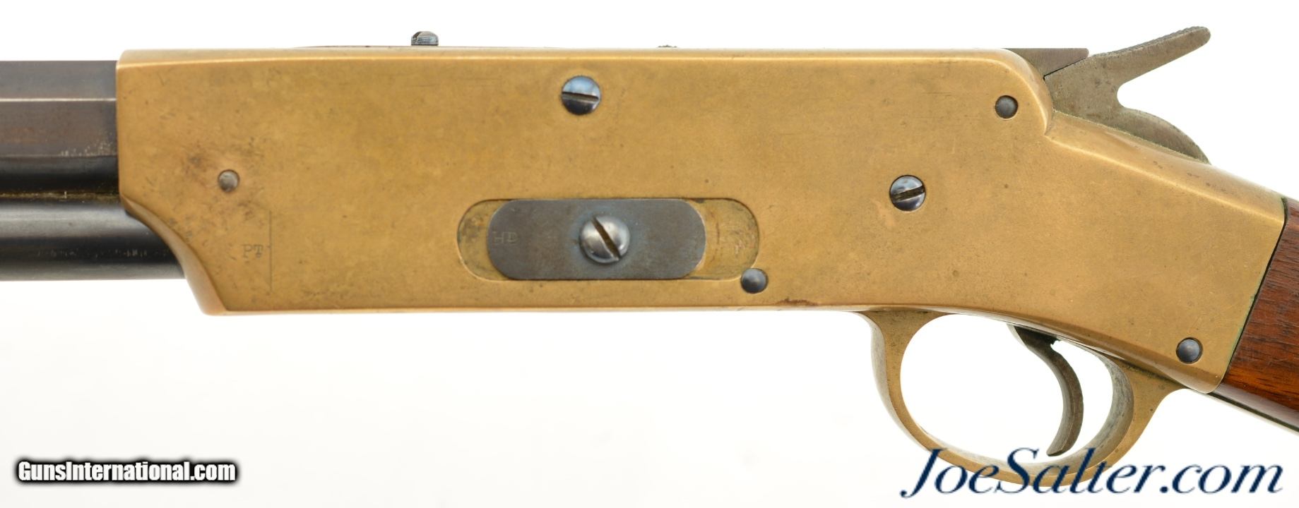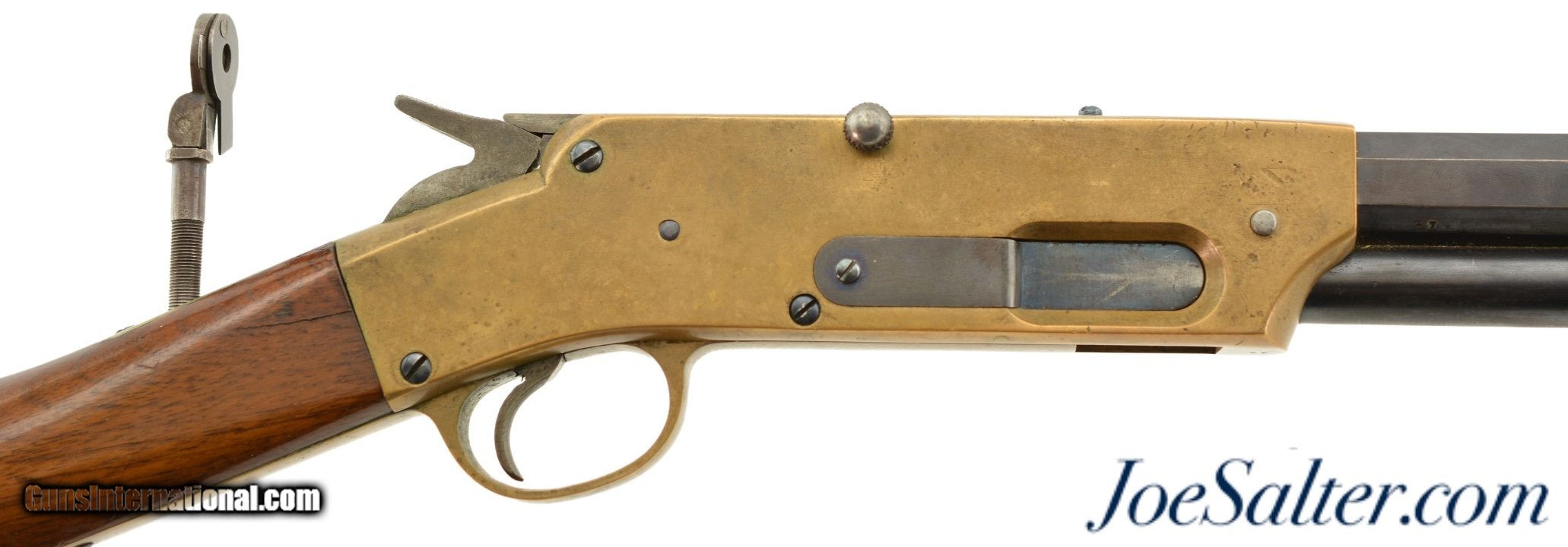 Description: Serial #27, .44 RF, 24 3/4" octagon barrel with an excellent, bright bore. This is a plain, but handsome rifle, built on Orville Robinson’s April 23, 1872, patent, and utilizes a manually-operated toggle lock that rides in a mortise along the top of the receiver operated via a knurled handle on the right side. The brass frame has an overall dull yellow-ochre patina with a series of small impact marks on the forward portion of the both sides of the frame surrounding the ends of the barrel pin. The bolt and early, spring steel, Winchester style, push in loading gate cover have retained a good portion of their original bright fire blue, with the balance aged to a mellow blue-brown patina. The rear toggle link and hammer retain a commensurate amount of muted original color case-hardening, with freckled gray on the balance. The barrel and magazine tube have about 85-90% of the original blue remaining, with thin silvering at the muzzle and along the edges of the barrel facets. A period sporting bead front sight blade and elevation-adjustable rear sight are installed, as is an original folding aperture rear sight on the top wrist tang. The walnut buttstock is also in excellent shape, with only minor handling marks and small blemishes scattered about the original varnish. This is quite possibly the highest condition original Robinson Model 1872 repeating rifle in existence, and would make a fantastic addition to any collection. Antique; Orville Moses Robinson was an upstate New York gunsmith and inventor who received three US patents for breech-loading and repeating firearms. In 1870 Robinson, in partnership with A.S. Babbitt and two others, formed the Adirondack Firearms Co. to manufacture rifles based on his patents at their manufactory in Plattsburgh, NY. The firm is known to have employed Daniel Wilkinson (possibly J.D. Wilkinson, another upstate New York gunmaker and inventor) and Robinson’s son, William (who would’ve been about 10 years old at the formation of the company!) Adirondack Firearms Co. operated until 1874, ultimately producing what is thought to be slightly fewer than 1,000 rifles of all types, when it was purchased by the Winchester Repeating Arms Co. and permanently shut down. The Adirondack Firearms Co., and Robinson’s repeating rifle designs, represent an interesting footnote in the then rapidly advancing field of repeating breechloading long guns. ; SOLD Antique: Yes |
