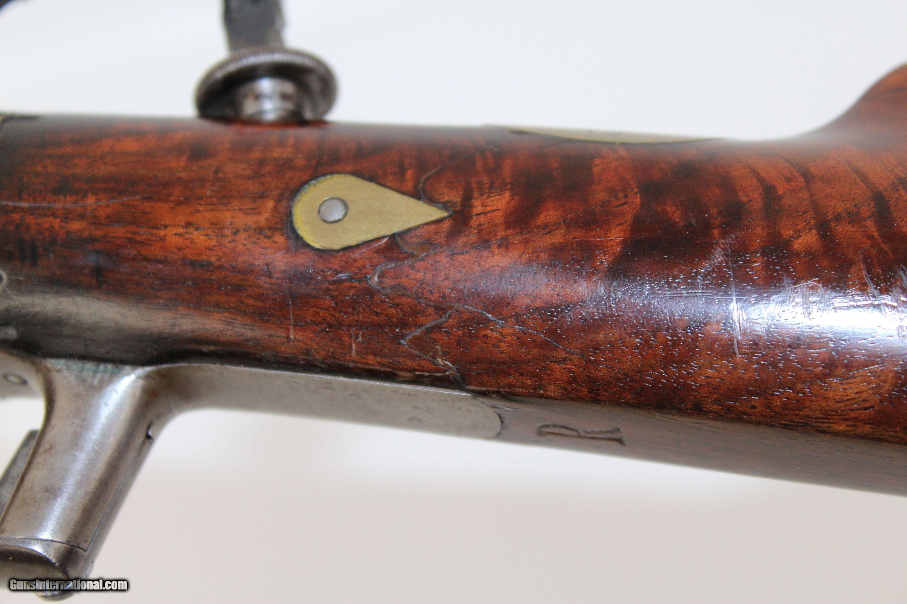Description: FOREHAND & WADSWORTH Breech RIFLE w/ Rotary Sight 1870s Rifle with Deluxe Walnut Stock Here we present a rare antique single shot falling breech rifle with a rotary peep sight manufactured by Forehand & Wadsworth of Worchester, Massachusetts, circa 1871-1880. The rifle is nearly identical to the Allen & Wheelock drop-breech rifle and features a trigger guard which acts as a lever to open the breech and eject the cartridge. These drop breech rimfire rifles were manufactured first by Allen & Wheelock and Ethan Allen & Co. in the 1860s to 1870 and then by Forehand & Wadsworth in the 1870s and 1880s. Both Sullivan Forehand and Henry C. Wadsworth married daughters of Ethan Allen before they took over and renamed the company. Production was limited and only a couple thousand are believed to have been manufactured of this rifle. This rifle features a fully octagonal barrel, deluxe walnut stock, and, most interesting of all, an Allen’s Patent rotary peep sight regulated to 1600 yards! This sighting system is very scarce and is operated by depressing the latch with your shooting hand thumb and by turning the outside of the dial with the other hand. There is a small window that shows which distance (1-16 in hundreds of yards) and a small aperture at the top of the sight that is the correct height for that distance. This is a very unique and fascinating little device! The top of the barrel is marked “FOREHAND & WADSWORTH/ WORCESTER, MASS./ PATENTED SEPT. 18. 1860”. The back of the rear sight is marked “ALLEN’S PATENT/OCT. 28, 1862”. The bottom of the butt stock is marked “R” just behind the trigger guard. The overall condition is fine. 80% of the original blue finish remains on the barrel. The markings are clear and legible. The bore in very good shape, clean with strong rifling. The stock has been neatly repaired at the wrist and has seen some chipping at the toe. The action is excellent. Own the original! This is a legitimate antique and not a reproduction. Barrel is 24 inches. Caliber: .38 Rimfire Overall condition as seen in photos. Very Fast. Very Safe. FREE SHIPPING WORLDWIDE. Delivered directly to your door by express mail! Guaranteed AUTHENTIC & Includes CERTIFICATE OF AUTHENTICITY. ancestryguns $2800 #6399 SOLD Antique: Yes |