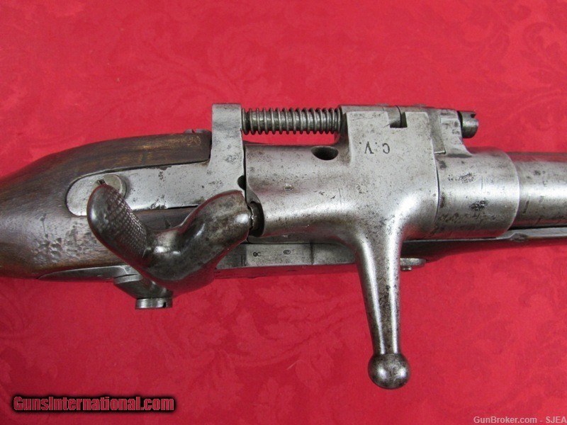 Description: VERY RARE FRENCH TABATIERE TRIAL INFANTRY RIFLE: In very good plus general condition. Circa 1865. About 17mm caliber. Very good metal bearing a pleasing smooth age patina throughout. Excellent markings. Fine stock with some light handling marks and fine inspector stamps and cartouche. Excellent action and fine bore with fine rifling. Original cleaning rod. A rare and unusual French trial rifle! no reserve. NOTES: This item is a Pre. 1899 antique. No FFL or C&R license required to purchase. ALL SALES ARE FINAL. SOLD Antique: Yes |