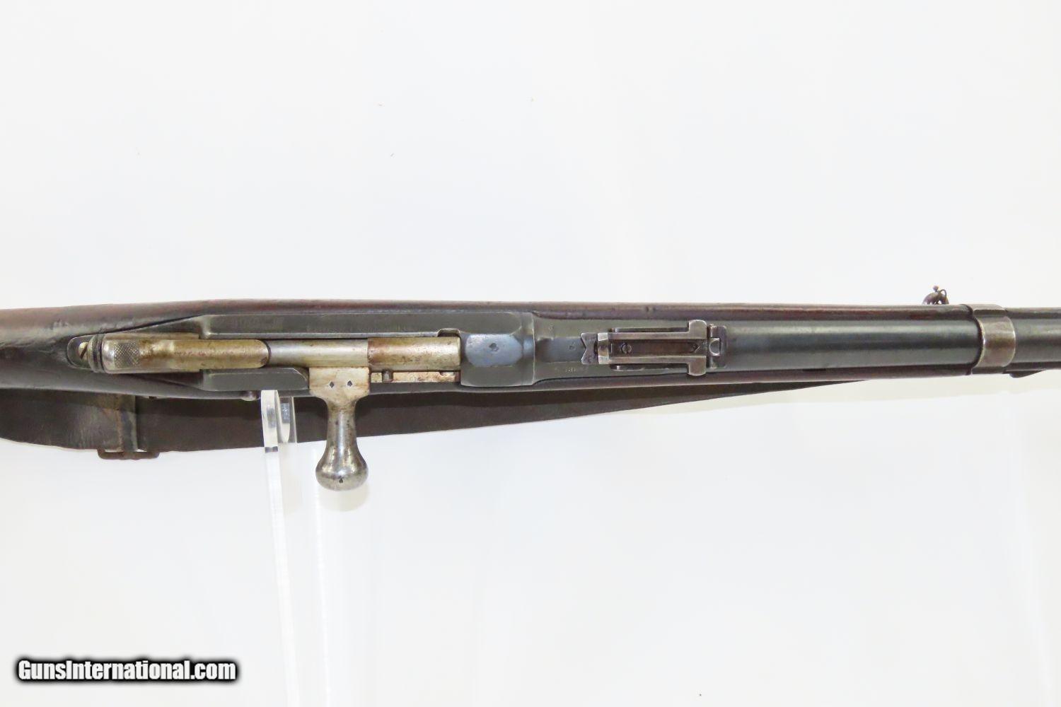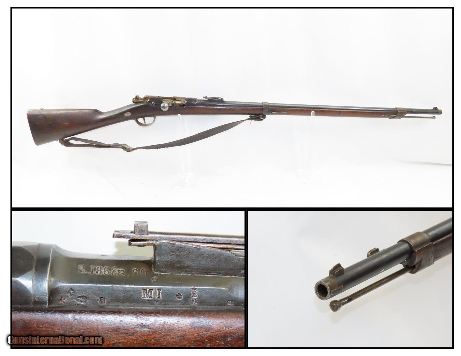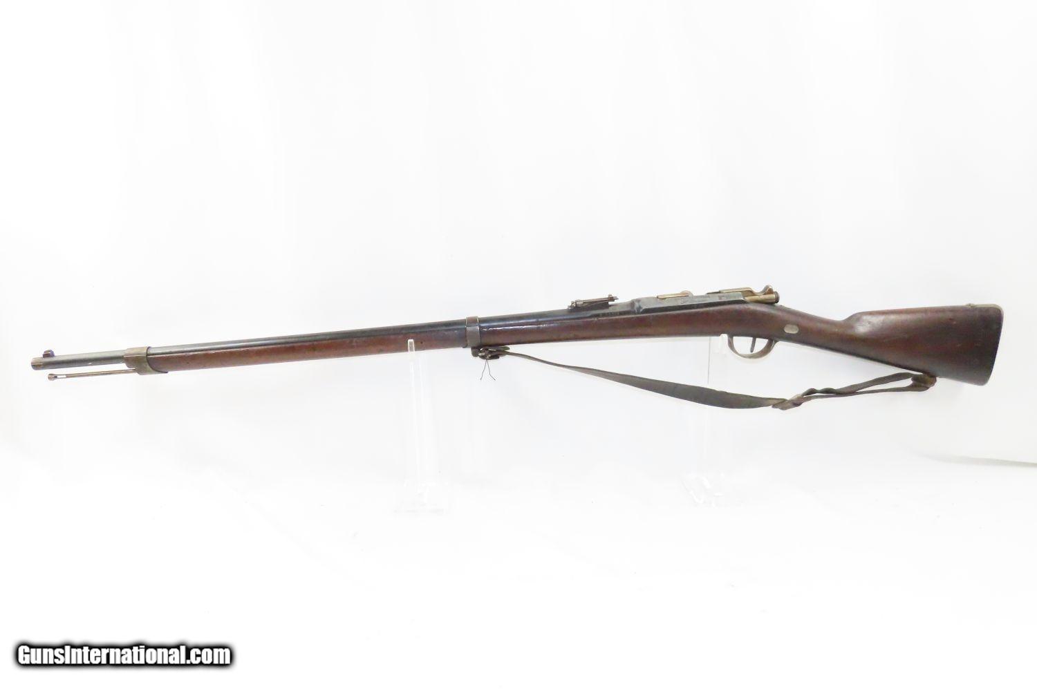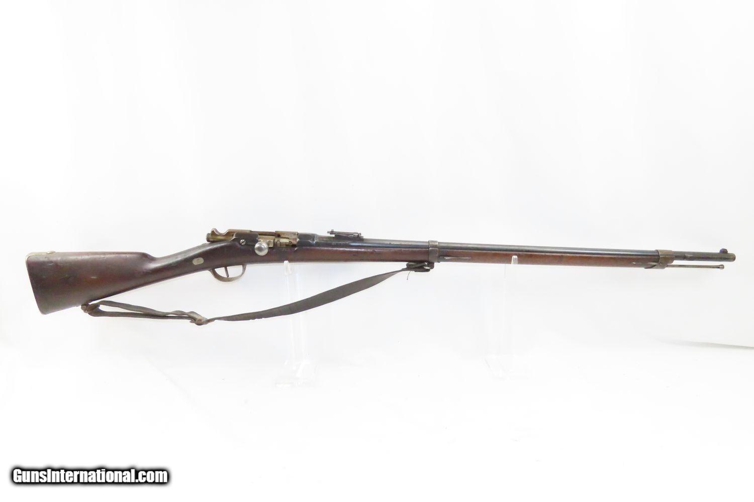 Description: GRAS CONVERSION French ST. ETIENNE Model 1866/74 11X59mm Bolt Action RIFLE Updated Model 1866 to Chamber Metallic Cartridge Here we present an antique Model 1866-74 Chassepot Bolt Action Rifle, made circa 1868 at the arsenal in St. Etienne, then updated to accept metallic cartridges instead of paper. This rifle gets its name from the inventor, Antoine Alphonse Chassepot. His third iteration, featuring the needle fire system similar to that of the Prussian Dreyse, was adopted by the French military, and subsequently used in the Franco-Prussian War. This was the very beginning of the bolt action rifle era, and soon virtually every military the world over would be armed with long arms along these lines. The Mauser brothers were on the cusp of making their appearance internationally as this small arms race between France and Germany heated up. The Prussians, the victors of the nearly year-long conflict, would go on to replace their needle-fire, bolt action rifle, the Dreyse, with the Model 1871/84. The French would update the Model 1866 to accept metallic cartridges and also adopt the new Gras in 1874. This would continue through the Great War and beyond. This rifle is marked “Mle 1866”, clearly a mark original to the gun, then a much more distinct “-74”, indicating that this rifle was updated with the Gras Conversion for accepting metallic cartridges. The left side of the receiver is marked “M. 80”. The right side of the barrel is marked “S.1880” very likely the date that this rifle saw updates or arsenal work. The overall condition is very good. Strong action. The bore is in very nice shape. The stock is solid with an expected amount of wear. The numbers match. Sharp markings throughout. A great piece of history from France! Own the original! This is a legitimate antique and not a reproduction. Barrel is 32-1/4 inches. Caliber: 11x59mm Overall condition as seen in photos. Very Fast. Very Safe. FREE SHIPPING WORLDWIDE. Delivered directly to your door by express mail! Guaranteed AUTHENTIC & Includes CERTIFICATE OF AUTHENTICITY. ancestryguns $1665 #210401 SOLD Antique: Yes |