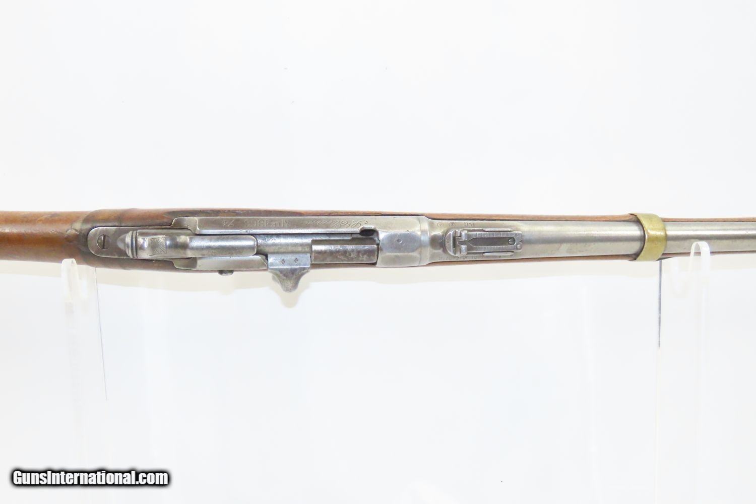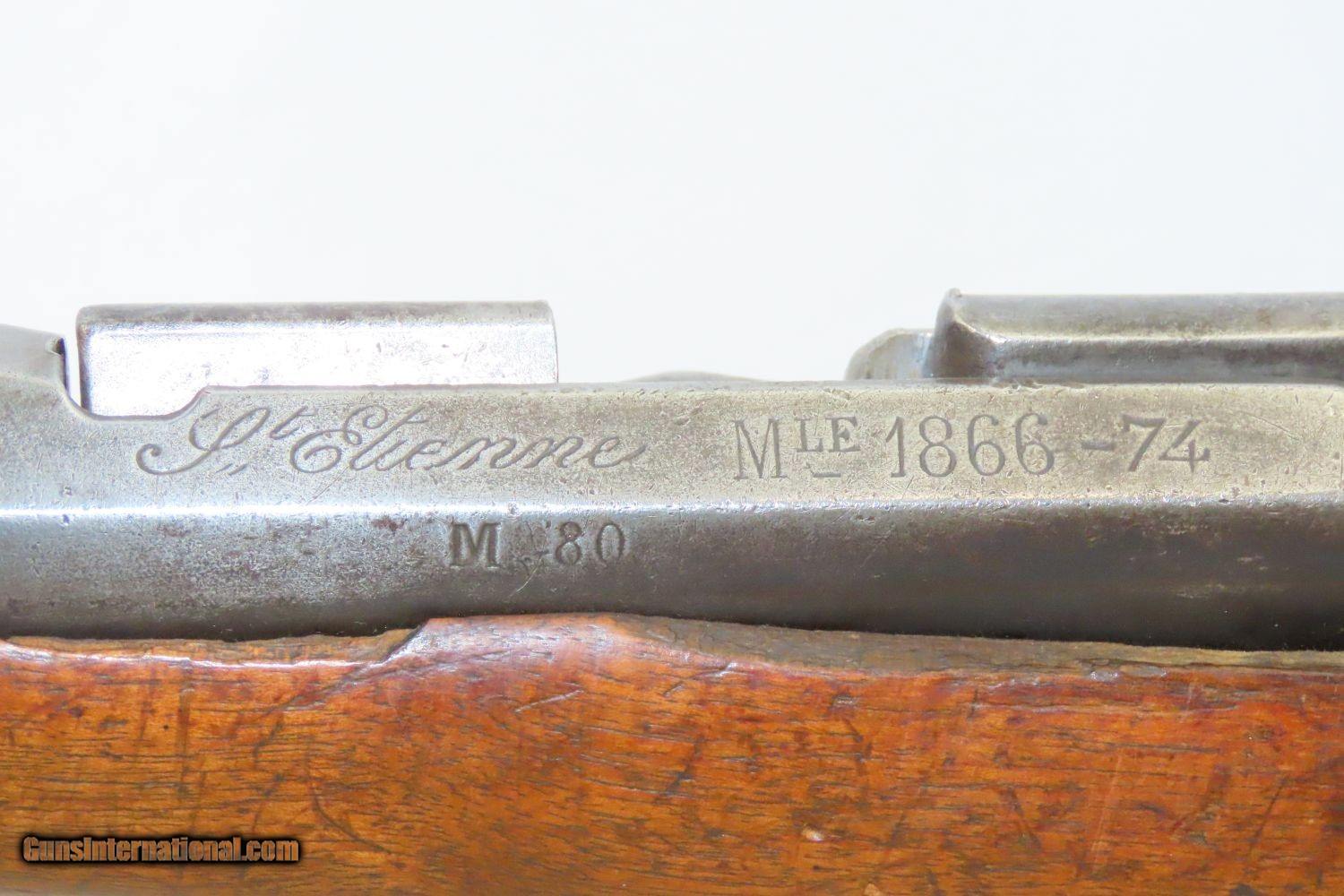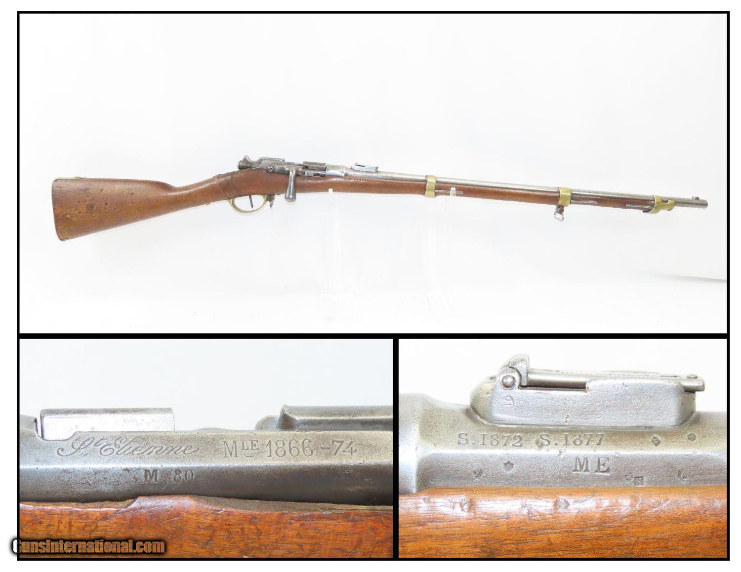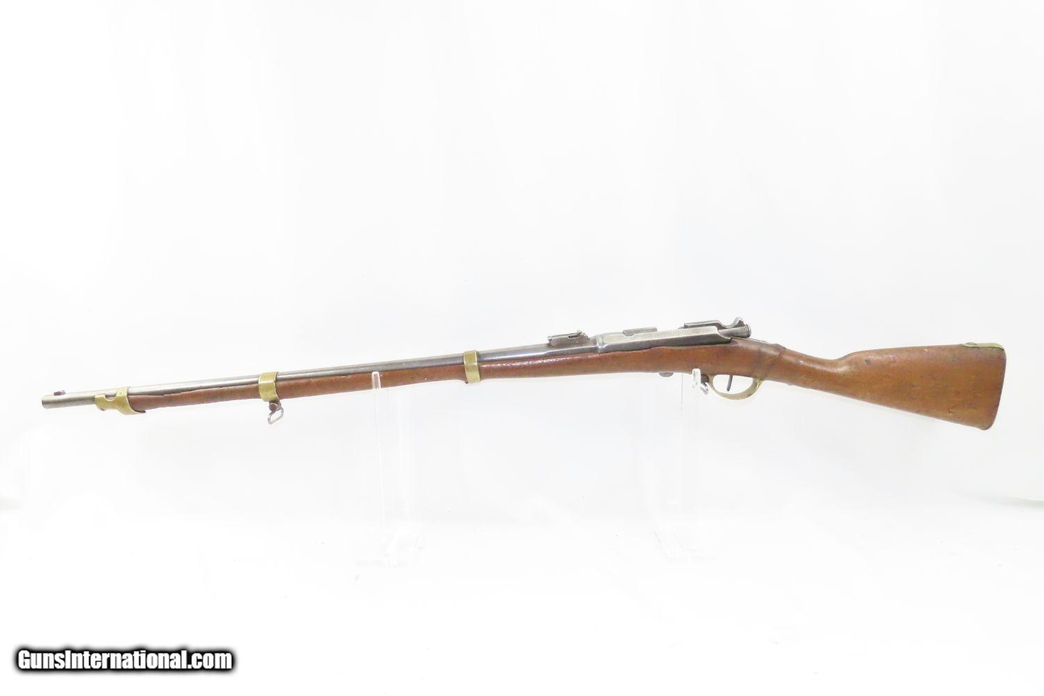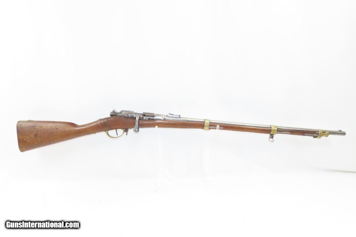 Description: GRAS CONVERSION French ST. ETIENNE Model 1866/74 11X59mm Bolt Action RIFLE Updated Model 1866 to Chamber Metallic Cartridge Here we present an antique Model 1866-74 Chassepot Bolt Action Rifle, made circa 1872 at the arsenal in St. Etienne, then updated to accept metallic cartridges instead of paper. This rifle gets its name from the inventor, Antoine Alphonse Chassepot. His third iteration, featuring the needle fire system similar to that of the Prussian Dreyse, was adopted by the French military, and subsequently used in the Franco-Prussian War. This was the very beginning of the bolt action rifle era, and soon virtually every military the world over would be armed with long arms along these lines. The Mauser brothers were on the cusp of making their appearance internationally as this small arms race between France and Germany heated up. The Prussians, the victors of the nearly year-long conflict, would go on to replace their needle-fire, bolt action rifle, the Dreyse, with the Model 1871/84. The French would update the Model 1866 to accept metallic cartridges and also adopt the new Gras in 1874. This would continue through the Great War and beyond. This rifle is marked “Mle 1866”, clearly a mark original to the gun, then a much more distinct “-74”, indicating that this rifle was updated with the Gras Conversion for accepting metallic cartridges. The left side of the receiver is marked “M. 80”. The barrel is marked “S.1877” very likely the date that this rifle saw updates or arsenal work. The overall condition is good. Strong action. Good bore. The stock has seen better days and contains a few repairs around the barrel tang. The right buttstock has a few random punch dots. There is some chipping on the stock at the muzzle end. Own the original! This is a legitimate antique and not a reproduction. Barrel is 27-3/4 inches. Caliber: 11x59mm Overall condition as seen in photos. Very Fast. Very Safe. FREE SHIPPING WORLDWIDE. Delivered directly to your door by express mail! Guaranteed AUTHENTIC & Includes CERTIFICATE OF AUTHENTICITY. ancestryguns $1195 #210403 SOLD Antique: Yes |