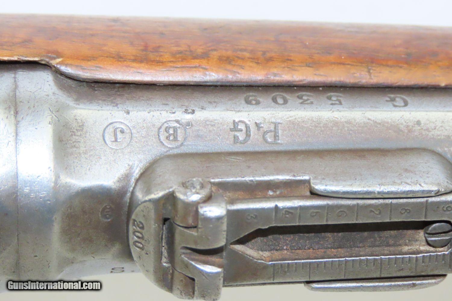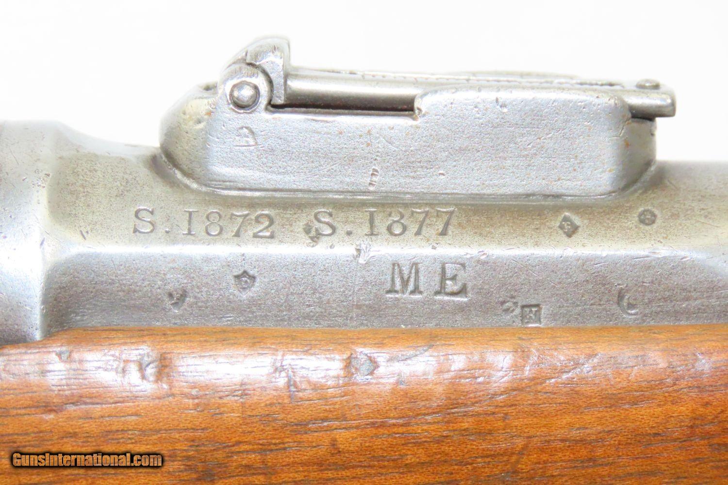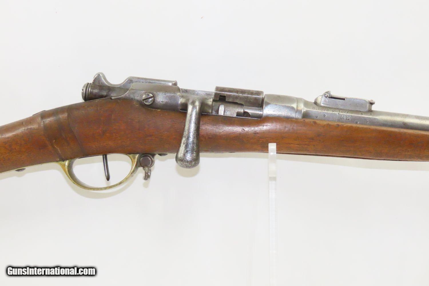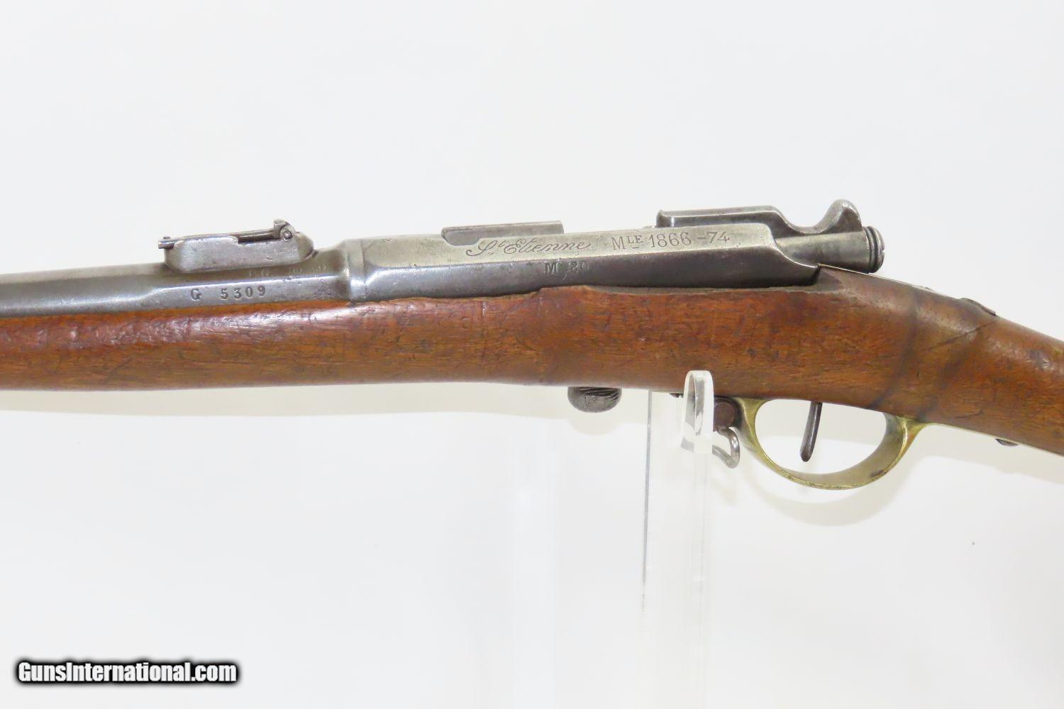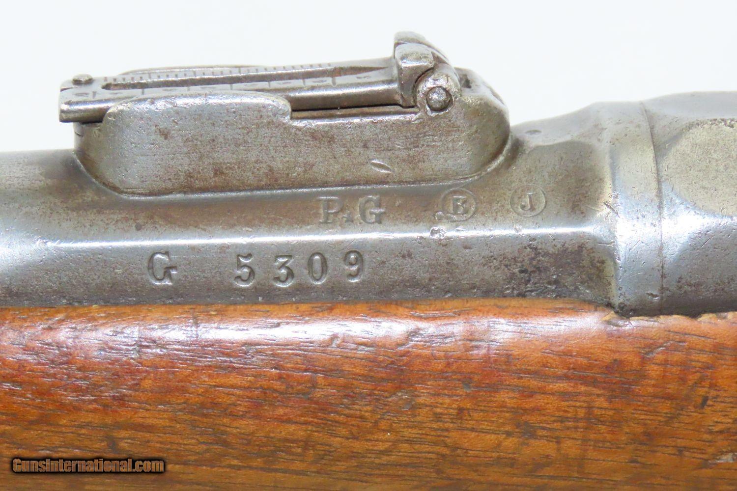 Description: GRAS CONVERSION French ST. ETIENNE Model 1866/74 11X59mm Bolt Action RIFLE Updated Model 1866 to Chamber Metallic Cartridge Here we present an antique Model 1866-74 Chassepot Bolt Action Rifle, made circa 1872 at the arsenal in St. Etienne, then updated to accept metallic cartridges instead of paper. This rifle gets its name from the inventor, Antoine Alphonse Chassepot. His third iteration, featuring the needle fire system similar to that of the Prussian Dreyse, was adopted by the French military, and subsequently used in the Franco-Prussian War. This was the very beginning of the bolt action rifle era, and soon virtually every military the world over would be armed with long arms along these lines. The Mauser brothers were on the cusp of making their appearance internationally as this small arms race between France and Germany heated up. The Prussians, the victors of the nearly year-long conflict, would go on to replace their needle-fire, bolt action rifle, the Dreyse, with the Model 1871/84. The French would update the Model 1866 to accept metallic cartridges and also adopt the new Gras in 1874. This would continue through the Great War and beyond. This rifle is marked “Mle 1866”, clearly a mark original to the gun, then a much more distinct “-74”, indicating that this rifle was updated with the Gras Conversion for accepting metallic cartridges. The left side of the receiver is marked “M. 80”. The barrel is marked “S.1877” very likely the date that this rifle saw updates or arsenal work. The overall condition is good. Strong action. Good bore. The stock has seen better days and contains a few repairs around the barrel tang. The right buttstock has a few random punch dots. There is some chipping on the stock at the muzzle end. Own the original! This is a legitimate antique and not a reproduction. Barrel is 27-3/4 inches. Caliber: 11x59mm Overall condition as seen in photos. Very Fast. Very Safe. FREE SHIPPING WORLDWIDE. Delivered directly to your door by express mail! Guaranteed AUTHENTIC & Includes CERTIFICATE OF AUTHENTICITY. ancestryguns $1195 #210403 SOLD Antique: Yes |