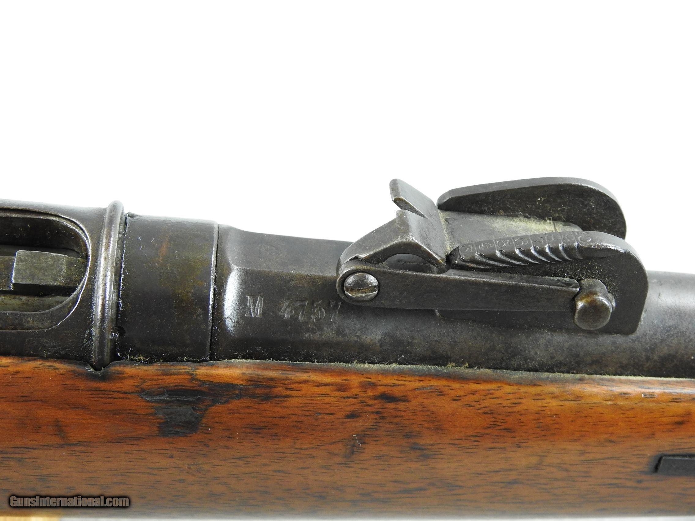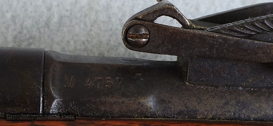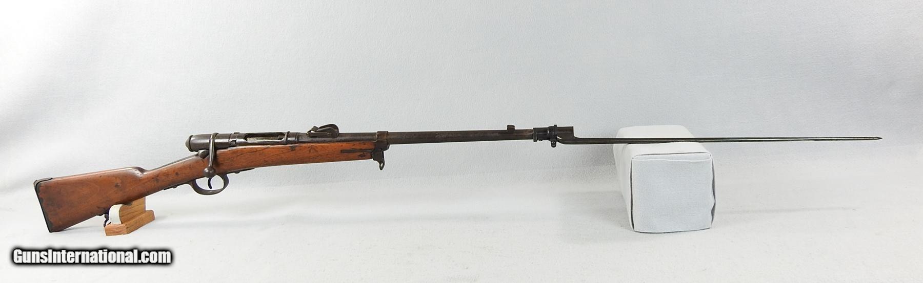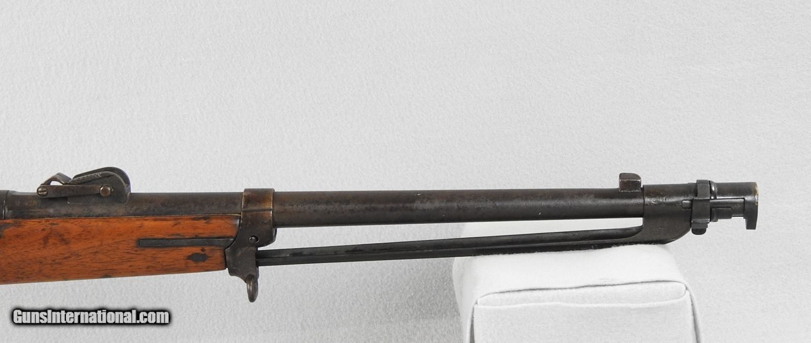 Description: This is a very rare item, a 17 ½” barrel single shot Vetterli 10.35x47 Rmm centerfire with an 18” cruciform socket bayonet. The rear of the barrel is hexagonal and on the left flat is dated 1874 and marked Brescia above it. On the right M4757 and the same number is on the right butt of the stock. The bore is dark but does have strong rifling. The mechanical function is very good and tight. These single shot carbines are very rare and were not converted to the magazine system. I would consider trades for pre 1899 ANTIQUE PISTOLS and rifles on any of my items.. WHAT DO YOU HAVE TO TRADE? Ask about our 30-90 day lay-away program. We accept Bank Check, Money order, Personal checks or wire transfer. SOLD Antique: Yes Manufacturer: Vetterli Model: Single Shot Carbine Serial Number: M4757 |