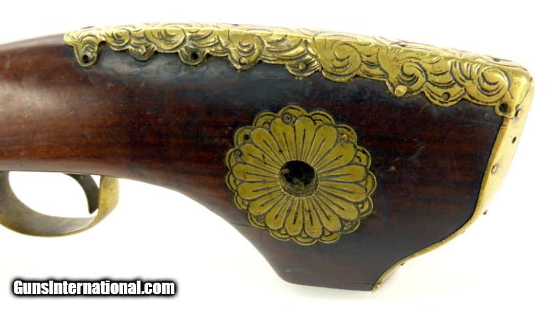 Description: Murata Match Lock. Japanese Murata Bolt action installed in a Match Lock stock. This was a combination of the old and the new. The Murata came into service in 1880. Th eMatch Lock part was made about 1800. The Murata action and barrel are chrome plated. The gun is now a shotgun. Stock has a crack and many brass inlays. This is a good project for some one who wants soemthing that no one else has. SOLD |