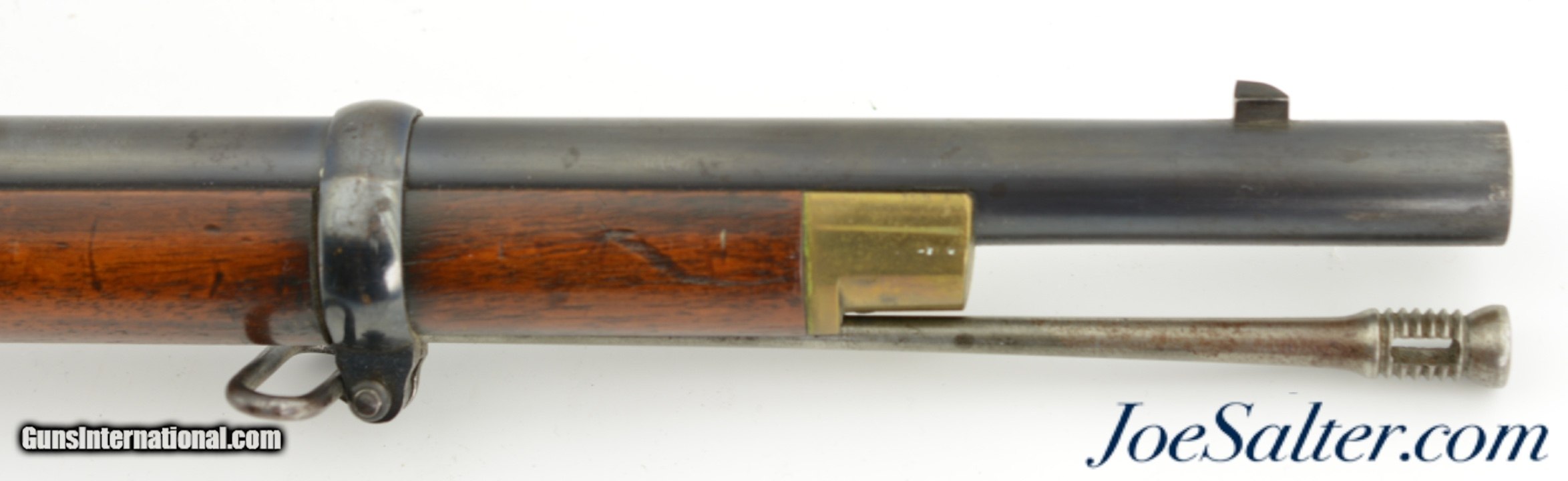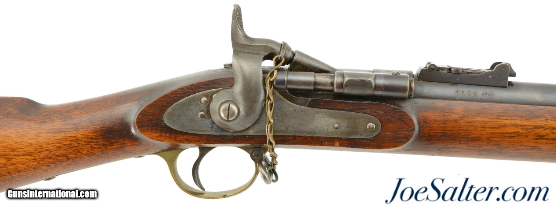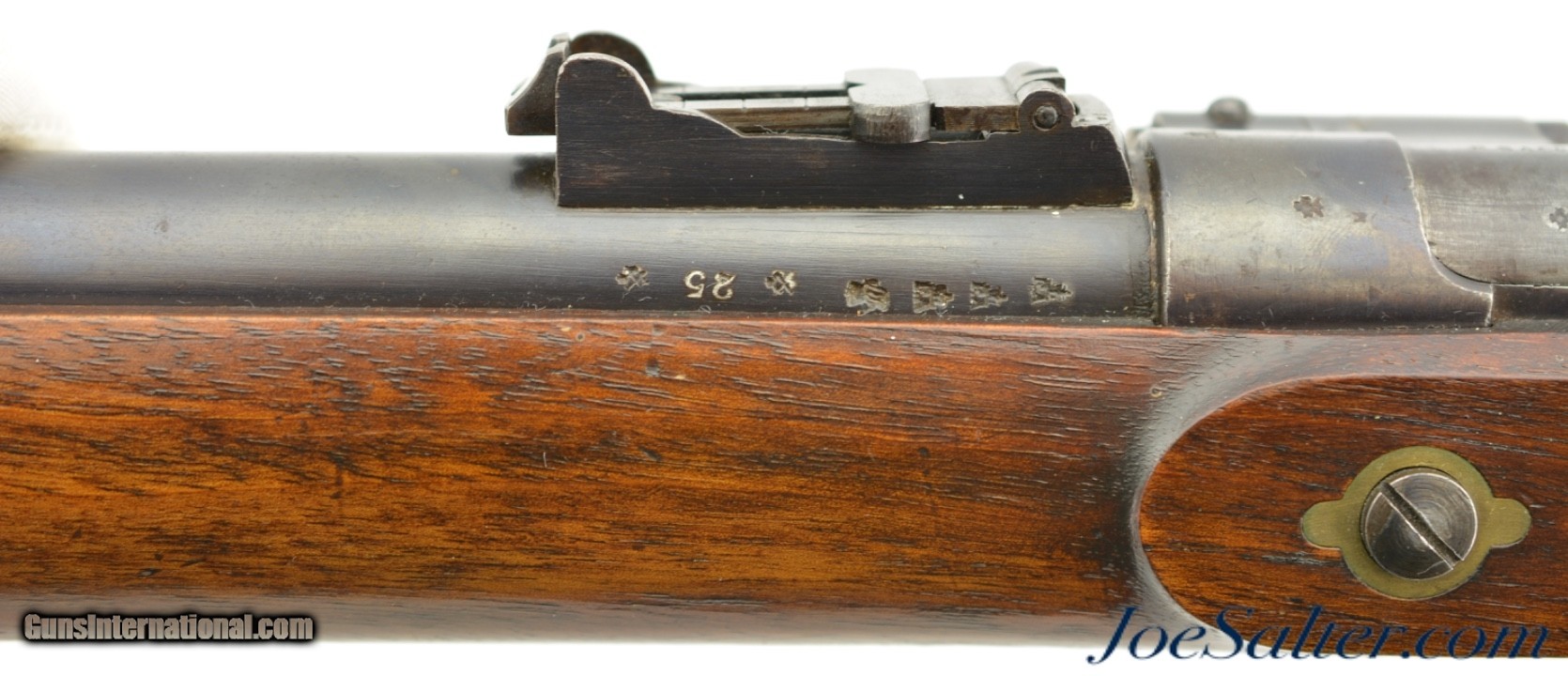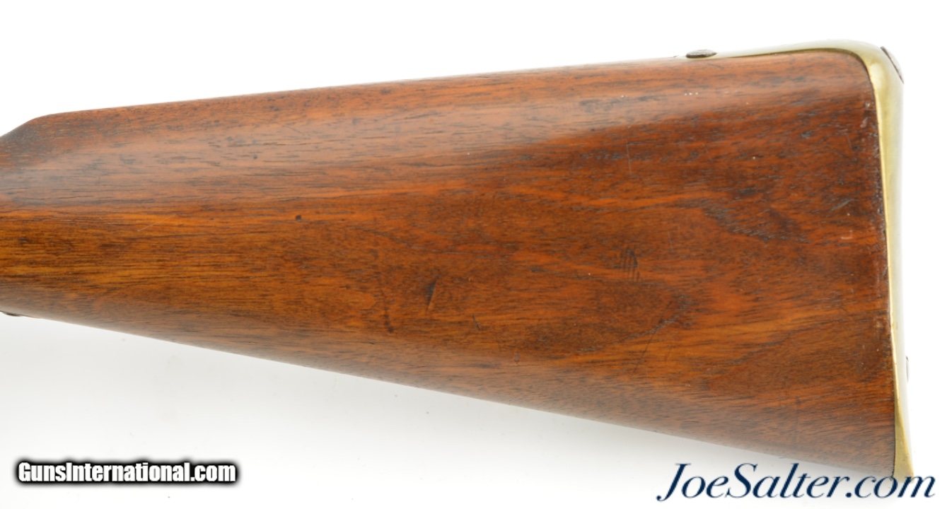 Description: Serial #7444, .577 Snider, 36 1/2" barrel with and excellent, bright bore. This is a truly handsome, BSA-made rifle has 85-90% of the original blue remaining on the barrel, with some freckling and traces of a warm, plum-brown patina on the balance. Much of the original color case-hardening remains on the "BSA Co. / 1869"-marked lock. The breechblock retains a commensurate amount of color case-hardening, while the brass trigger guard, nosecap, and buttplate have a mild yellow-ochre patina. The walnut stock has few handling marks in the original oil finish, and a retail or club stamp is present on the left side opposite the lock: "FIELD RIFLE Co. / BIRMINGHAM." An original ramrod is included, and the chained firing pin protector is still in place. The action lock-up is tight and fully functional. These well-made rifles were used in military rifle matches, and this example is fine-near excellent condition overall. Antique SOLD |