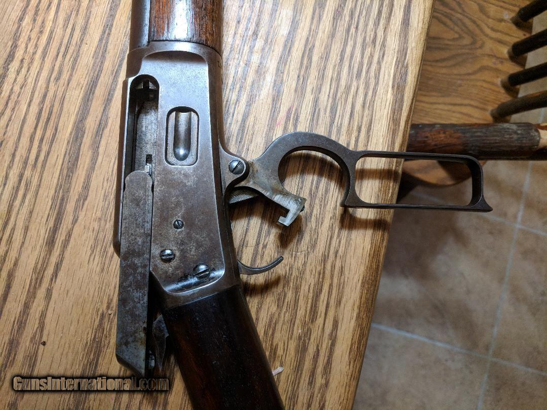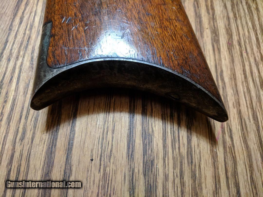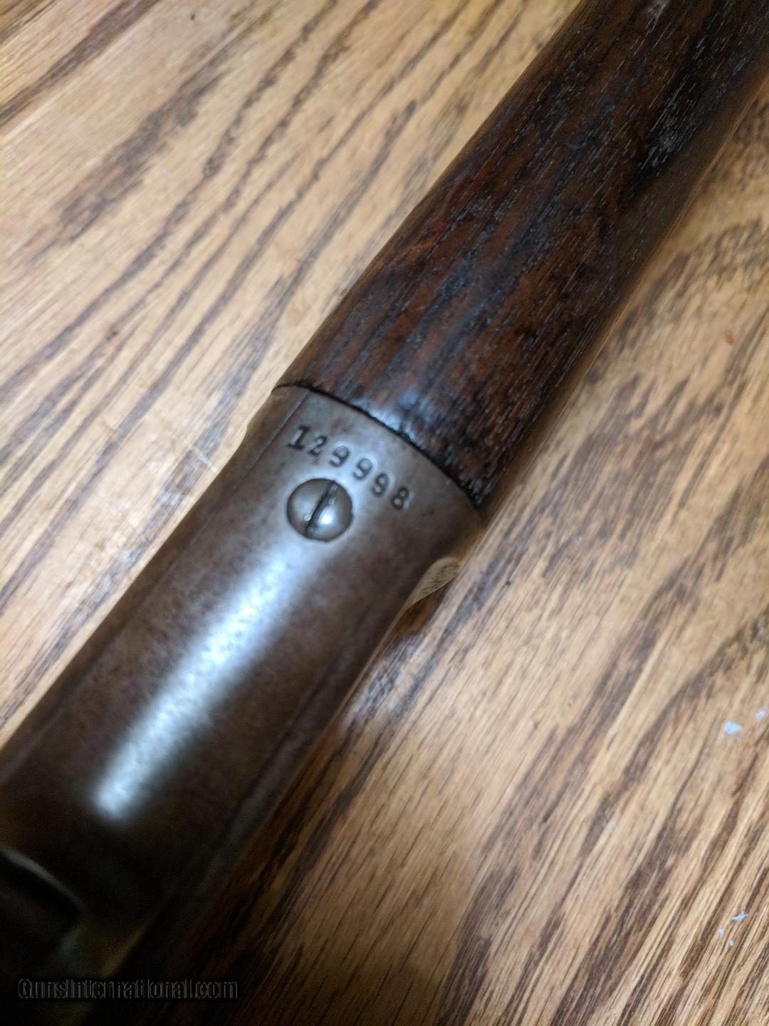 Description: This is second year (1895) Model 1894 Marin Rifle chambered in .32W. It has a full length magizine with a 24" round barrel. It has a crescent buttplate and a factory extra, globe style fornt sight that folds accordingly. The rifling is very strong and the bore is pit free. The barrel has strong bluing and the reciever has grayed with age. The wood has the standard 125 years worth ofs and bruises but no cracks. Nothing has been refinished. The rifle cycles very nicely. A nice untouched rifle. $40 additional for shipping SOLD Antique: Yes Manufacturer: Marlin Model: 1894 Serial Number: 129998 Caliber Info: .32W Bore: very good Bore Condition: very good |