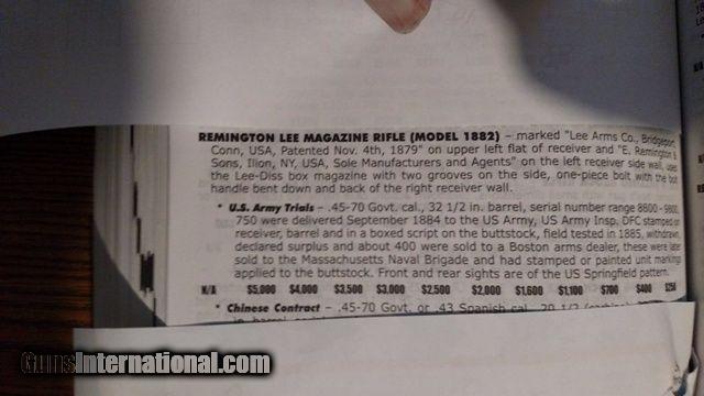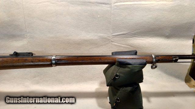 Description: Remington-Lee 1882 USA Army trials rifle Box Magazine 321/2" barrel. Serial numbers sent to the Army was 8800 to 9800, 750 where delivered Sept 1884, Field Tested in 1885 then Withdrawn and declaired surplus! This one has serial 9679 Extremely rare find, and a gun that needs to go to a great collector, I've marked this to sell! The Navy used this same gun with a defferent barrel length! So if your interesst in one of the first bolt action rifles of this country look here SOLD Antique: Yes Manufacturer: Remington-Lee Model: Remington-Lee 1882 Patented 1879 Serial Number: 9679 Caliber Info: 54-70 Bore: Good Chambers: Good Ejectors: Good Condition: Good Metal Condition: Good Wood Condition: Great Bore Condition: Great Barrel Type: Rifled Action: Bolt |