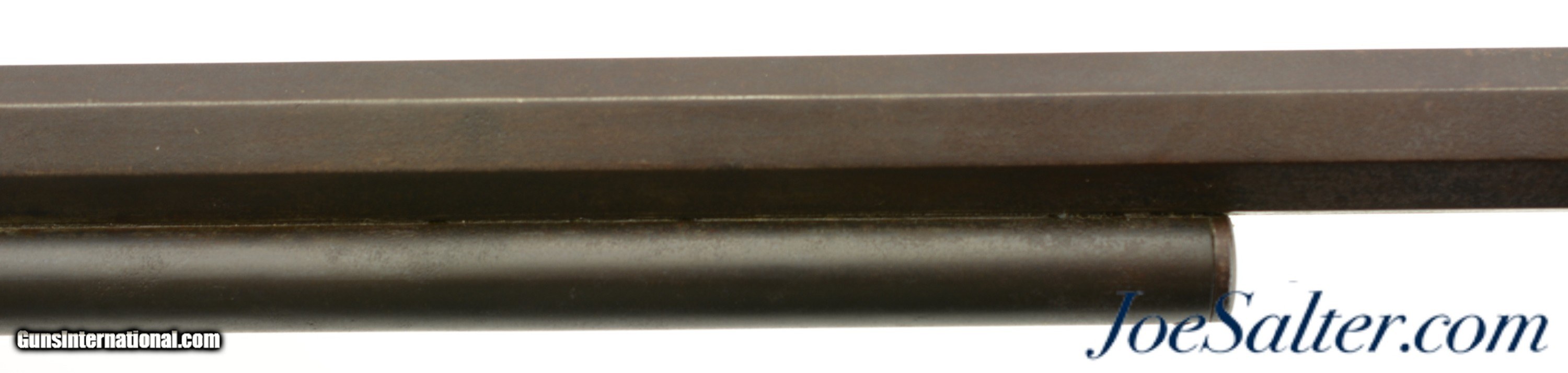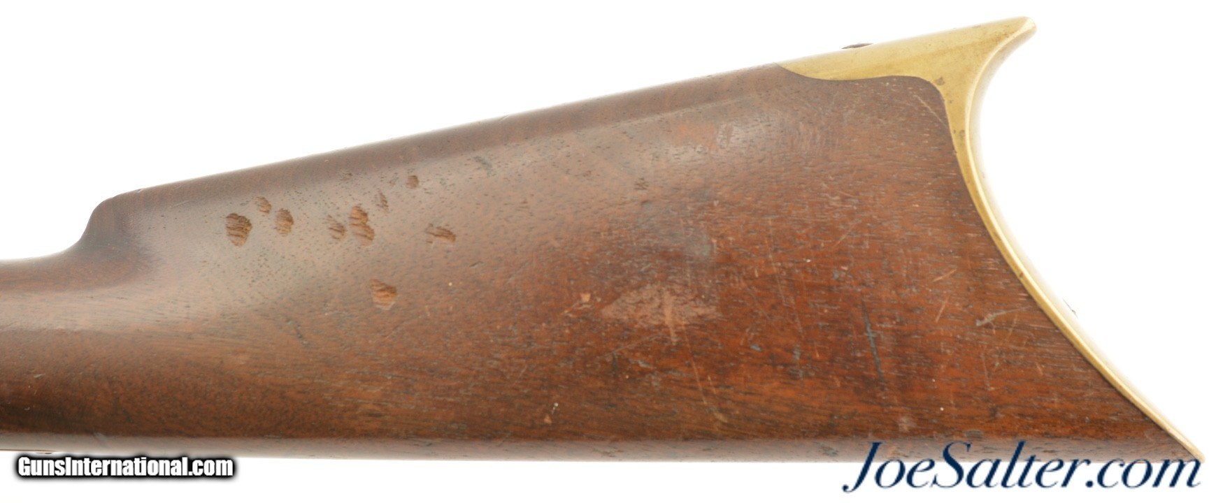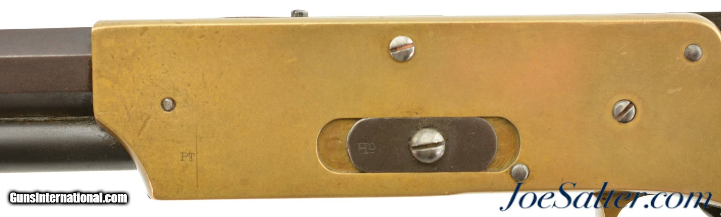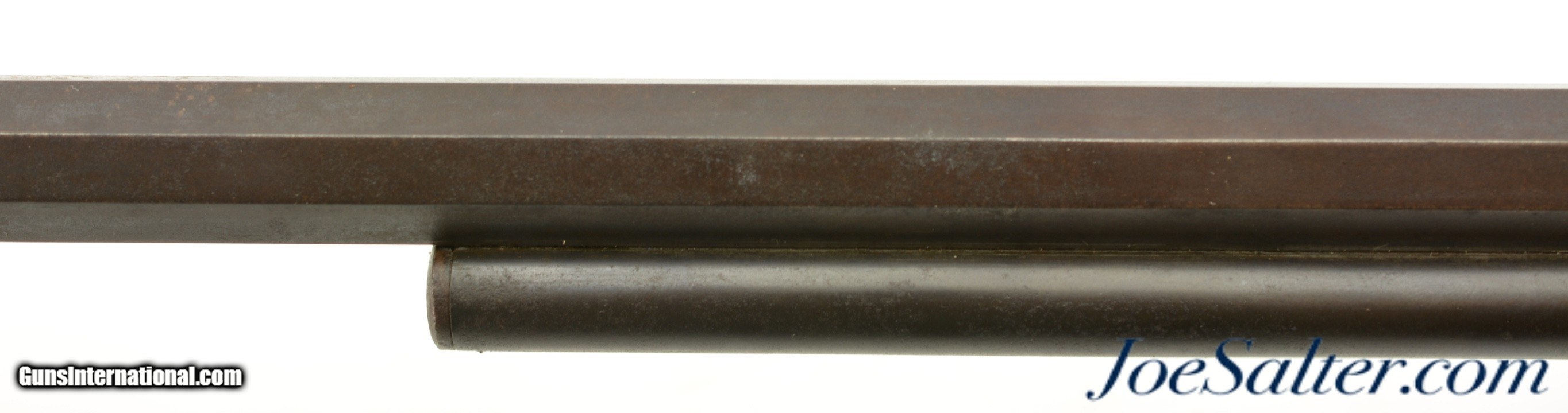 Description: Serial #139, .44 RF, 26" octagon barrel with a very good bore that has minor pitting and freckling within the grooves. This is a plain, but handsome rifle, built on Orville Robinson’s April 23, 1872, patent, and utilizes a manually-operated toggle lock that rides in a mortise along the top of the receiver operated via a knurled handle on the right side. The brass frame has an overall dull yellow-ochre patina with a series of small impact marks on the forward portion of the left side of the frame surrounding the end of the barrel pin. There are some obvious tool marks on the right side with the head of the barrel pin made to fit flush with the surrounding brass. The bolt, rear toggle, and loading gate cover have an overall gray and plum-brown patina with some faint traces of the original blue on the edges of the bolt. The barrel has an overall plum-brown patina with silvering at the muzzle and long the barrel facets, while the magazine tube a similar patina but with about 20-25% of the original blue remaining. A period German silver front sight blade and original rear sight are installed, however the rear sight is bent upwards and is missing the elevation adjustment thumbwheel. The walnut buttstock is in good shape, with minor handling marks and small blemishes scattered about, a series of impact bruises on the left side below the comb, and some short stress cracks on the left side of the wrist running back from the frame juncture. This is a really nice example of a rare American repeating rifle, and is in very good plus condition overall. Antique; ;/b>; Orville Moses Robinson was an upstate New York gunsmith and inventor who received three US patents for breech-loading and repeating firearms. In 1870 Robinson, in partnership with A.S. Babbitt and two others, formed the Adirondack Firearms Co. to manufacture rifles based on his patents at their manufactory in Plattsburgh, NY. The firm is known to have employed Daniel Wilkinson (possibly J.D. Wilkinson, another upstate New York gunmaker and inventor)) and Robinson’s son, William (who would’ve been about 10 years old at the formation of the company!) Adirondack Firearms Co. operated until 1874, ultimately producing what is thought to be slightly fewer than 1,000 rifles of all types, when it was purchased by the Winchester Repeating Arms Co. and permanently shut down. The Adirondack Firearms Co., and Robinson’s repeating rifle designs, represent an interesting footnote in the then rapidly advancing field of repeating breechloading long guns. ; Antique: Yes Price: $5,495.00 Contact Seller |