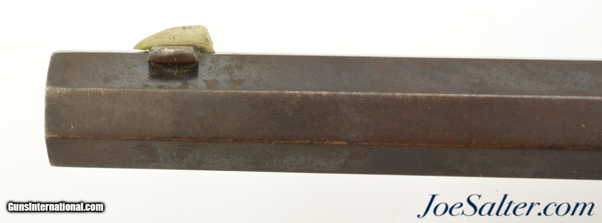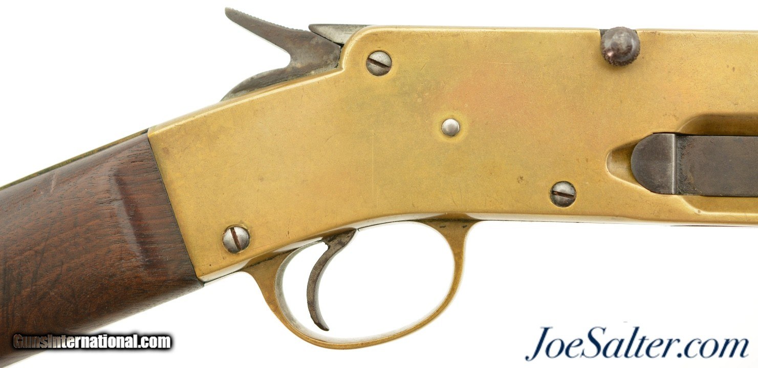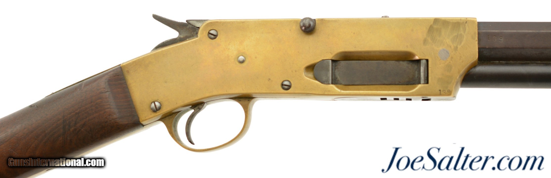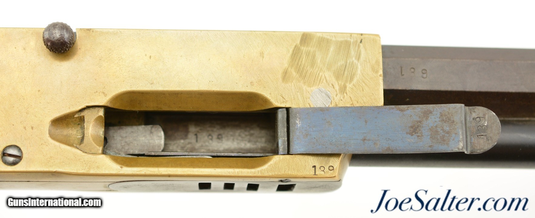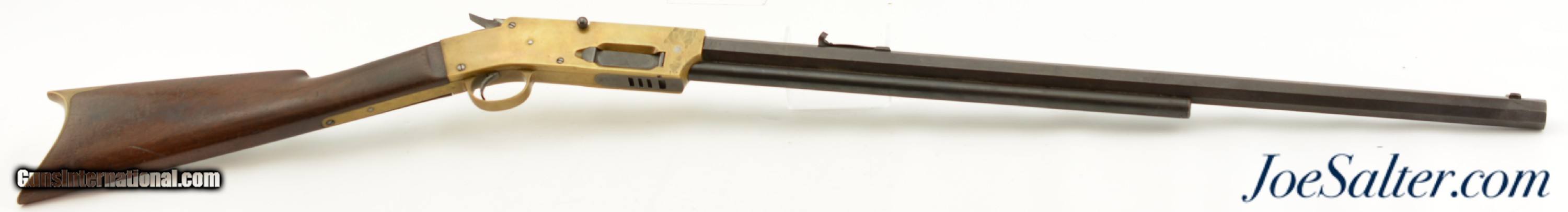 Description: Serial #139, .44 RF, 26" octagon barrel with a very good bore that has minor pitting and freckling within the grooves. This is a plain, but handsome rifle, built on Orville Robinson’s April 23, 1872, patent, and utilizes a manually-operated toggle lock that rides in a mortise along the top of the receiver operated via a knurled handle on the right side. The brass frame has an overall dull yellow-ochre patina with a series of small impact marks on the forward portion of the left side of the frame surrounding the end of the barrel pin. There are some obvious tool marks on the right side with the head of the barrel pin made to fit flush with the surrounding brass. The bolt, rear toggle, and loading gate cover have an overall gray and plum-brown patina with some faint traces of the original blue on the edges of the bolt. The barrel has an overall plum-brown patina with silvering at the muzzle and long the barrel facets, while the magazine tube a similar patina but with about 20-25% of the original blue remaining. A period German silver front sight blade and original rear sight are installed, however the rear sight is bent upwards and is missing the elevation adjustment thumbwheel. The walnut buttstock is in good shape, with minor handling marks and small blemishes scattered about, a series of impact bruises on the left side below the comb, and some short stress cracks on the left side of the wrist running back from the frame juncture. This is a really nice example of a rare American repeating rifle, and is in very good plus condition overall. Antique; ;/b>; Orville Moses Robinson was an upstate New York gunsmith and inventor who received three US patents for breech-loading and repeating firearms. In 1870 Robinson, in partnership with A.S. Babbitt and two others, formed the Adirondack Firearms Co. to manufacture rifles based on his patents at their manufactory in Plattsburgh, NY. The firm is known to have employed Daniel Wilkinson (possibly J.D. Wilkinson, another upstate New York gunmaker and inventor)) and Robinson’s son, William (who would’ve been about 10 years old at the formation of the company!) Adirondack Firearms Co. operated until 1874, ultimately producing what is thought to be slightly fewer than 1,000 rifles of all types, when it was purchased by the Winchester Repeating Arms Co. and permanently shut down. The Adirondack Firearms Co., and Robinson’s repeating rifle designs, represent an interesting footnote in the then rapidly advancing field of repeating breechloading long guns. ; Antique: Yes Price: $5,495.00 Contact Seller |