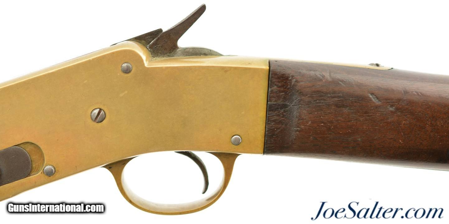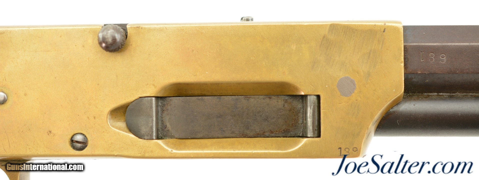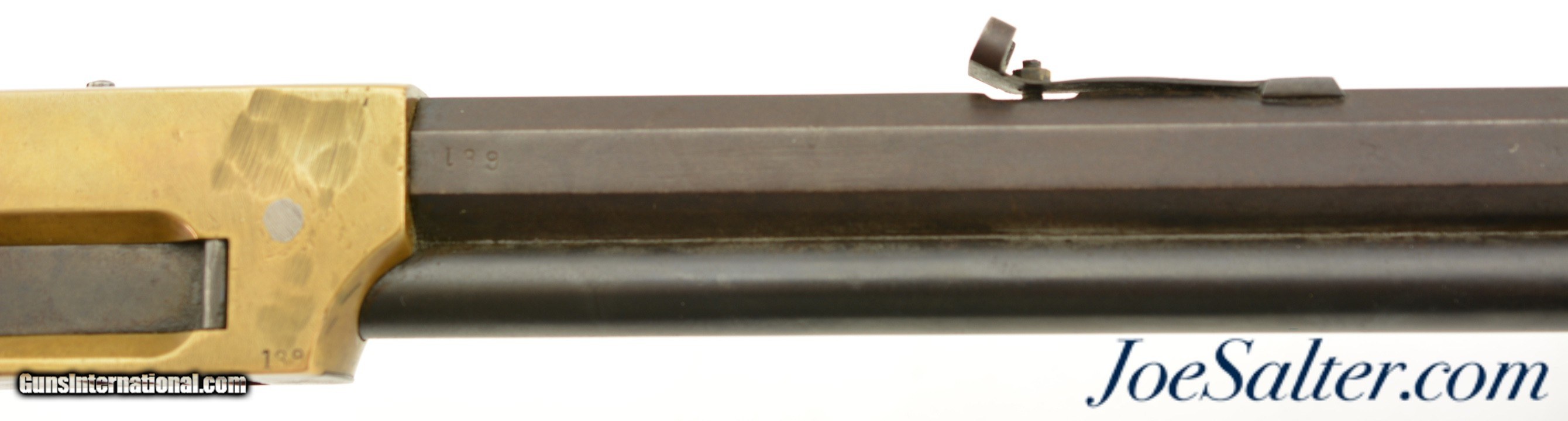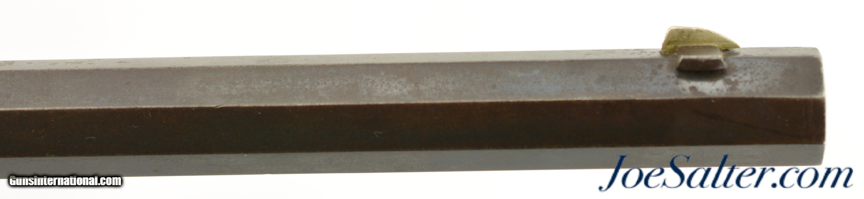 Description: Serial #139, .44 RF, 26" octagon barrel with a very good bore that has minor pitting and freckling within the grooves. This is a plain, but handsome rifle, built on Orville Robinson’s April 23, 1872, patent, and utilizes a manually-operated toggle lock that rides in a mortise along the top of the receiver operated via a knurled handle on the right side. The brass frame has an overall dull yellow-ochre patina with a series of small impact marks on the forward portion of the left side of the frame surrounding the end of the barrel pin. There are some obvious tool marks on the right side with the head of the barrel pin made to fit flush with the surrounding brass. The bolt, rear toggle, and loading gate cover have an overall gray and plum-brown patina with some faint traces of the original blue on the edges of the bolt. The barrel has an overall plum-brown patina with silvering at the muzzle and long the barrel facets, while the magazine tube a similar patina but with about 20-25% of the original blue remaining. A period German silver front sight blade and original rear sight are installed, however the rear sight is bent upwards and is missing the elevation adjustment thumbwheel. The walnut buttstock is in good shape, with minor handling marks and small blemishes scattered about, a series of impact bruises on the left side below the comb, and some short stress cracks on the left side of the wrist running back from the frame juncture. This is a really nice example of a rare American repeating rifle, and is in very good plus condition overall. Antique; ;/b>; Orville Moses Robinson was an upstate New York gunsmith and inventor who received three US patents for breech-loading and repeating firearms. In 1870 Robinson, in partnership with A.S. Babbitt and two others, formed the Adirondack Firearms Co. to manufacture rifles based on his patents at their manufactory in Plattsburgh, NY. The firm is known to have employed Daniel Wilkinson (possibly J.D. Wilkinson, another upstate New York gunmaker and inventor)) and Robinson’s son, William (who would’ve been about 10 years old at the formation of the company!) Adirondack Firearms Co. operated until 1874, ultimately producing what is thought to be slightly fewer than 1,000 rifles of all types, when it was purchased by the Winchester Repeating Arms Co. and permanently shut down. The Adirondack Firearms Co., and Robinson’s repeating rifle designs, represent an interesting footnote in the then rapidly advancing field of repeating breechloading long guns. ; Antique: Yes Price: $5,495.00 Contact Seller |