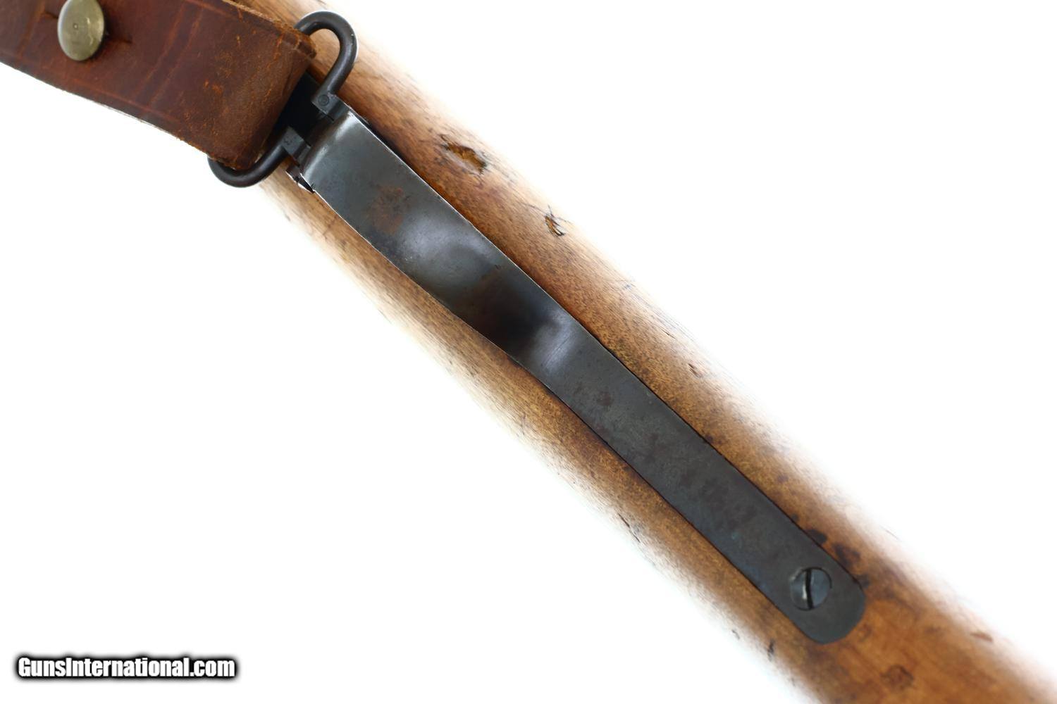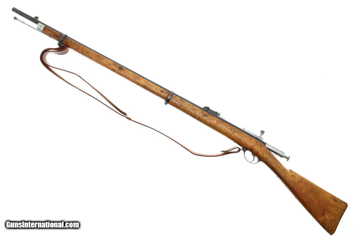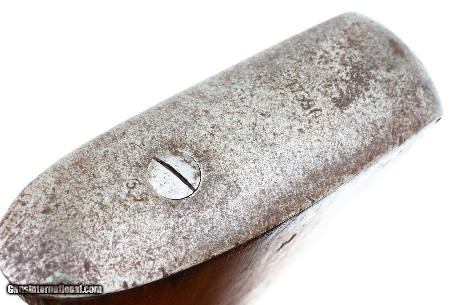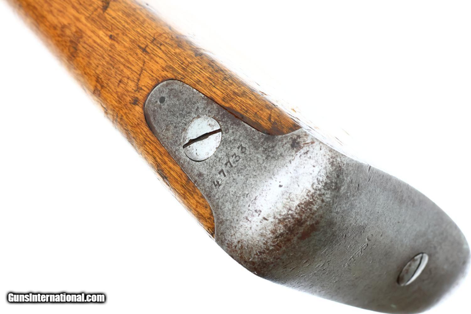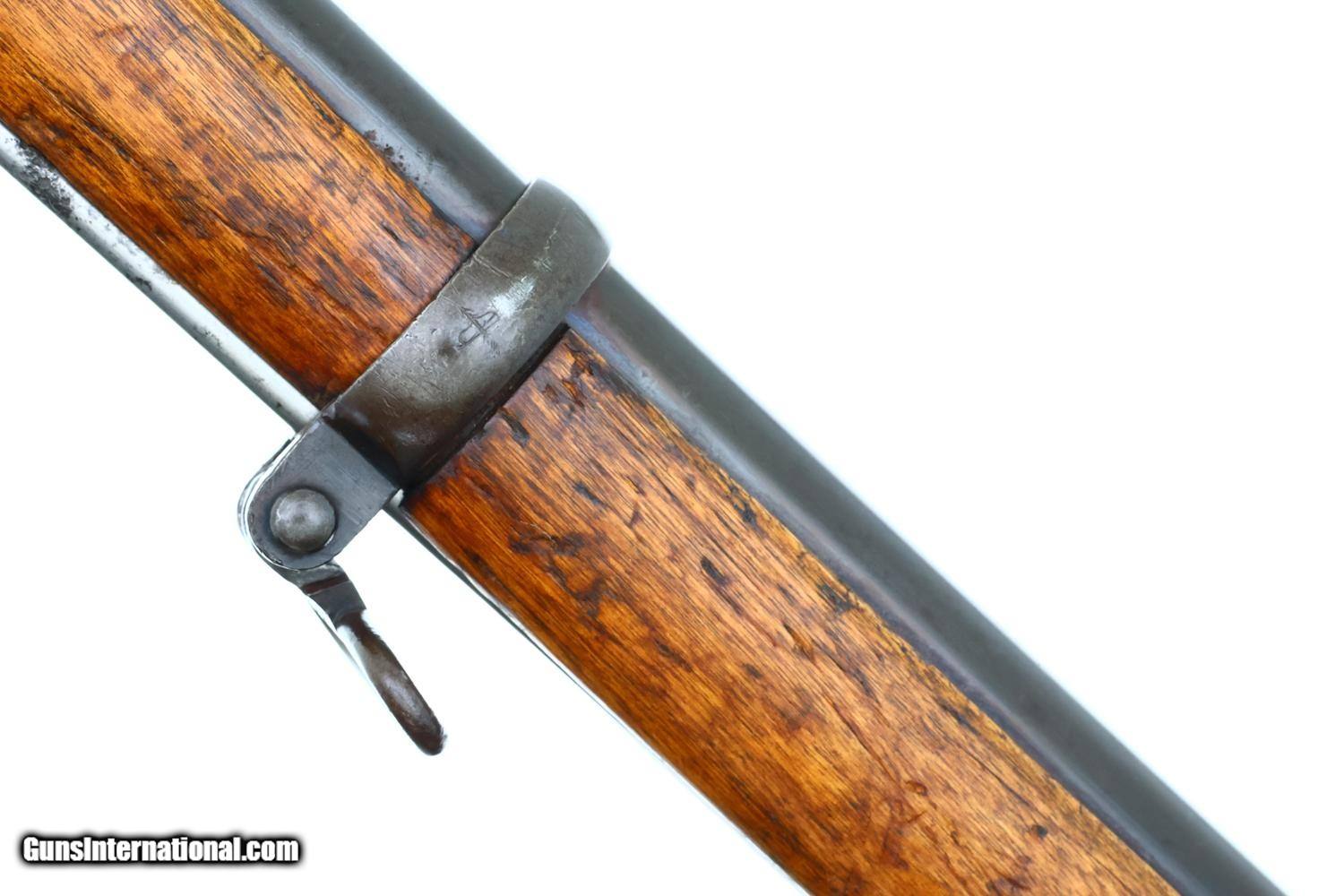 VG original finish with the blue on the barrel, receiver, and trigger guard with handling marks and toning as one would expect from a military service rifle that is now about 150 years old. Comparable considerations apply to the in-the-white bolt with staining, the cleaning rod with patches of oxidation. Stock with areas of cleaning and light sanding, still with numerous handling marks and gouges as carefully photographed. Surprisingly bright, near mirror bore. Correct manual mechanics.
