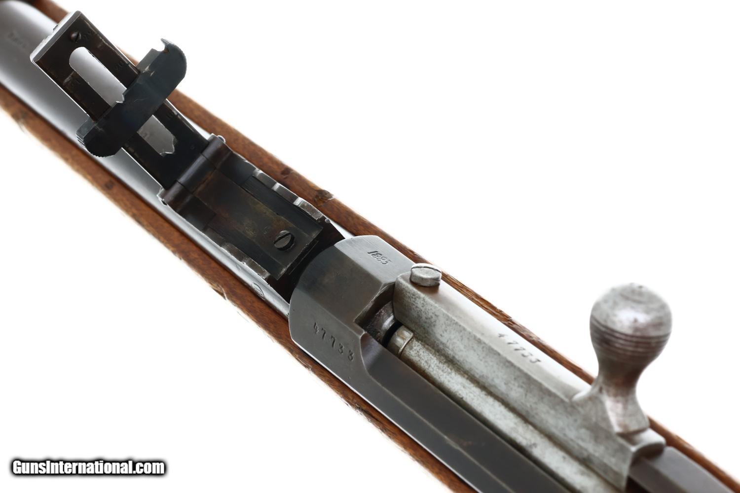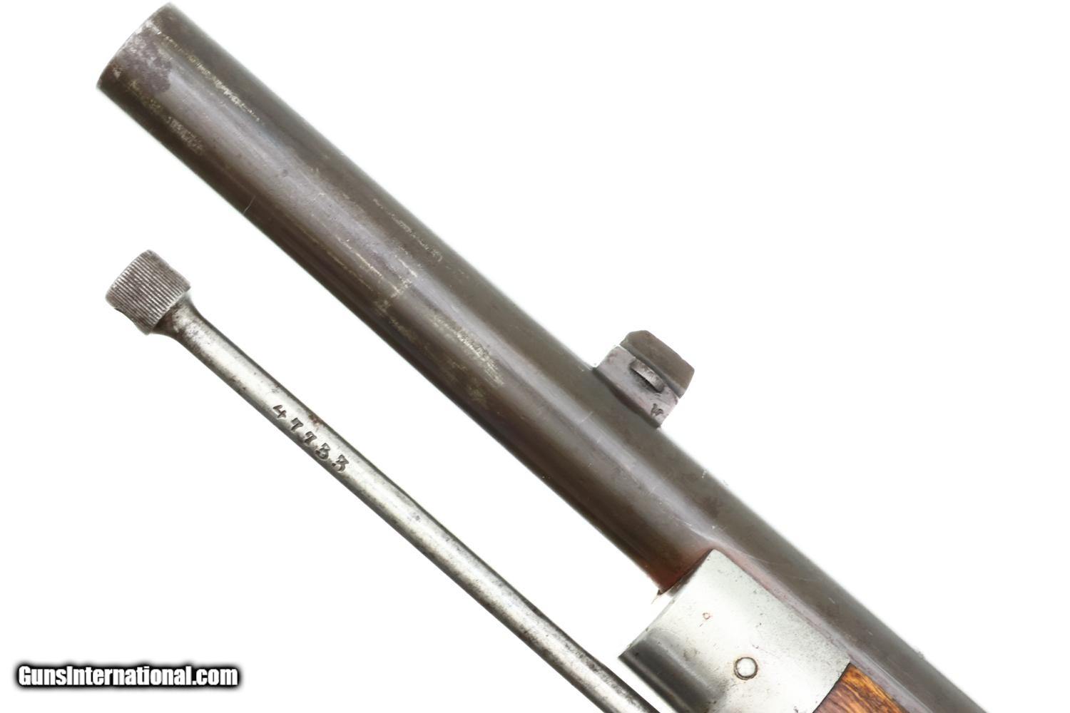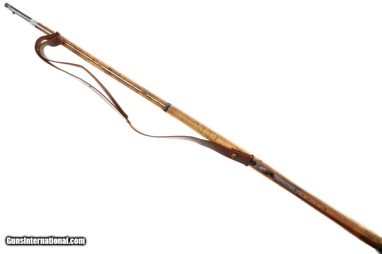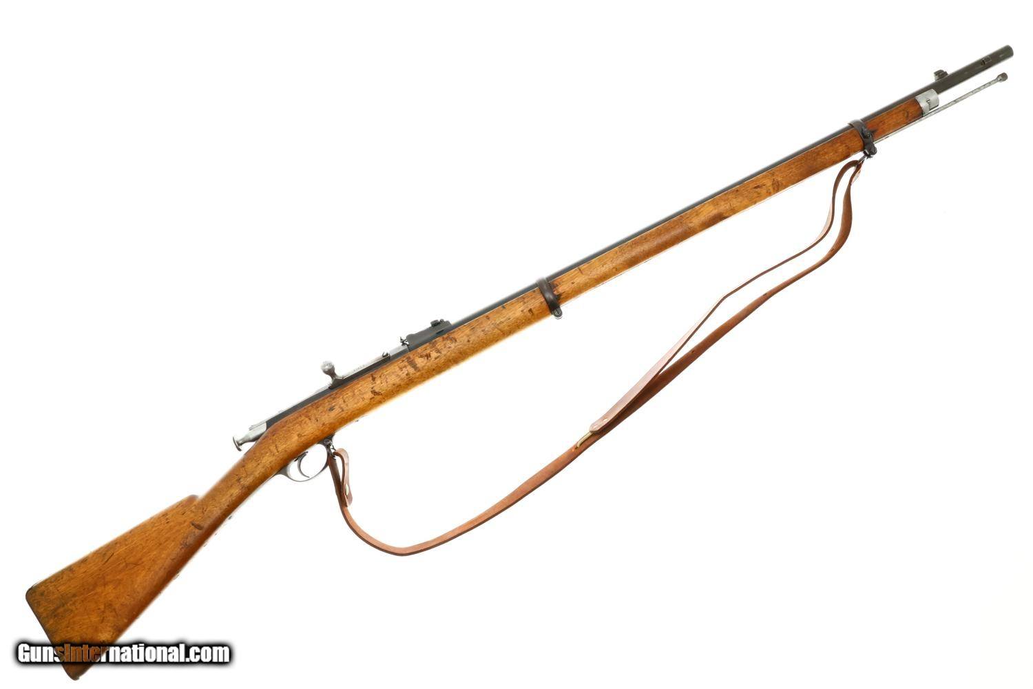 VG original finish with the blue on the barrel, receiver, and trigger guard with handling marks and toning as one would expect from a military service rifle that is now about 150 years old. Comparable considerations apply to the in-the-white bolt with staining, the cleaning rod with patches of oxidation. Stock with areas of cleaning and light sanding, still with numerous handling marks and gouges as carefully photographed. Surprisingly bright, near mirror bore. Correct manual mechanics.