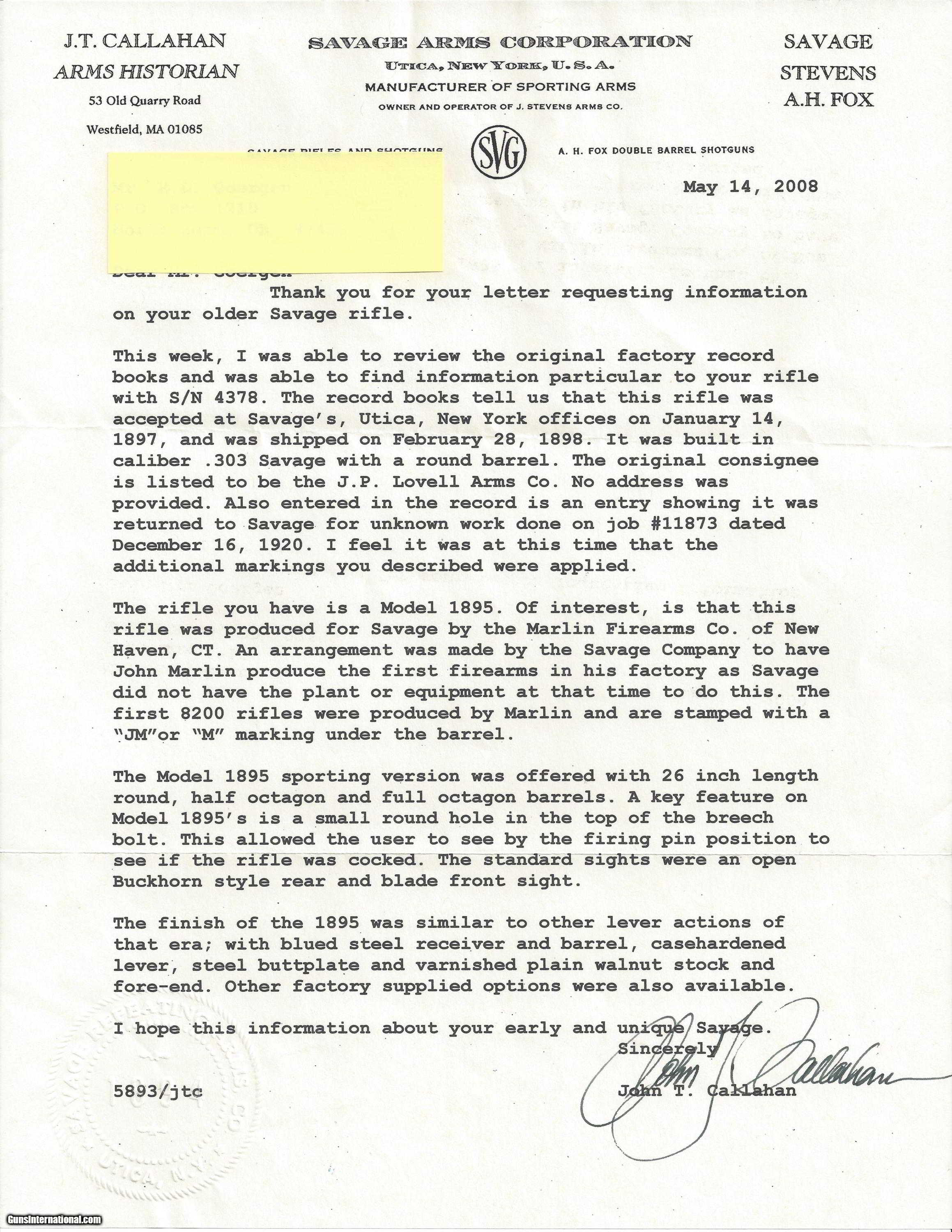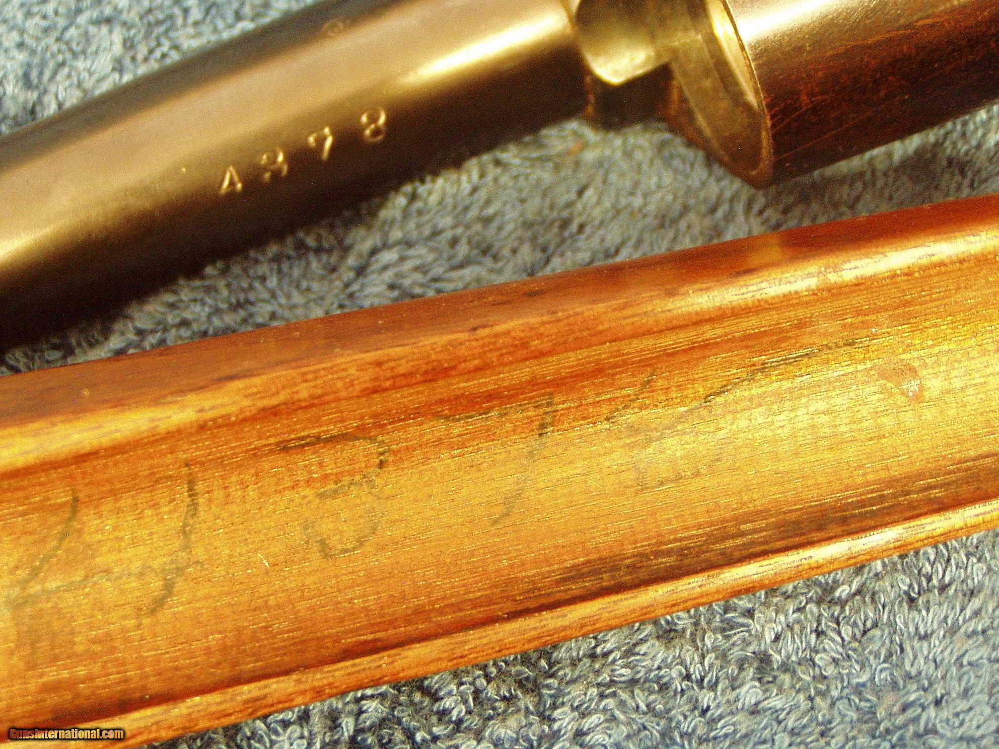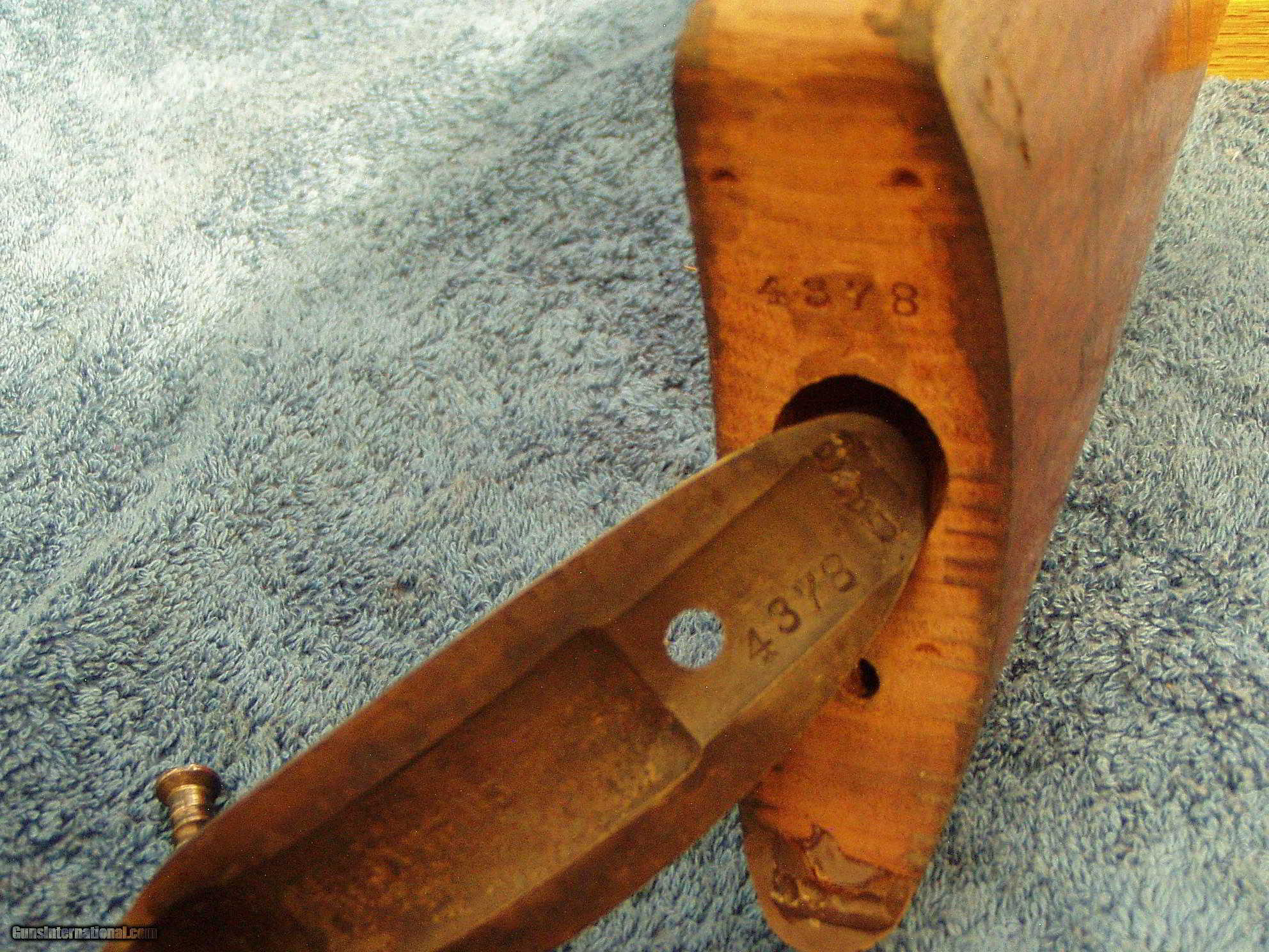 Description: This Savage 1895 is in excellent condotion. Has a 26" round barrel with an excellent bore. Action is smooth and it locks up tight. Original "Rocky Mountain", front and rear sights.The metal retains is "Fire" Blue" finish of approx. 95%+. Lots of case color remains on lever and buttplate. Serial number is #4378 and is found on the bottom of the reciever, buttstock, buttplate, forearm and barrel. Also has the "JM" in oval Marlin Mark. Appears this was sent back to factory in 1920 for unknown work. Wood still has lots of original varnish. Does show some light handling marks. and well done small wood repairs. Comes with Historical Letter. Buyer pays $35.00 shipping to lower 48 states. I accept USPS Money Orders or Bank Cashier's Check. Will accept personal check, with shipping hold. I can send more photos. ANTIQUE. SOLD Antique: Yes Manufacturer: SAVAGE REPEATING ARMS CORPORATION Model: Model 1895 Serial Number: #4378 Caliber Info: .303 savage Bore: 26 Ejectors: lever action Condition: excellent Metal Condition: excellent Wood Condition: solid, very good Bore Condition: excellent Barrel Type: round Action: Lever Action Triggers: one Stock: Wood Fore End: wood Butt Pad: steel Finish: Blued Weight: 12.7 lbs. Sights: open Manufacture Date: 1897 |
