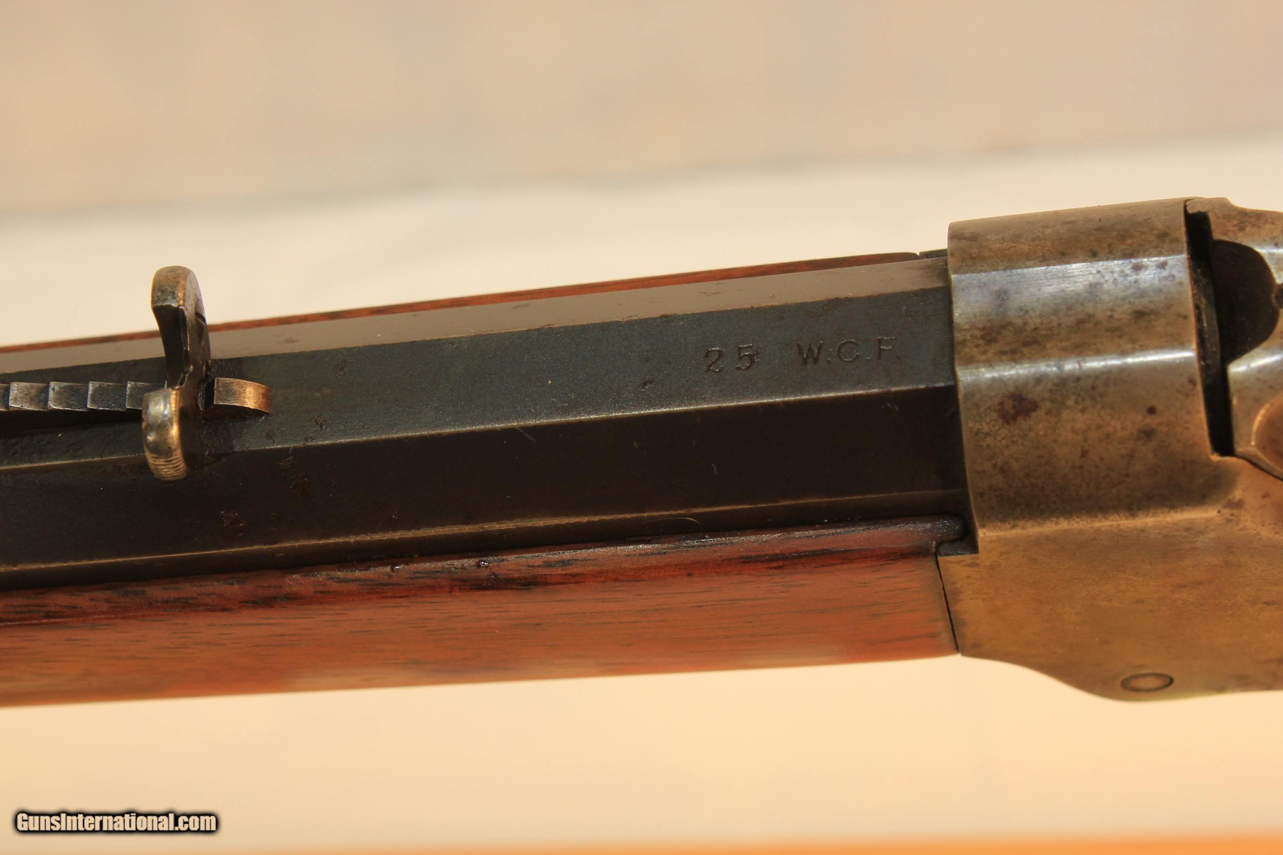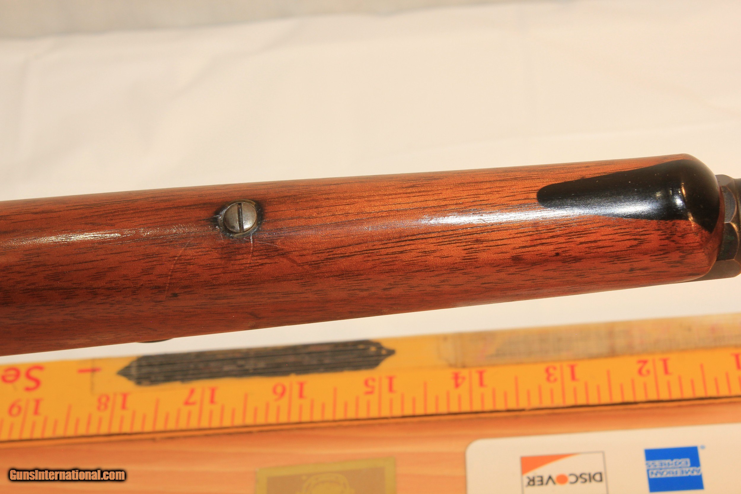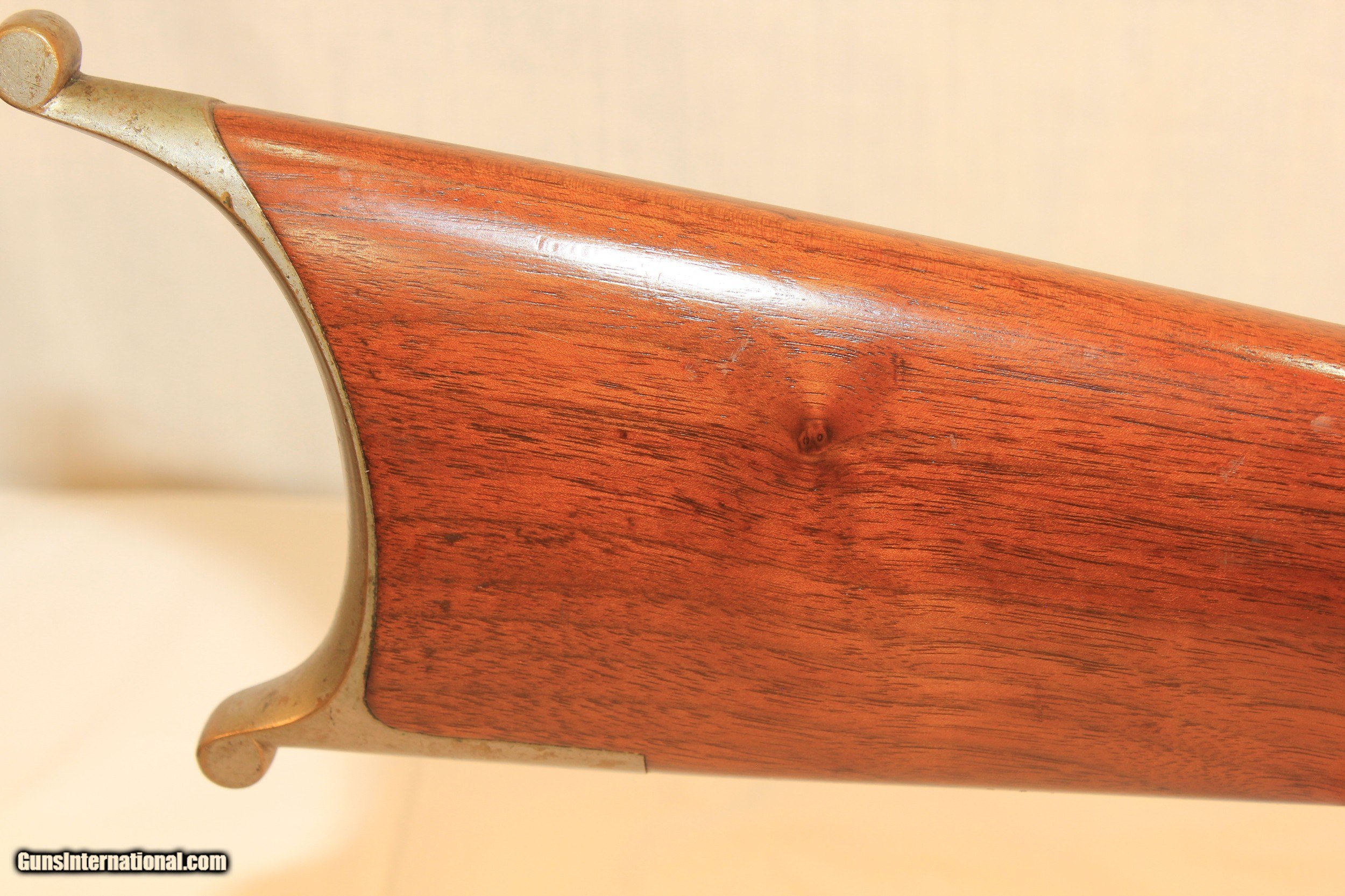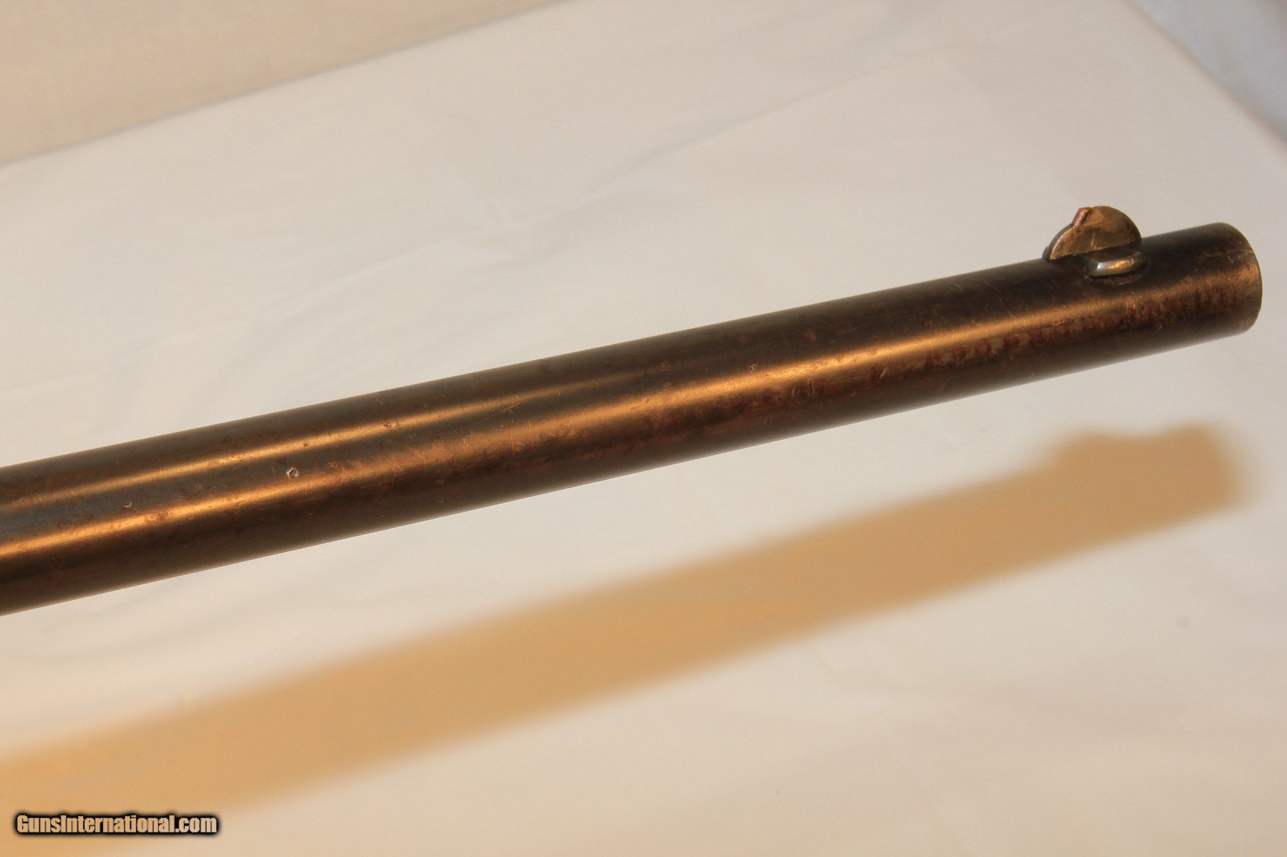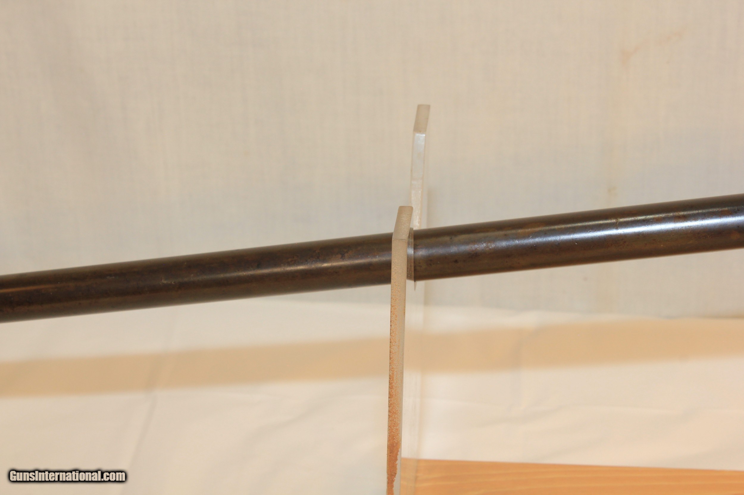 Description: Special order Winchester Model 1885 Low wall rifle in 25-20WCF caliber with a half octagon No. 1 barrel with a fare bore that shows only remains of rifling with pitting the full length.This is a rather attractive rifle with a nice exterior look, the barrel a mix of plum brown and a dark gray blue, with wear to pewter at the muzzle and sharp edges of the octagon section. There are scattered oxidation stains primarily to the round section with a handful of handling marks and dings scattered about the surface and an area of light pitting. The frame and attendant parts are a pleasing smooth smoky mottled case hardened patina with some traces of case colors. The buttstock rates very good to fine showing a bit of older added finish and a couple of repares here and there. The buttstock wears an original Schuetzen or Swiss style brass buttplate retaining about 95% of it's original nickel plate. The forend rates very good with the ebony tip in place and a few handling marks. Sighted with a Lyman front sight and the original Rocky Mountain rear sight. This would be an excellent candidate for a professional relining to a caliber of your choice. Made in 1890, so no paperwork is required. $50.00 Shipping via Priority Mail. SOLD Antique: Yes |