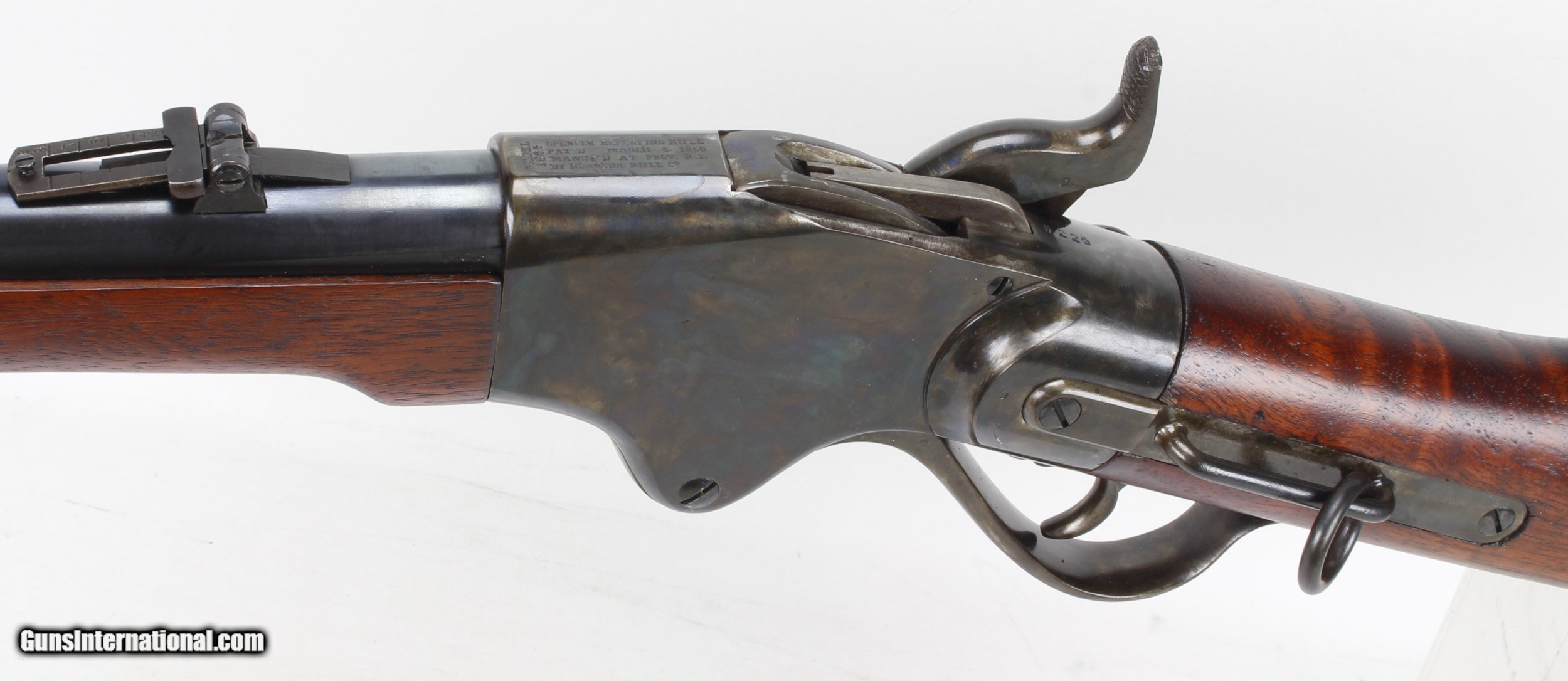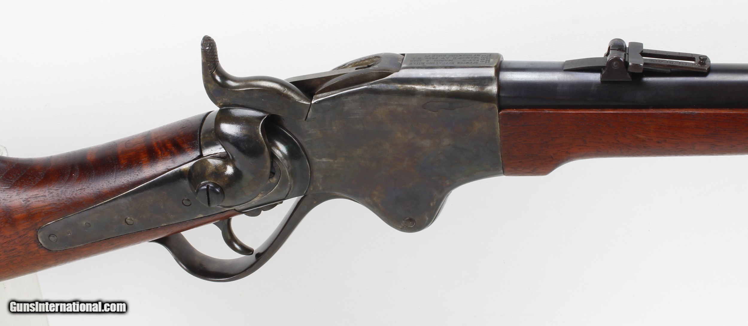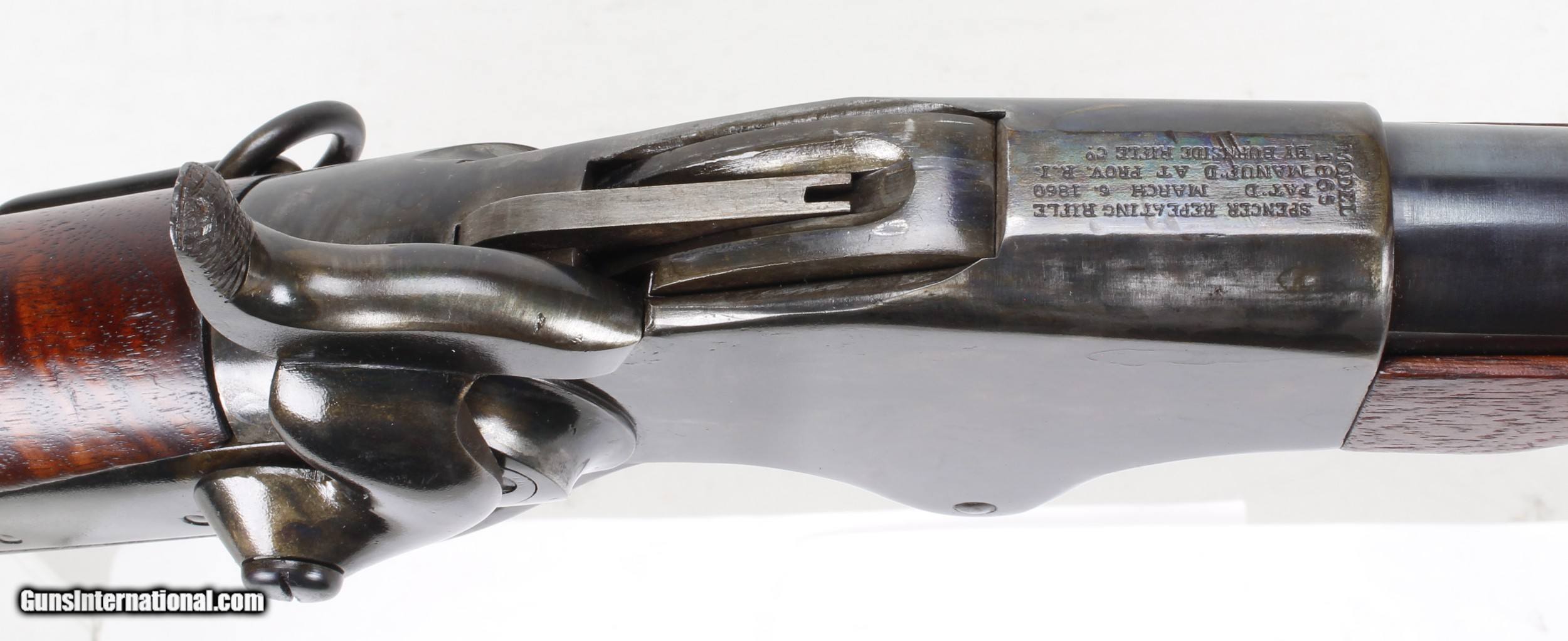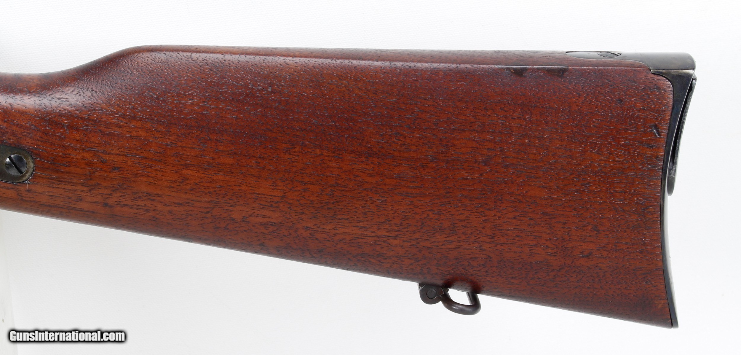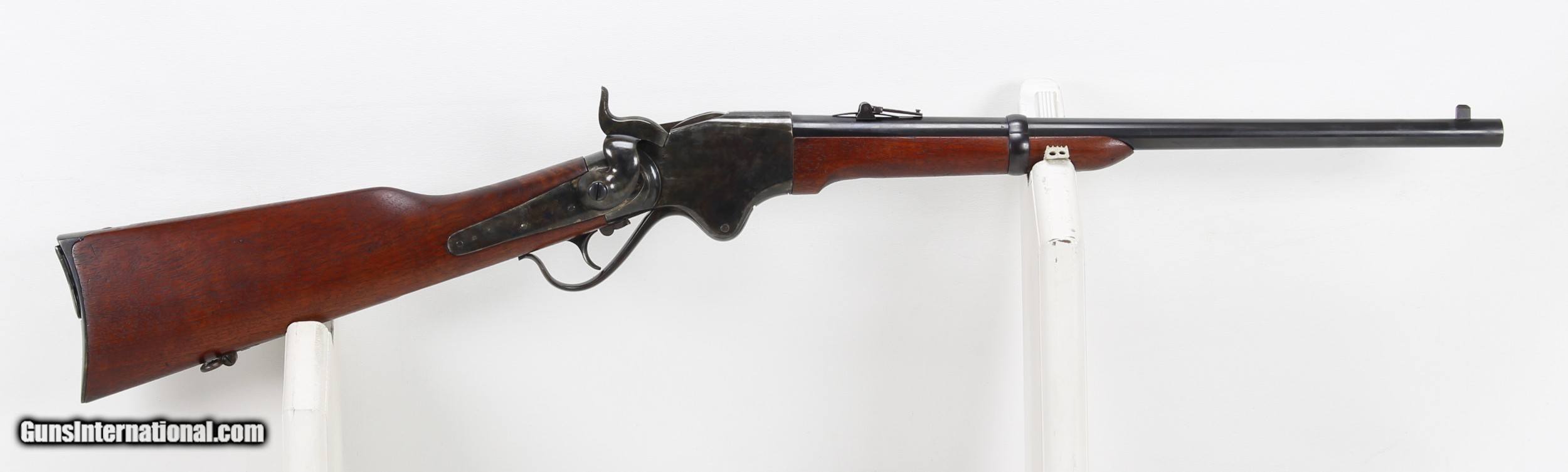 Description: This listing is for a very nice Spencer 1865 Saddle Ring Carbine in 56-50, 20" barrel, s/n: 5229, mfr'd in 1865. This gun is an antique and does not require an FFL. Barrel has been reblued and wood has been refinished. The bore is Very Good for its age, bright with clear rifling and some very minor scattered pitting. Blade front sight, folding rear sight, case colors on receiver, straight-grip walnut stock. Magazine tube has been replaced with a reproduction from S&S parts. Shipping to lower 48 is $50.00. NOTE: THIS IS A RIMFIRE 56-50. SOLD Antique: Yes Rifle Caliber: .50 Spencer |