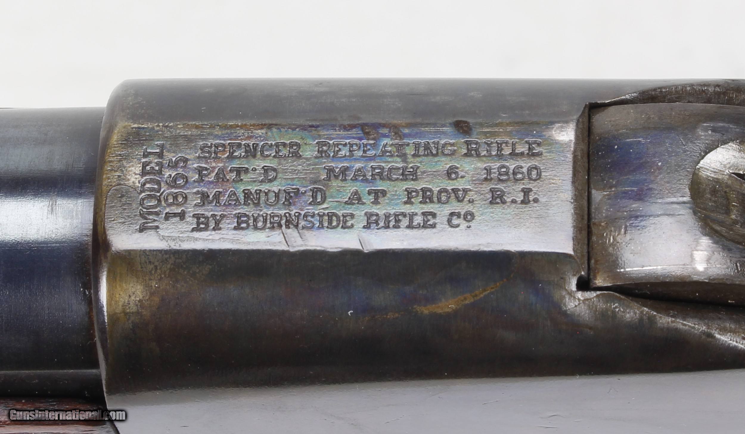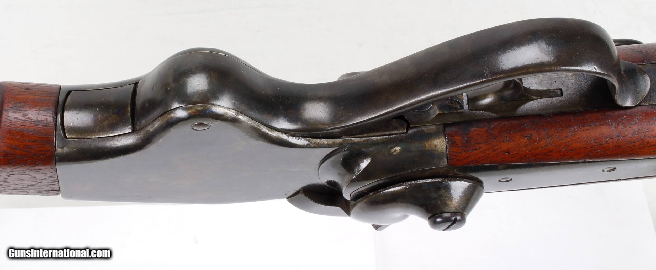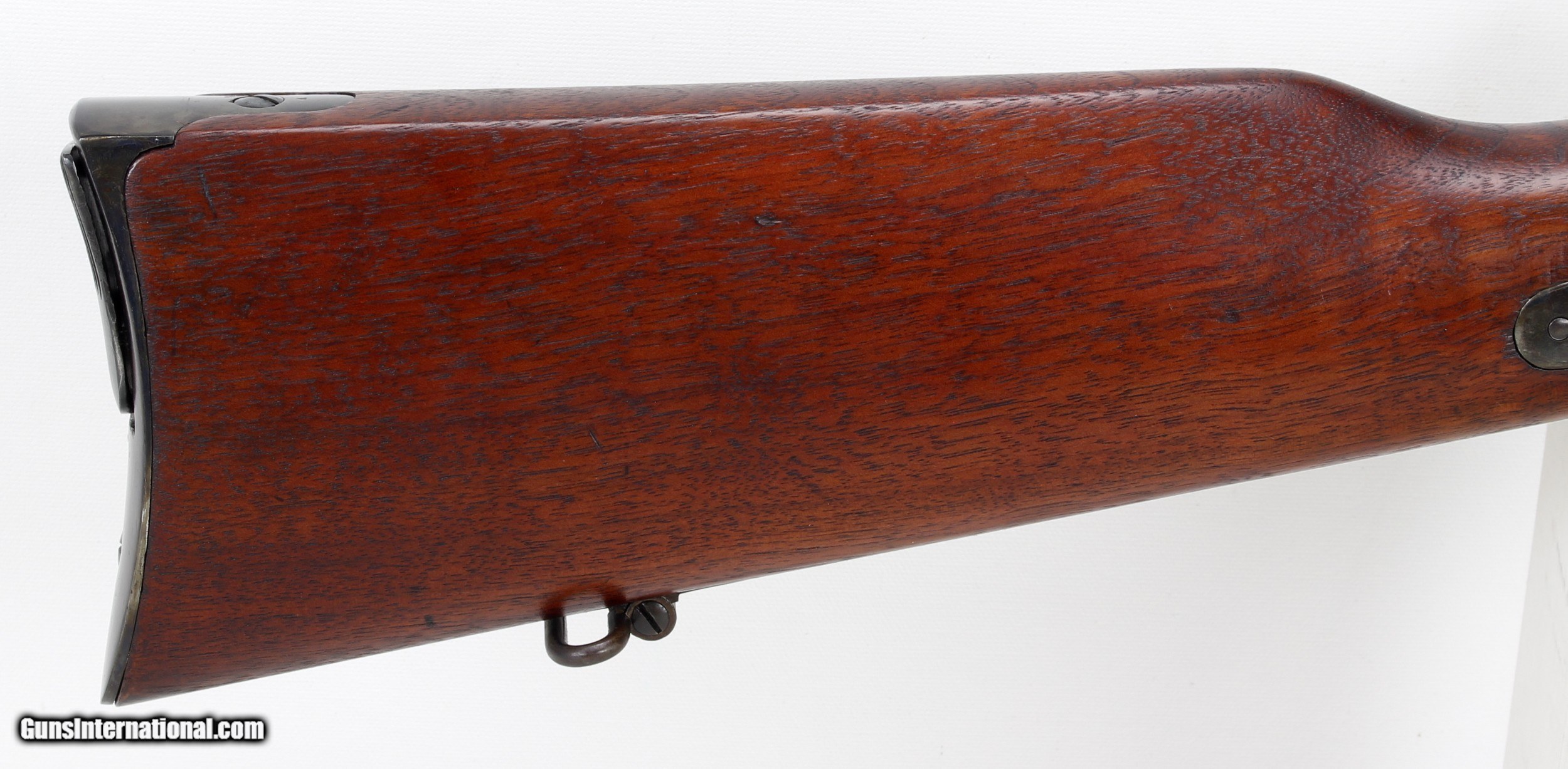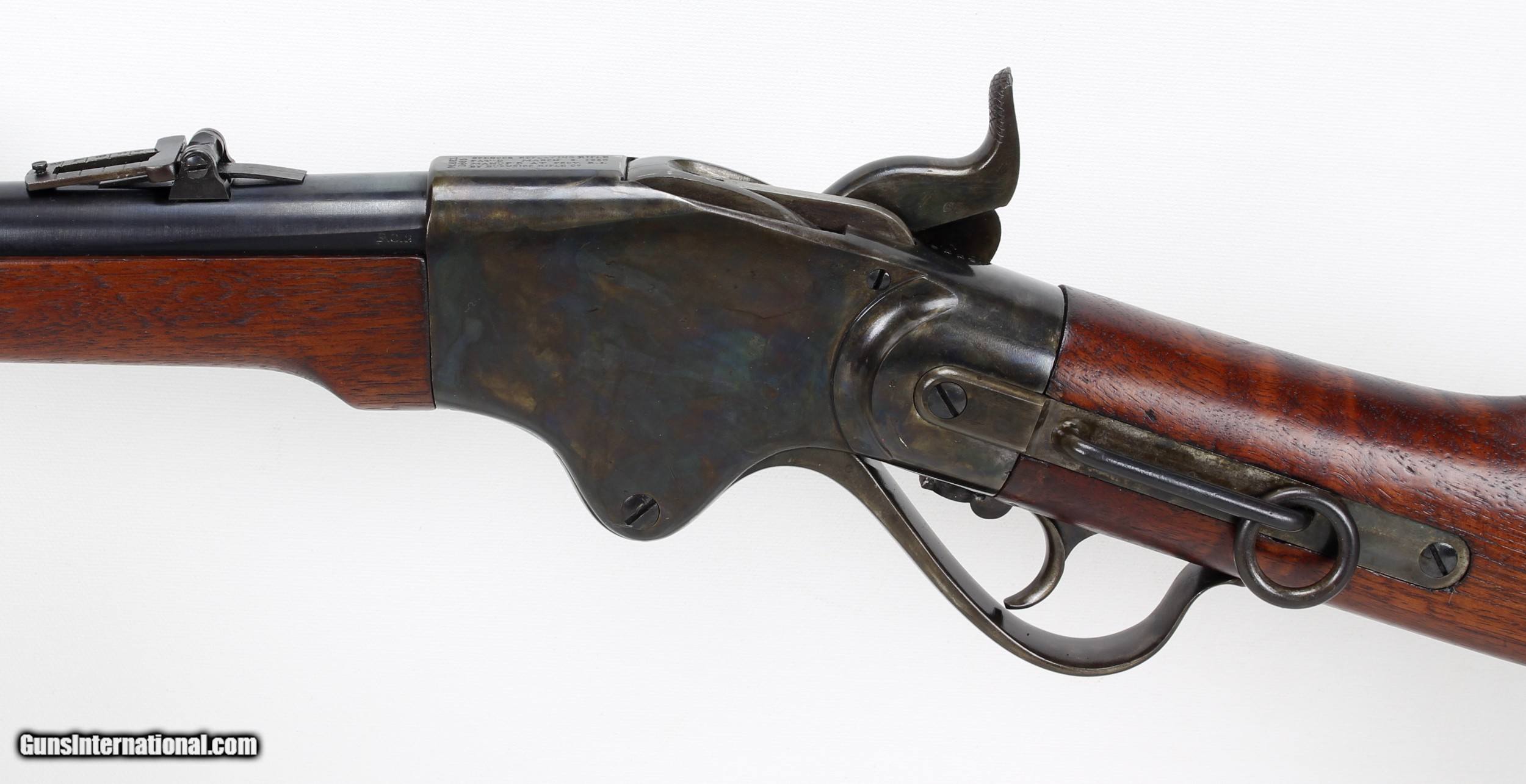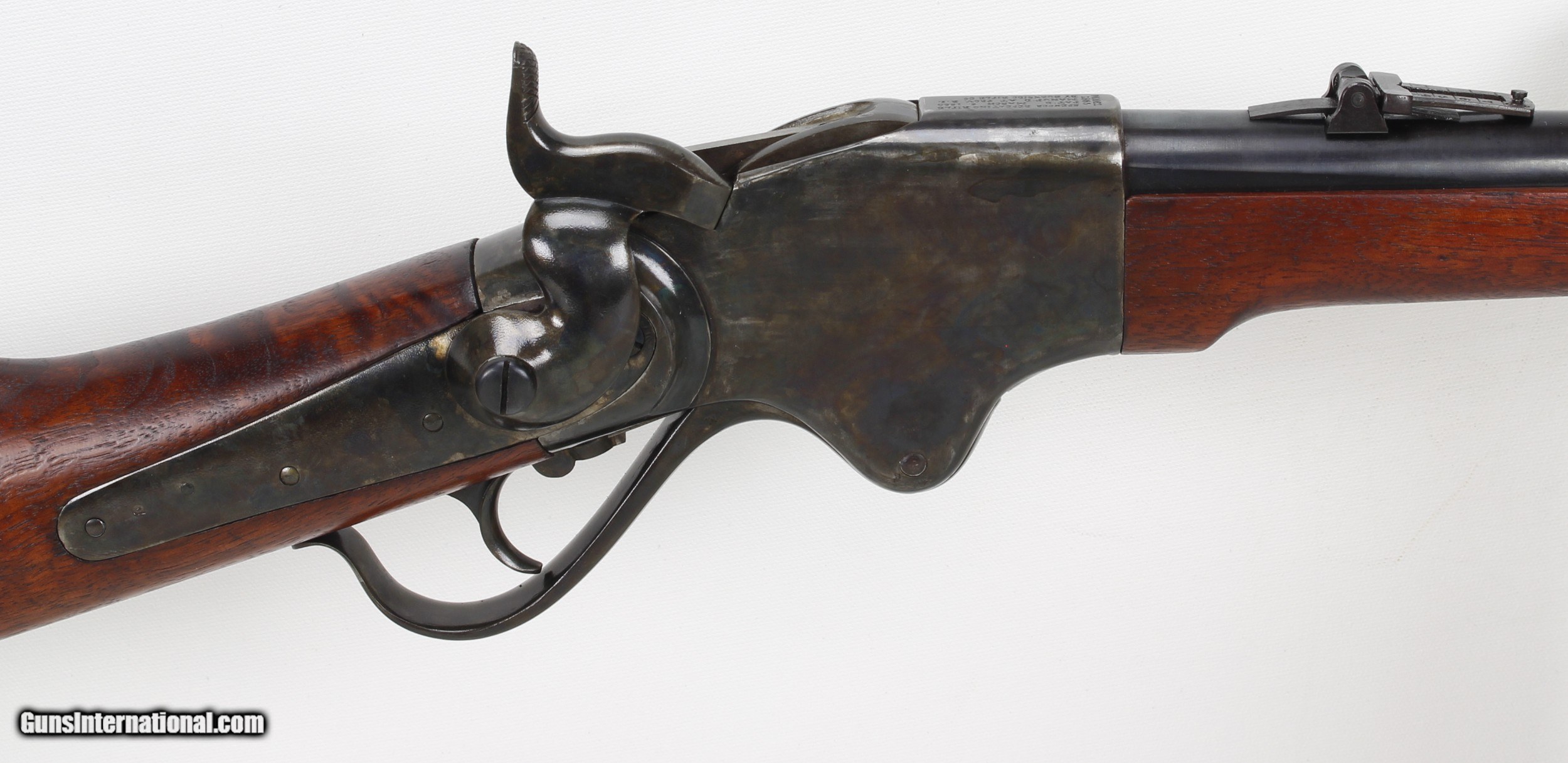 Description: This listing is for a very nice Spencer 1865 Saddle Ring Carbine in 56-50, 20" barrel, s/n: 5229, mfr'd in 1865. This gun is an antique and does not require an FFL. Barrel has been reblued and wood has been refinished. The bore is Very Good for its age, bright with clear rifling and some very minor scattered pitting. Blade front sight, folding rear sight, case colors on receiver, straight-grip walnut stock. Magazine tube has been replaced with a reproduction from S&S parts. Shipping to lower 48 is $50.00. NOTE: THIS IS A RIMFIRE 56-50. SOLD Antique: Yes Rifle Caliber: .50 Spencer |