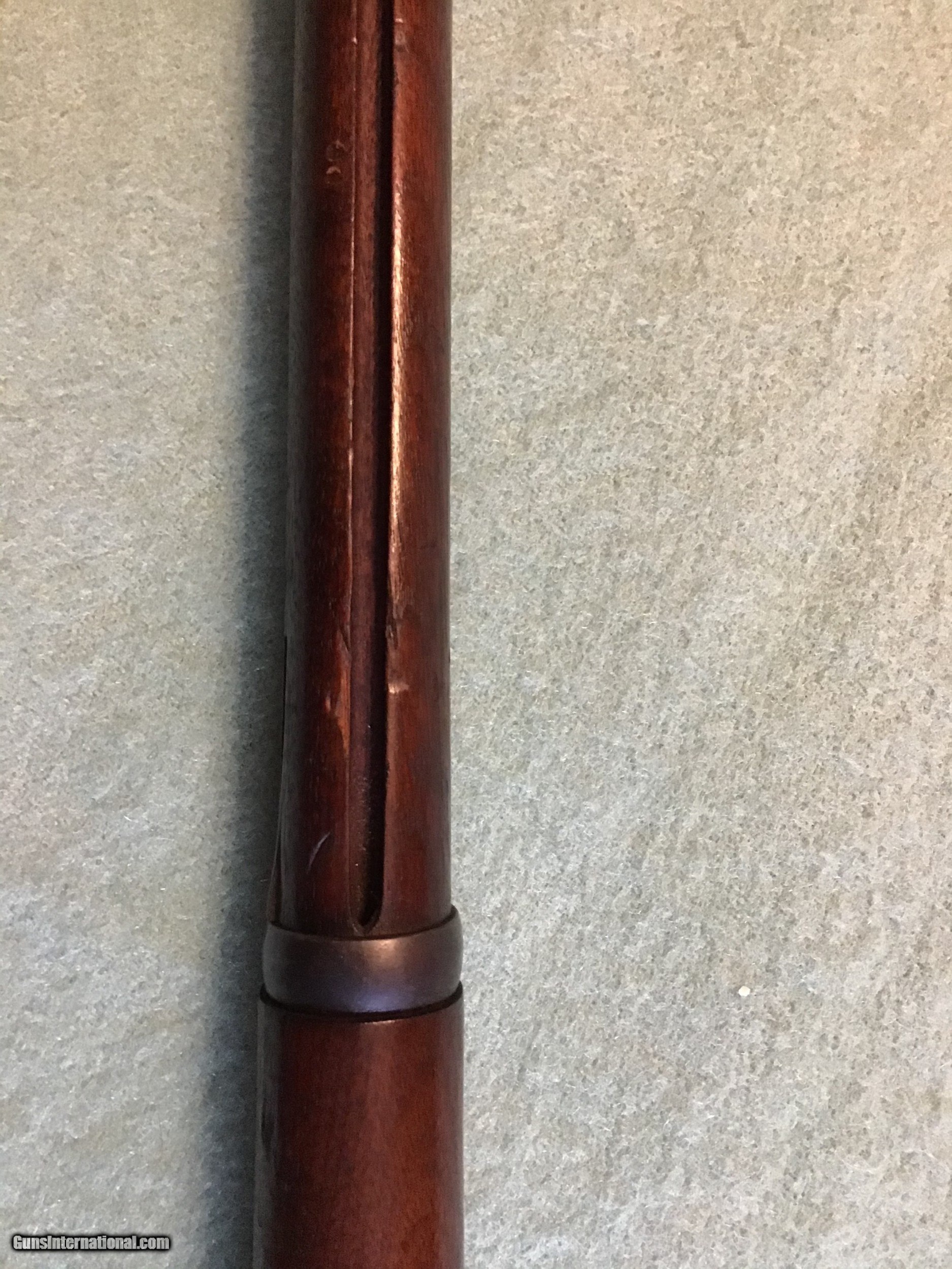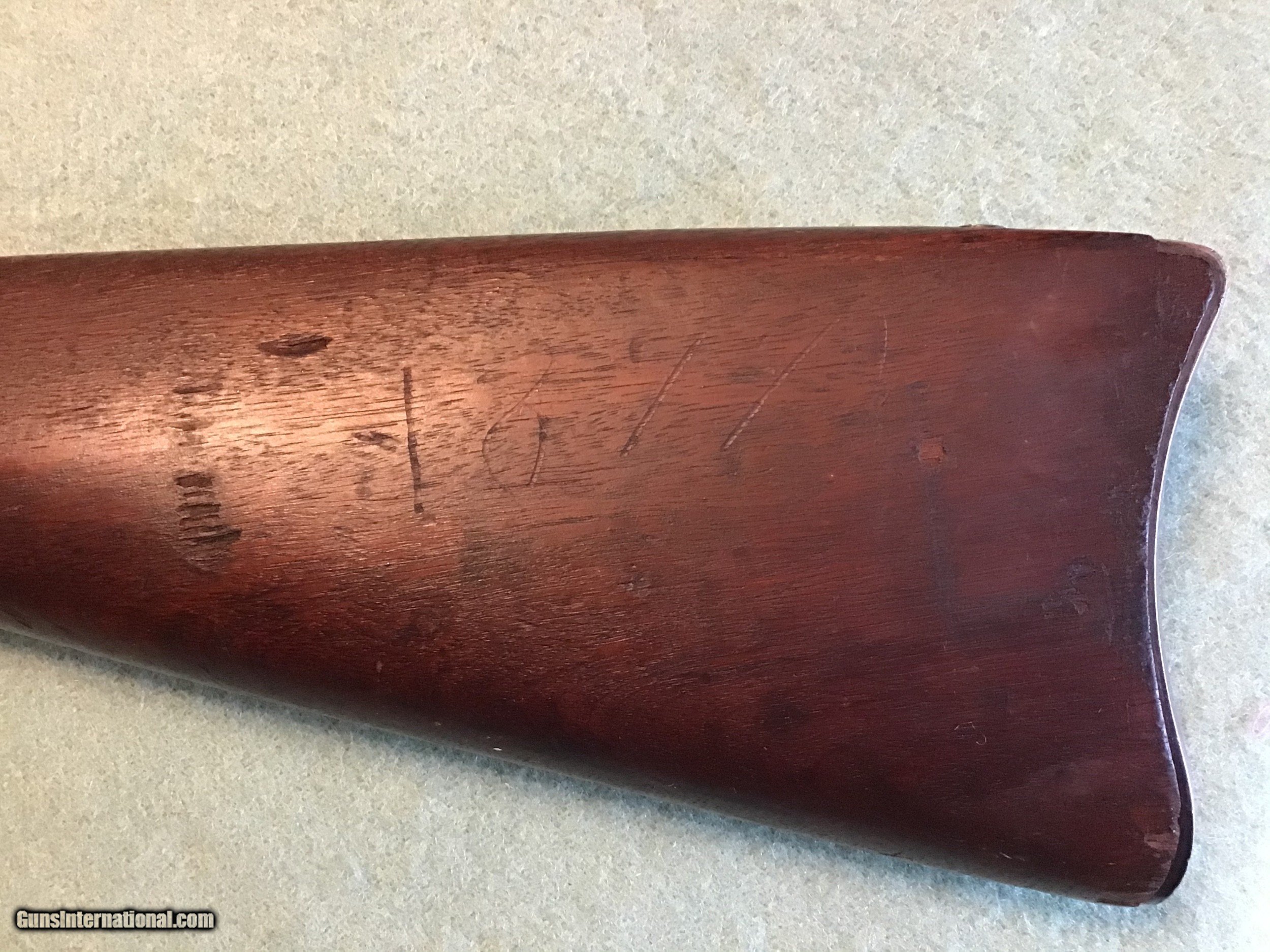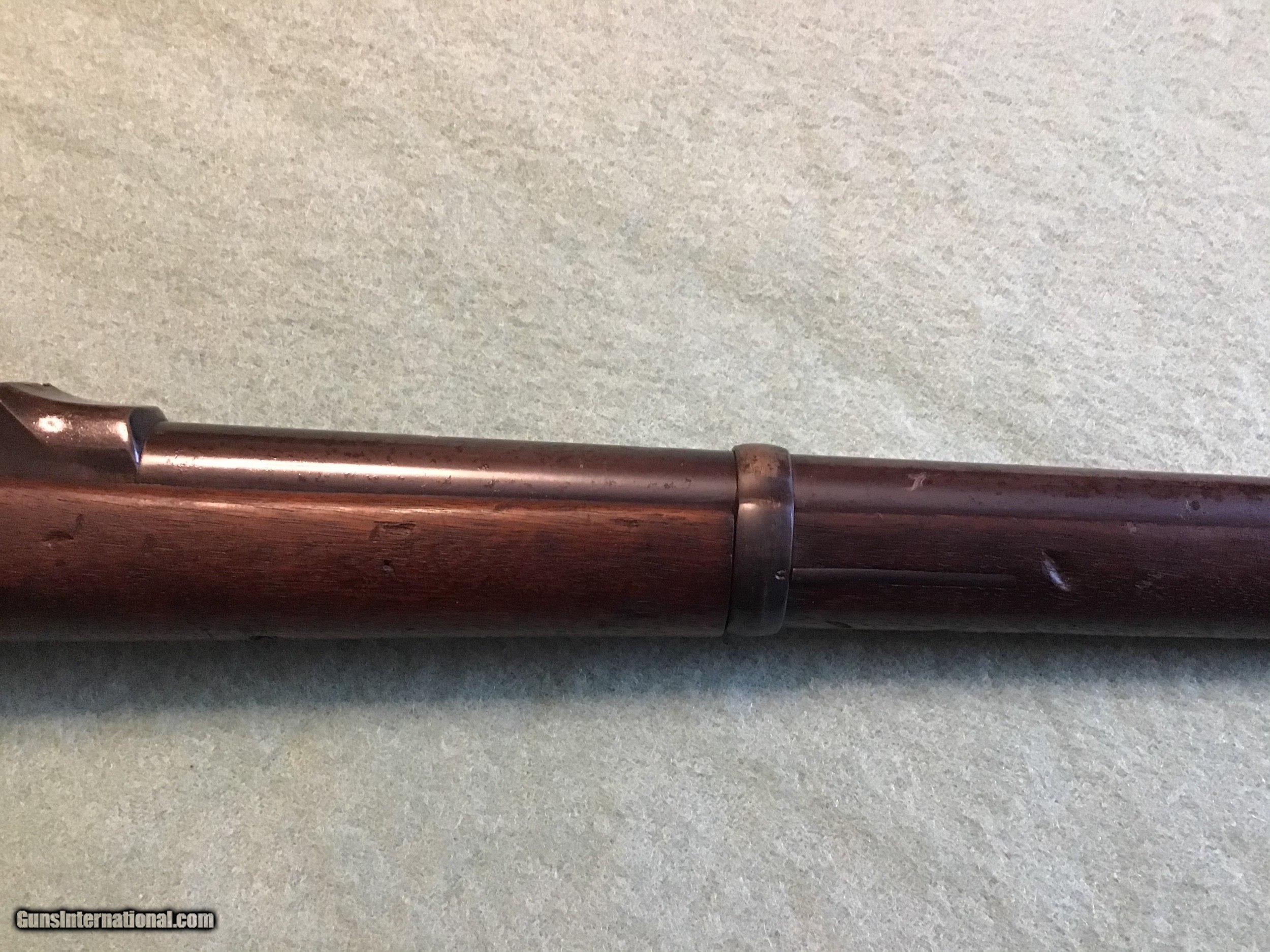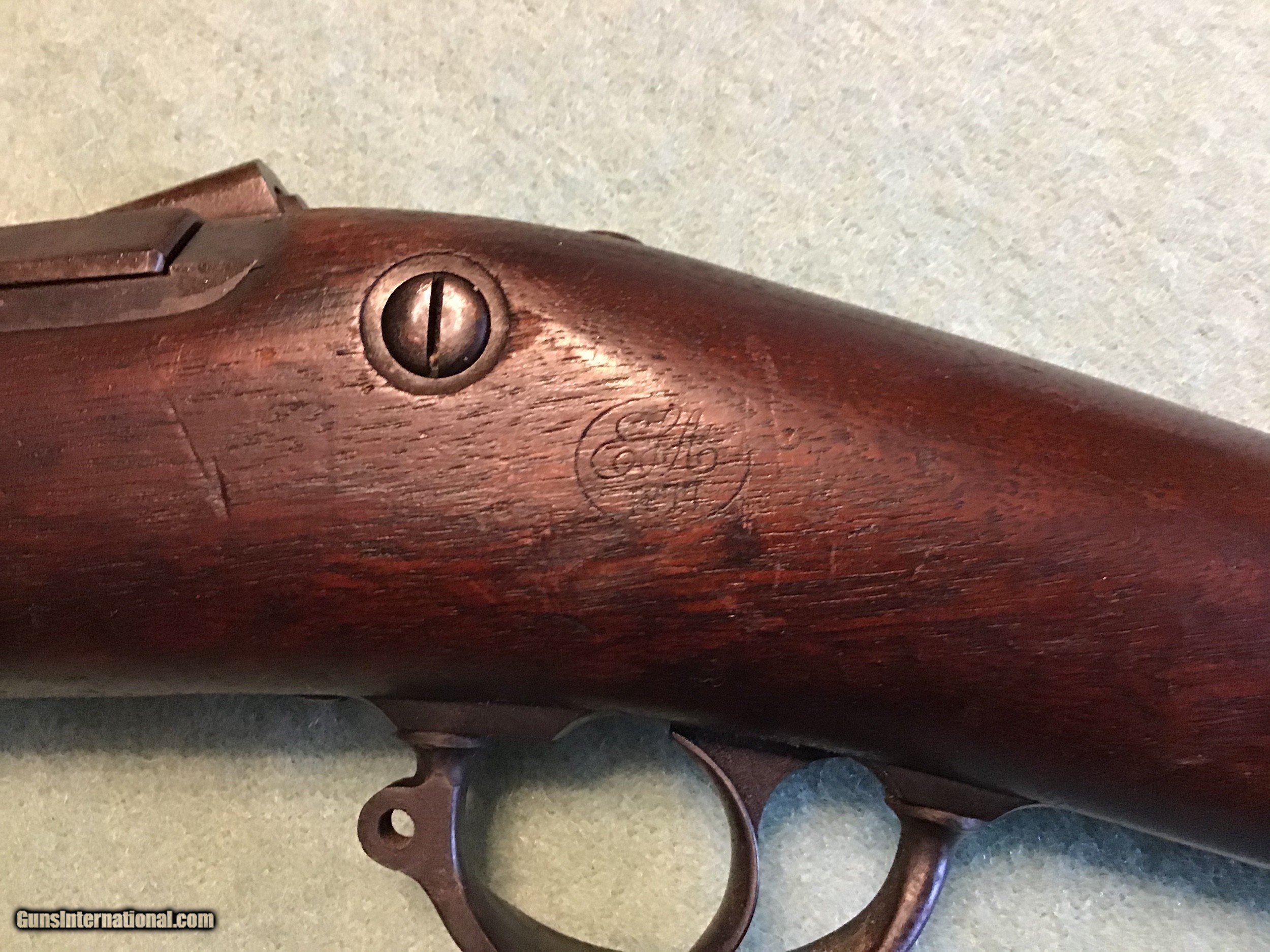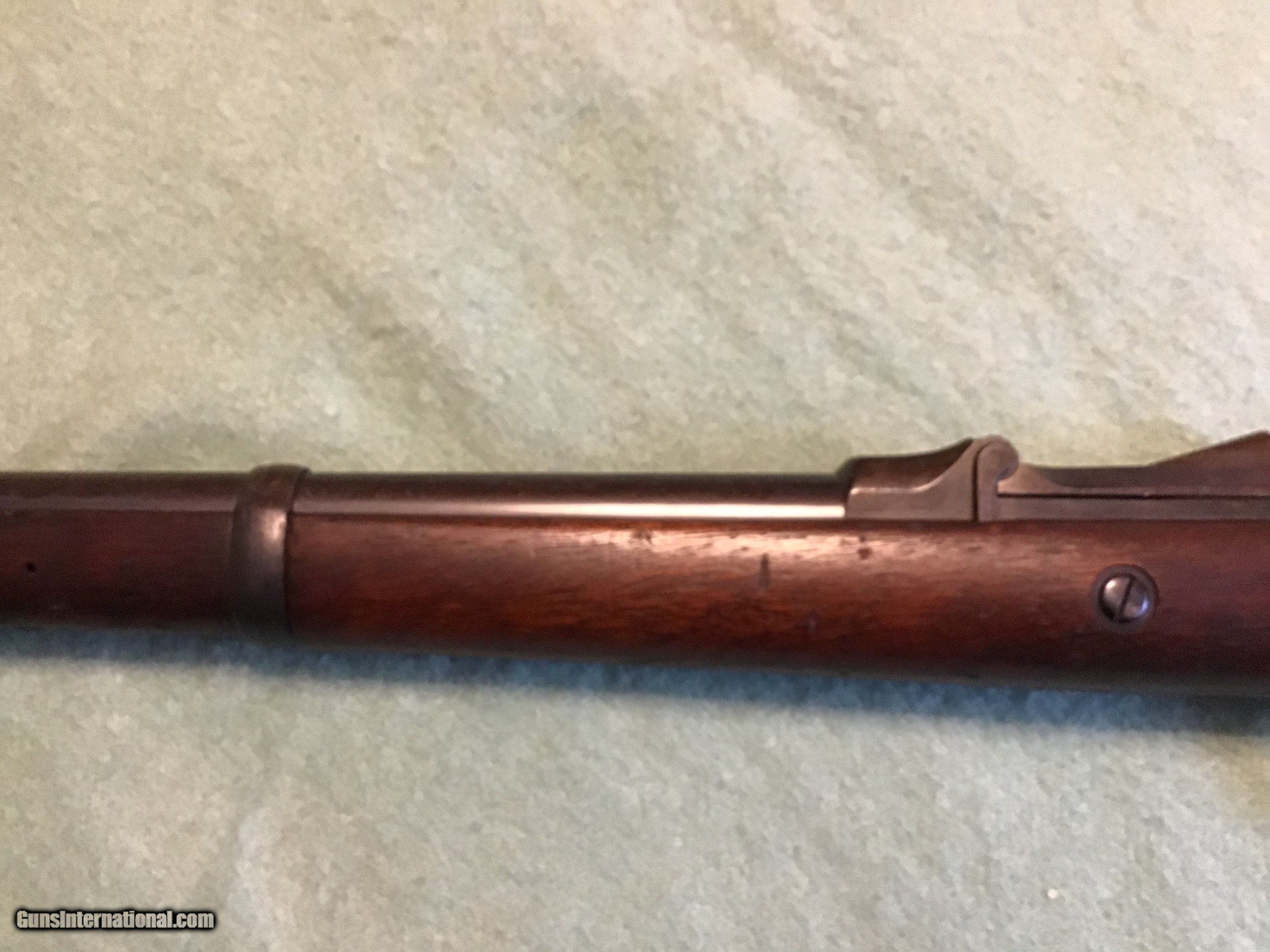 Description: US Springfield Model 1906 bayonet training rifle with flexible bayonet with original leather covering. These were made by Springfield armory during WW1 from surplus 1873 Springfield 45-70 rifles still in armory storage. Approximately 12,000 were made during WW1. This one is correct and complete with the leather covered bayonet in very good to fine condition. The breach block is marked 1873, the lock is marked US Springfield and the cartouche is the rare ESA 1877 in a oval. The leather covered bayonet is marked R.I.A. 1914 F.S.. A hard to find variation for the military collector which can be sent direct. Feel free to contact me with any questions at chriskobberdahl2gmail or 218-839-9272. shipping will be actual cost approximately $50.00. Sale pending SOLD Antique: Yes Manufacturer: Springfield Model: 1906 Serial Number: 22,28? |