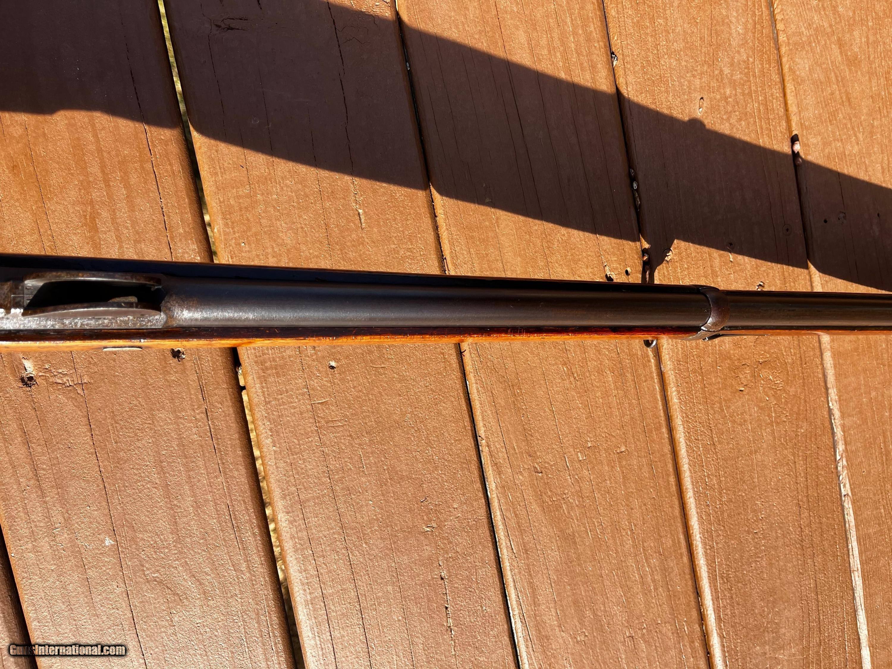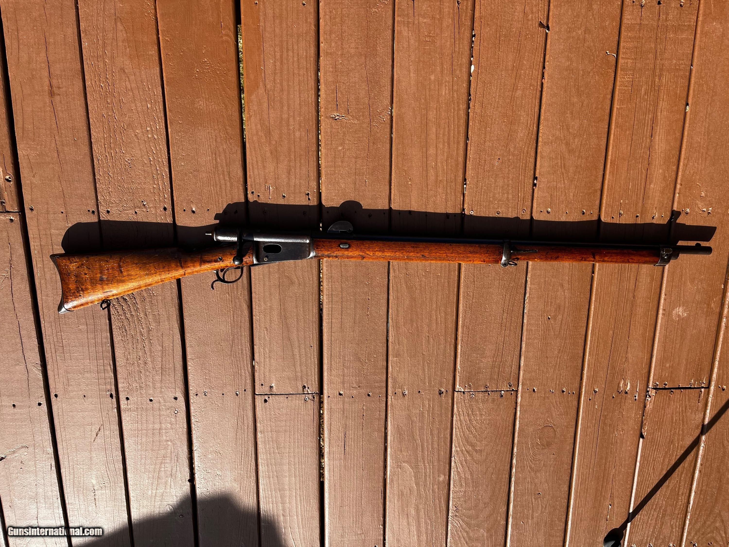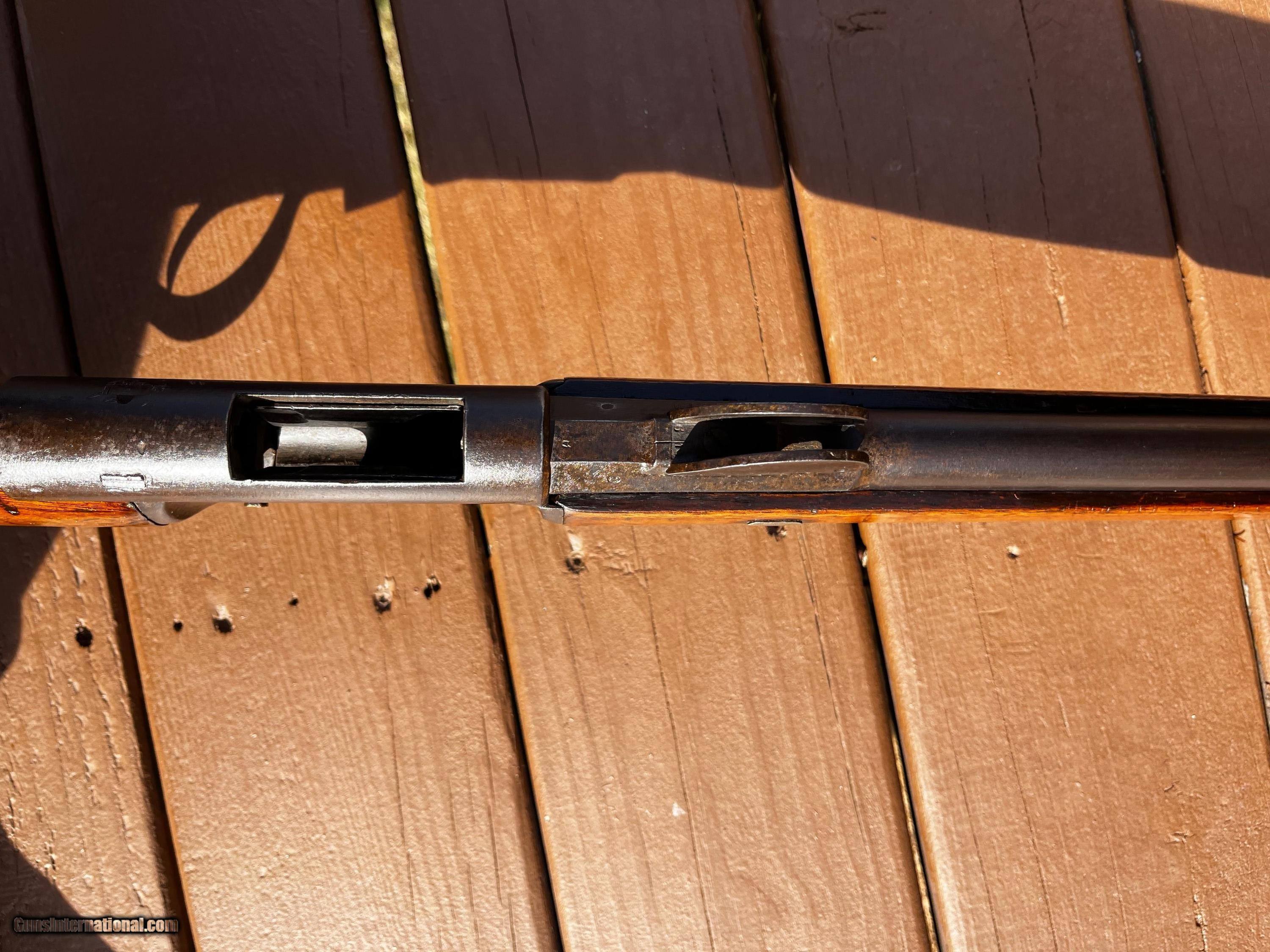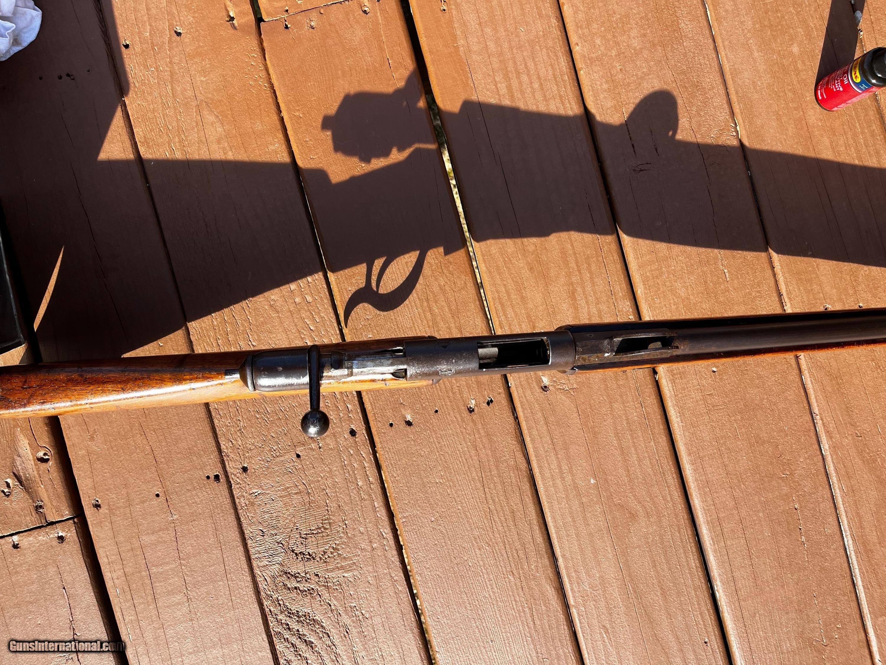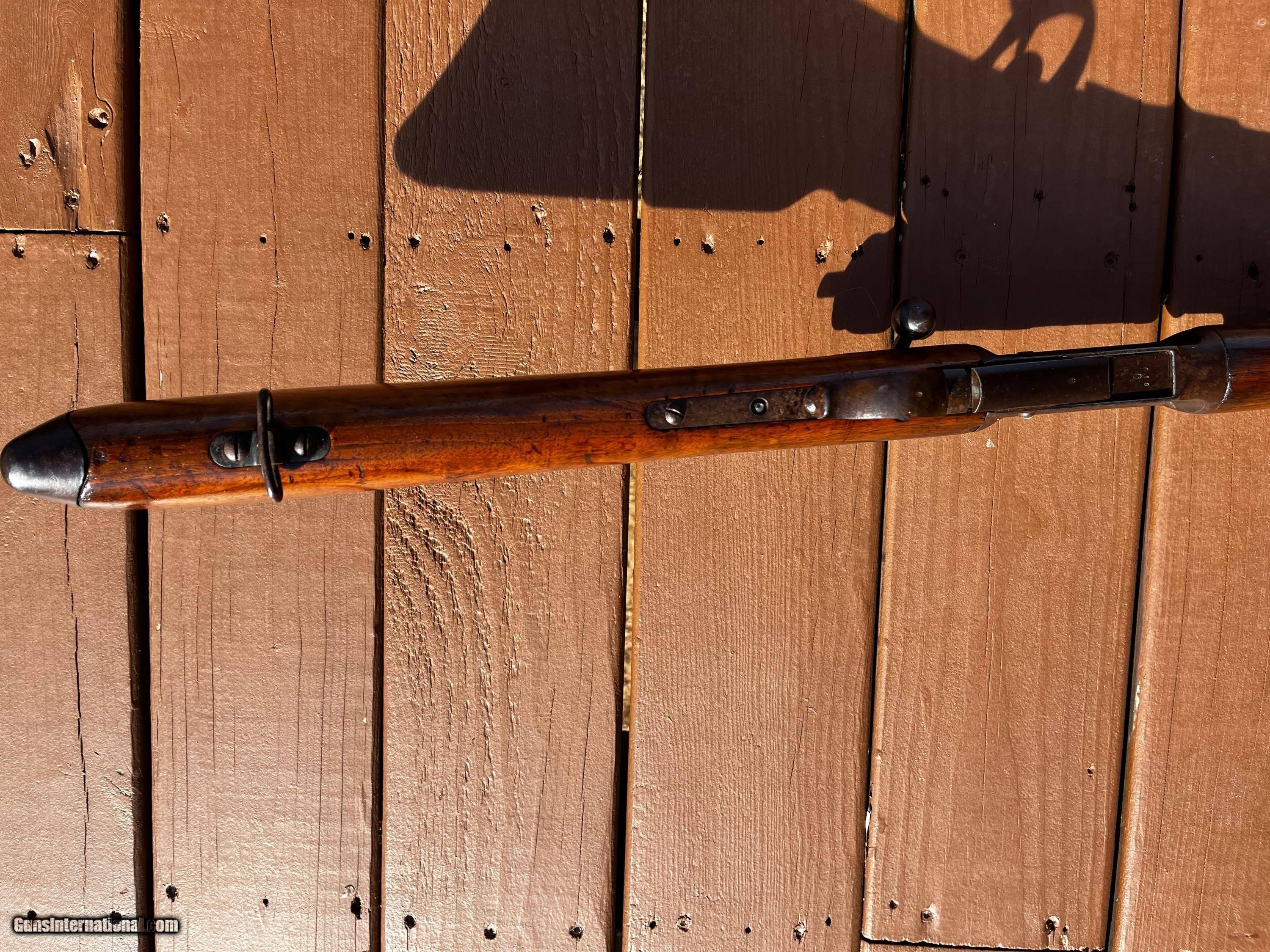 Description: 1878 Vetterli Bolt Action rifle. Missing Bayonet, cleaning rod and portion of rear sight. Serial nos. All match up. Box type magazine. These were the first bolt action rifles used by a military and were known to be very well made, reliable and accurate in ranges that exceeded other military rifles of their time. Great historical gun for safe or wall or to convert to center fire and hand load for shooting. Overall length is 52 Antique: Yes Rifle Caliber: 10.4x38mmR Swiss Manufacturer: Vetterli Model: 78 Serial Number: 167610 Barrel Length: 32 Condition: Fair/Good Metal Condition: Fair/Good Wood Condition: Fair/Good Bore Condition: Good Action: Bolt action Stock: Wood Butt Pad: Swiss style metal Sights: Fixed Manufacture Date: 1880 Price: $425.00 Shipping: $75.00 Buy Now Contact Seller |