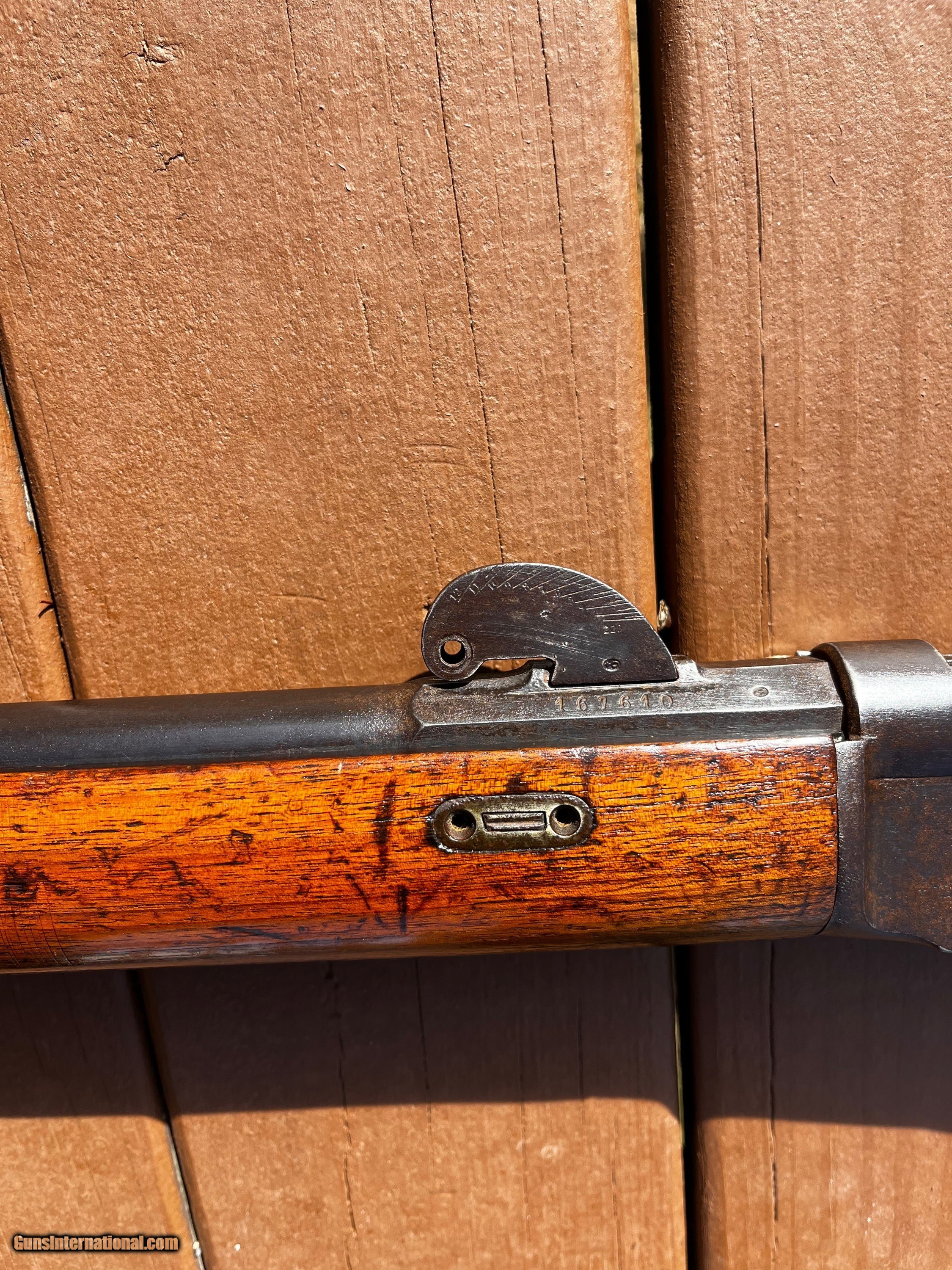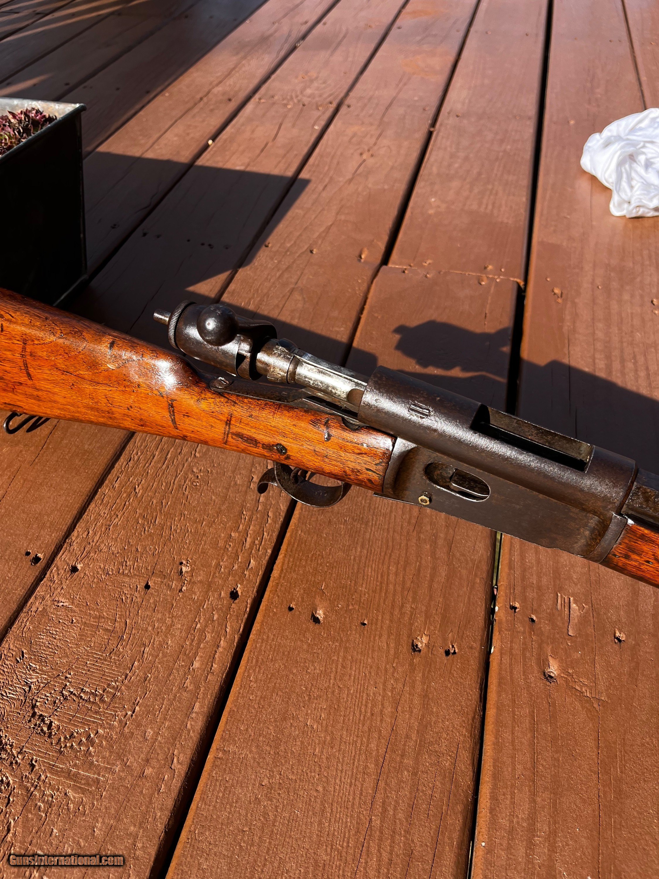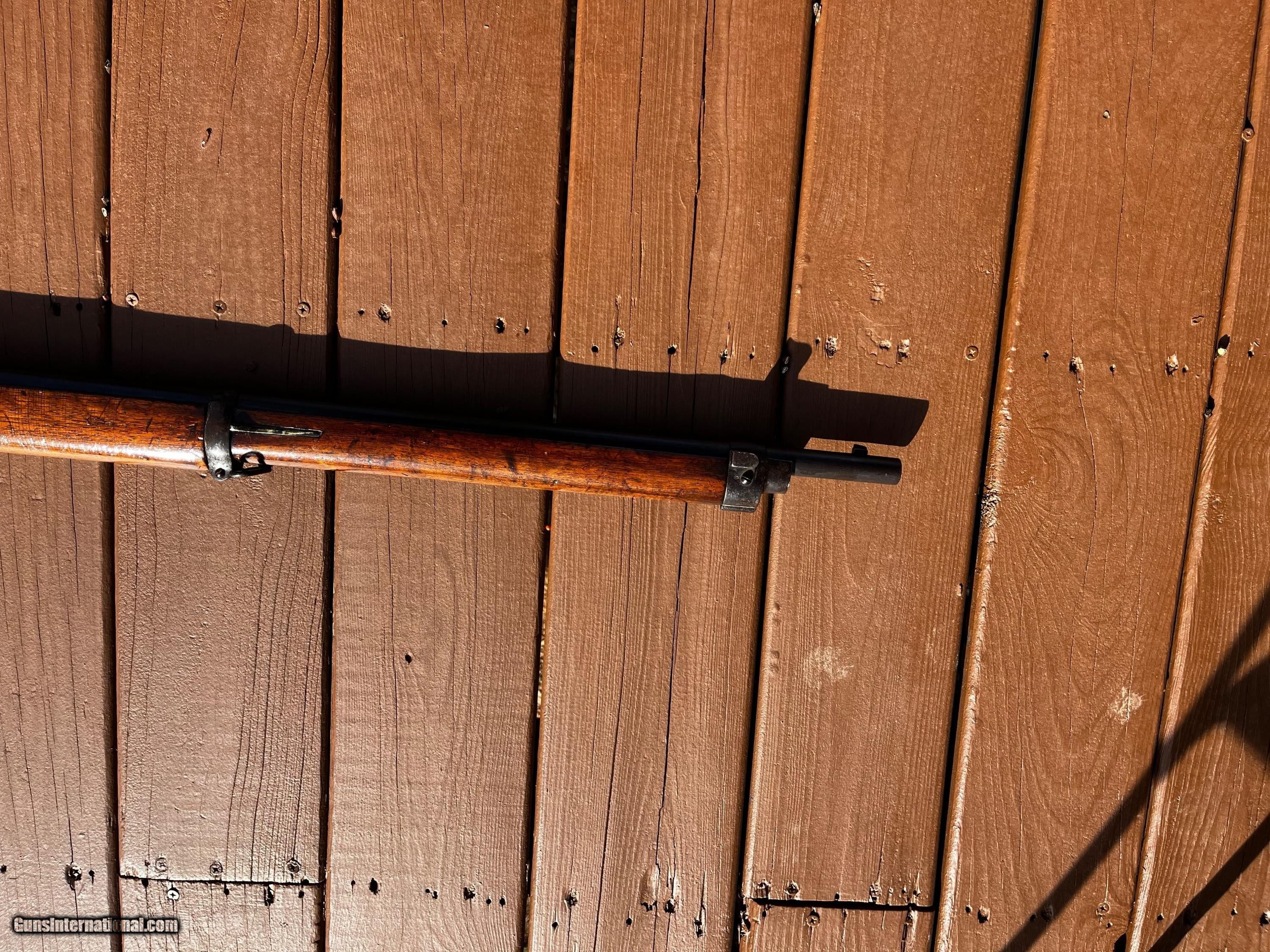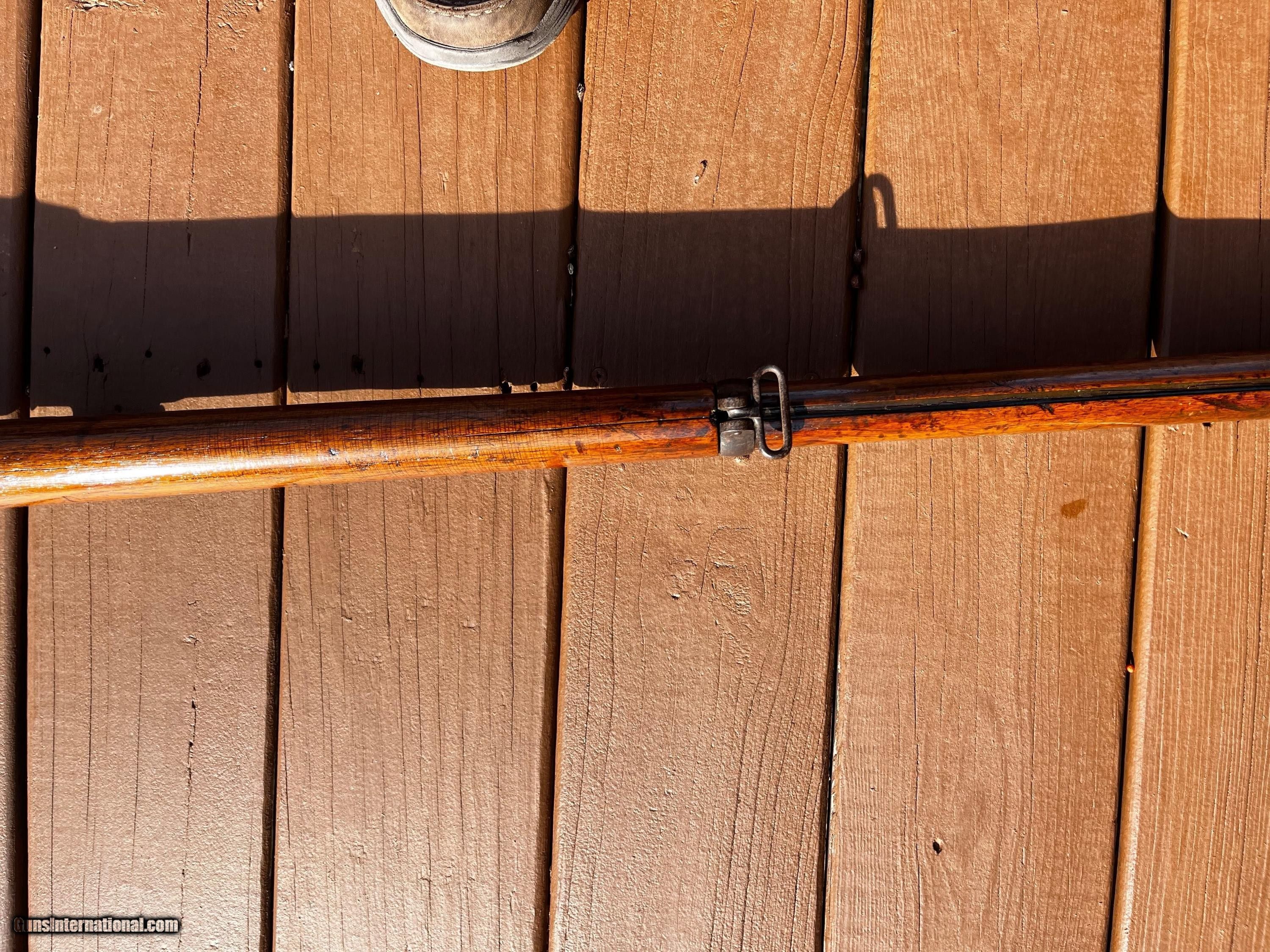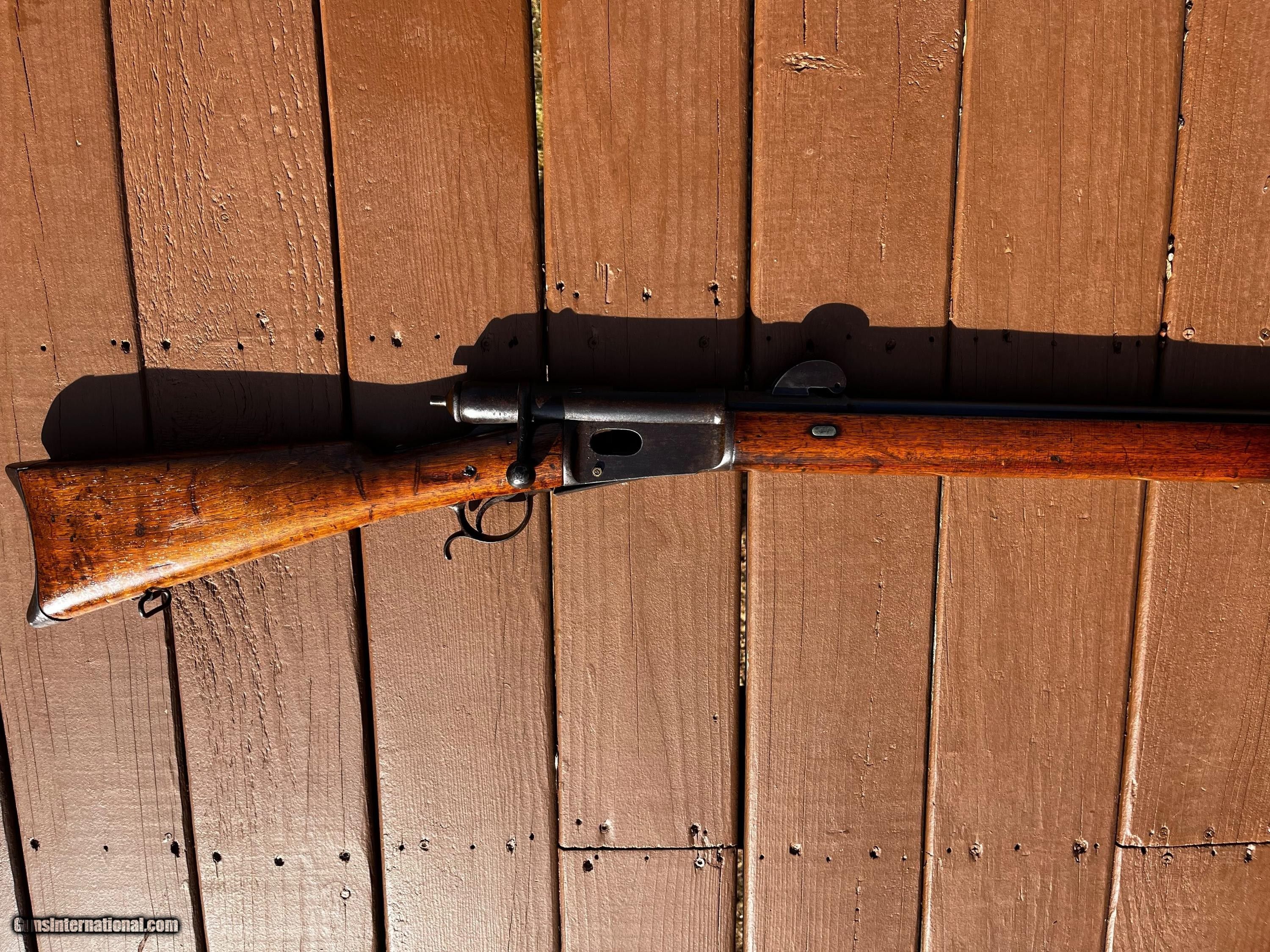 Description: 1878 Vetterli Bolt Action rifle. Missing Bayonet, cleaning rod and portion of rear sight. Serial nos. All match up. Box type magazine. These were the first bolt action rifles used by a military and were known to be very well made, reliable and accurate in ranges that exceeded other military rifles of their time. Great historical gun for safe or wall or to convert to center fire and hand load for shooting. Overall length is 52 Antique: Yes Rifle Caliber: 10.4x38mmR Swiss Manufacturer: Vetterli Model: 78 Serial Number: 167610 Barrel Length: 32 Condition: Fair/Good Metal Condition: Fair/Good Wood Condition: Fair/Good Bore Condition: Good Action: Bolt action Stock: Wood Butt Pad: Swiss style metal Sights: Fixed Manufacture Date: 1880 Price: $425.00 Shipping: $75.00 Buy Now Contact Seller |