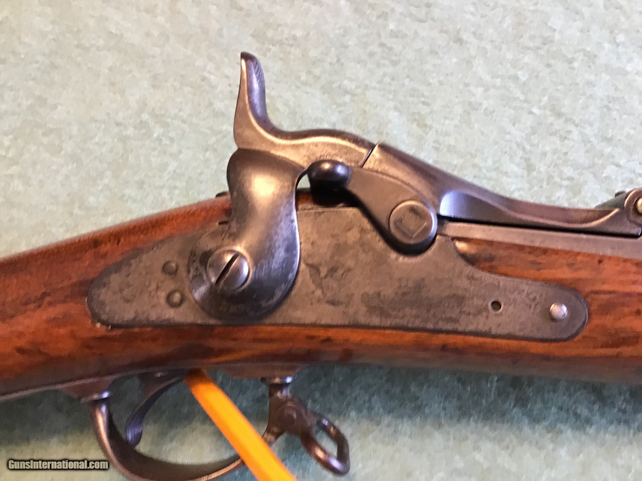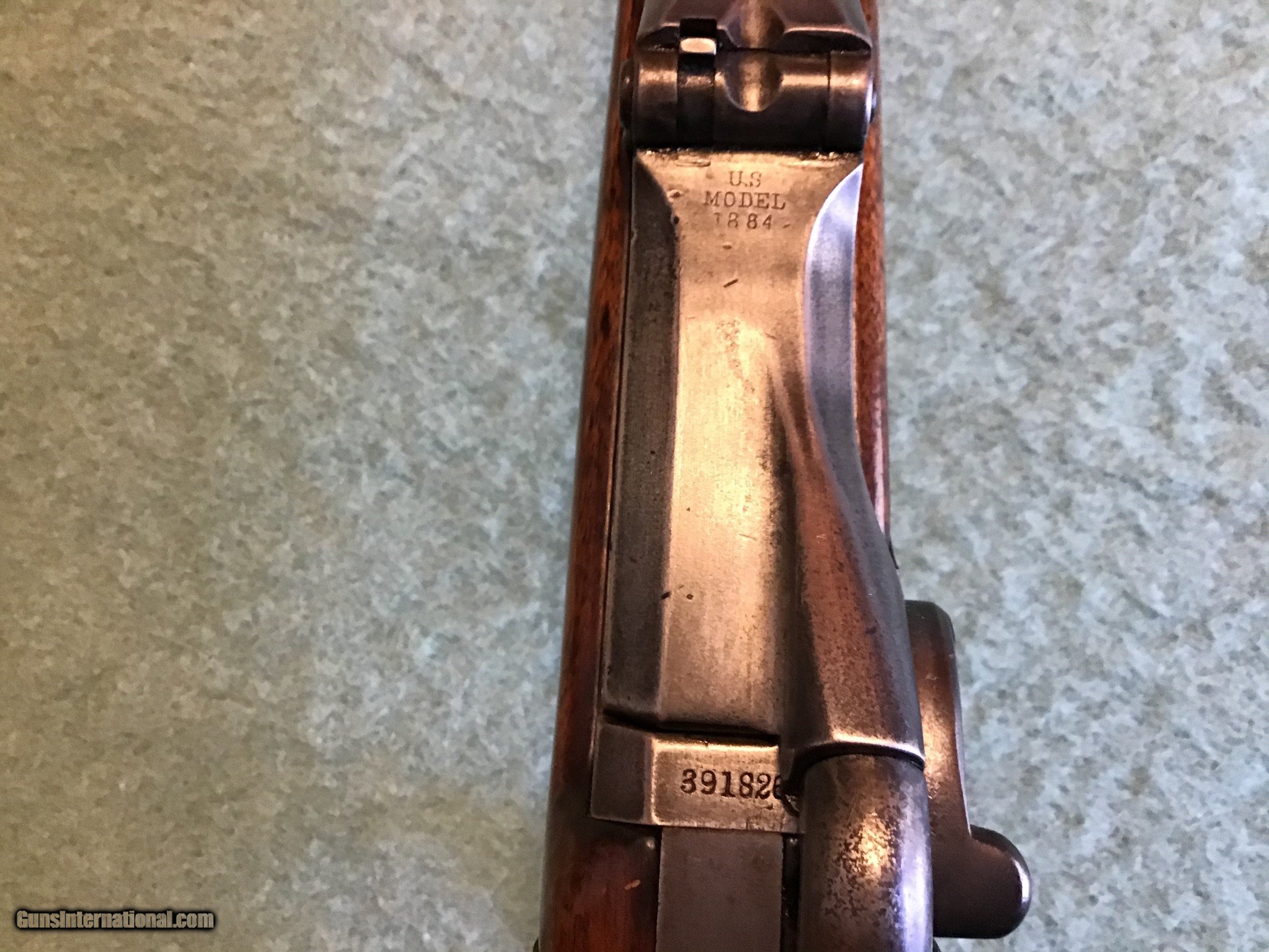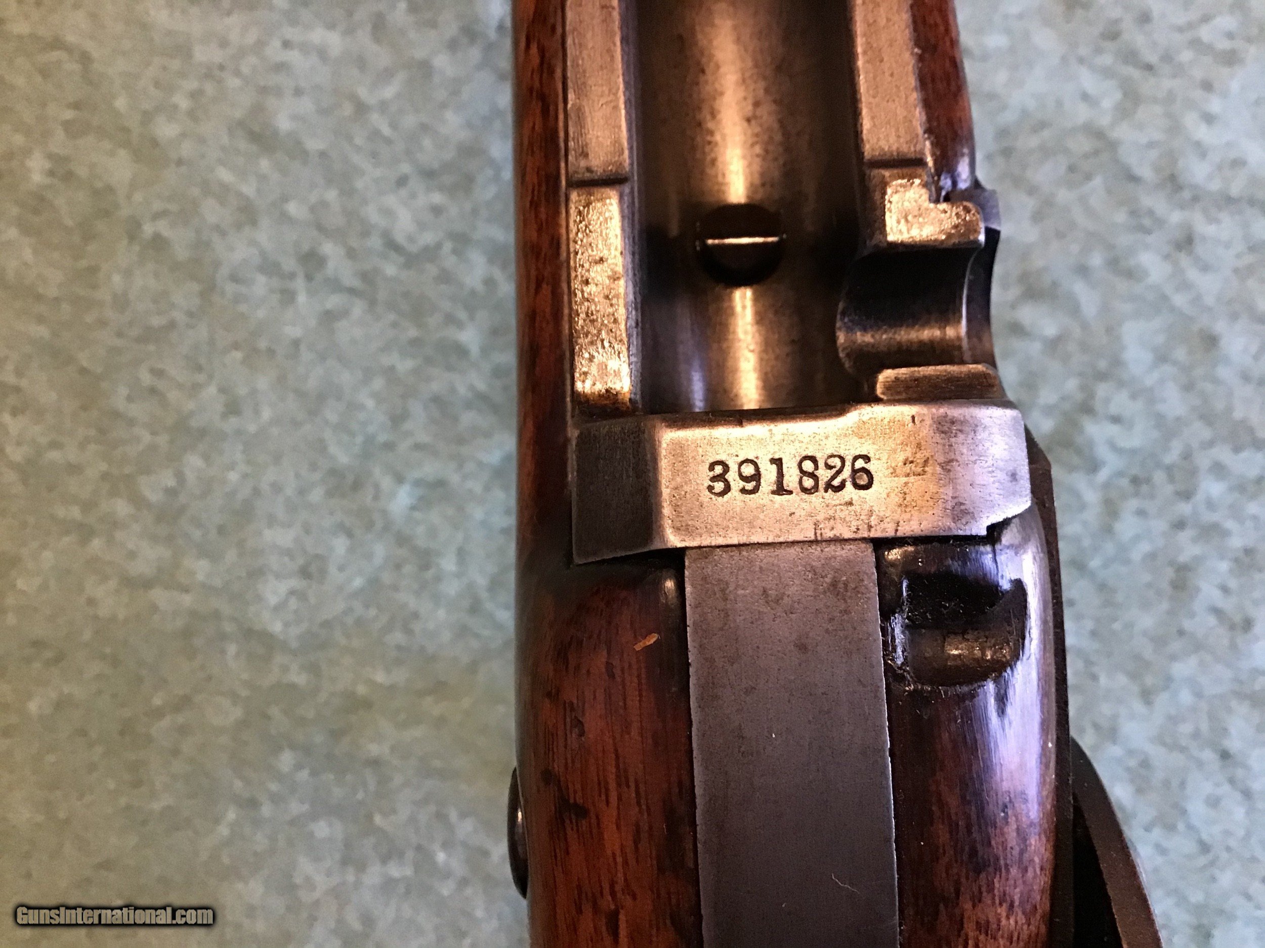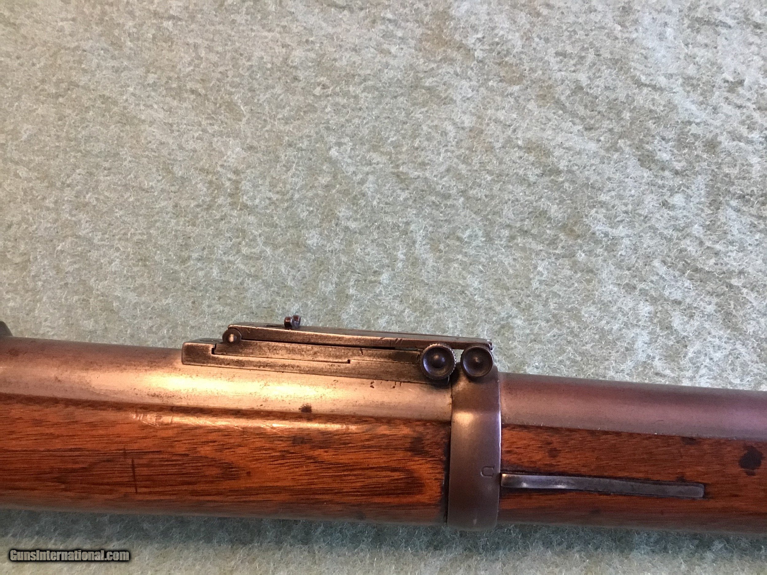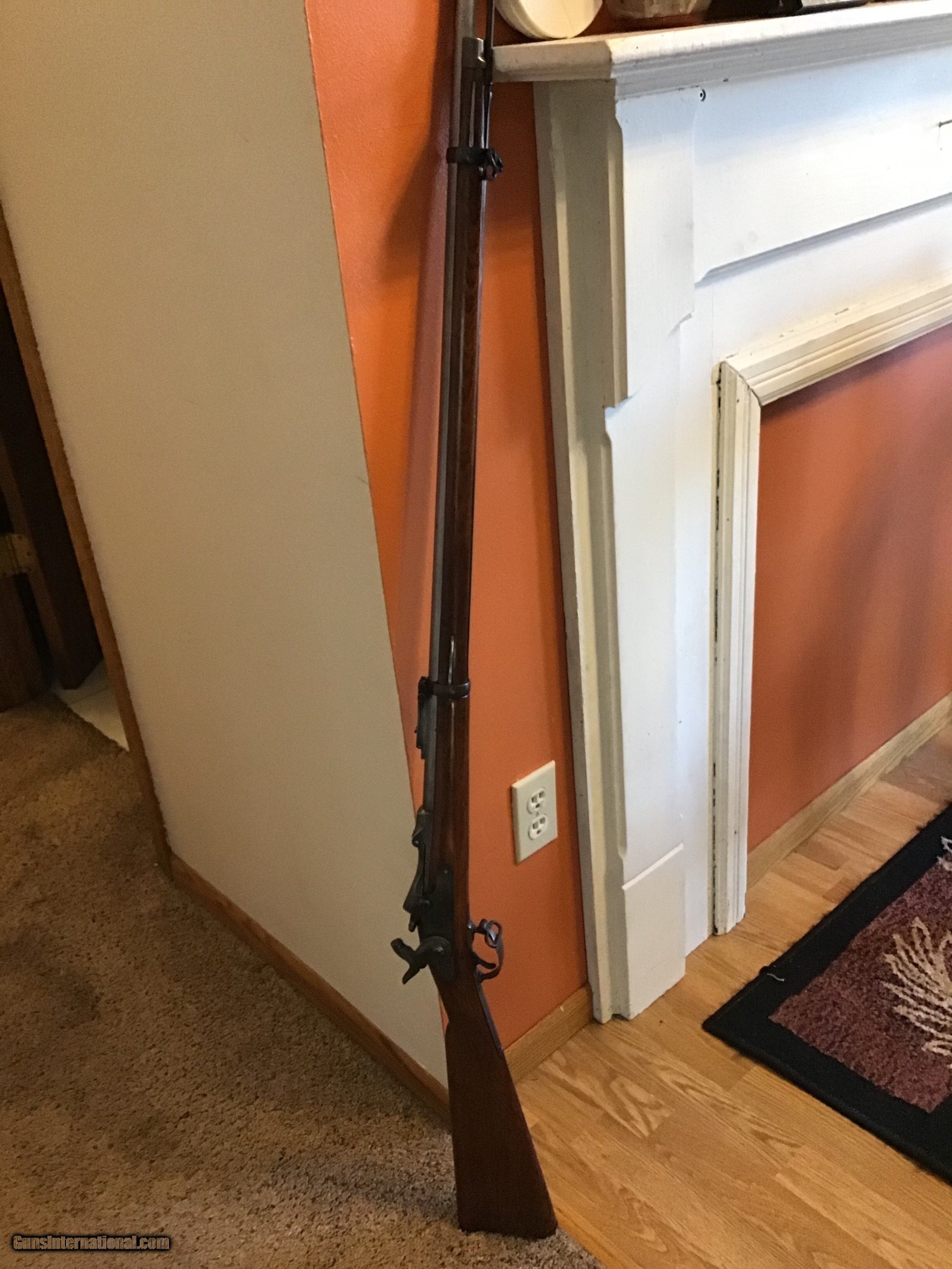 Description: US Model 1884 Springfield Trapdoor 45-70 caliber army rifle. The full length walnut stock has been sanded and reffinished leaving a faint cartouche. The 32.5" barrel is a smooth grey brown color as well as most of the other metal parts. All metal markings are present and correct. The Buffington rear site is present and works perfectly. The lock and breach block function fine. The rifling is good with some minor pitting. The rifle is complete with the original cleaning rod. Feel free to call or email with any questions 218-839-9272 or chriskobberdahl2gmail. Sold SOLD Antique: Yes Manufacturer: US Springfield Model: 1884 Serial Number: 391,826 Barrel Length: 32.5” Caliber Info: 45-70 Bore: Good Condition: Good Metal Condition: Good Wood Condition: Good Bore Condition: Good |