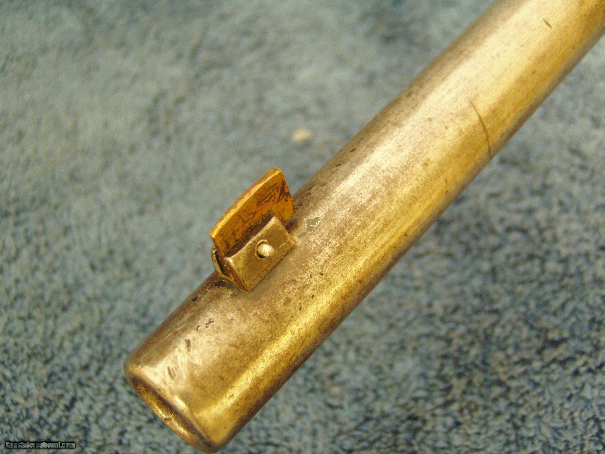Description: Springfield Model 1884 trapdoor carbine. .45-70 Caliber. 22" barrel with a very good bore. Blued steel turning grey to brown patina. Military half stock with low comb. Brass blade front sight "Buffington" rear sight. Lock plate marked with the American Eagle motif an, "US/SPRINGFIELD" in front of the hammer. Front of breechblock stamped "US/MODEL/1884". Rear of barrel "V" and "P" proofed. Sling ring and bar on left side opposite the lock plate. Curved metal butt plate marked "US" on top tang. Pivoting trap door for cleaning supplies (empty) Two piece trigger guard. Serrated trigger. Single Barrel Band. Inspector's Cartouche on bottom of stock at wrist behind trigger guard. Condition is very good Only a small portion of original finish remains on metal components. Spotty discoloration with patchy patina. Light scratches and tooling marks. bore is very good. Stock shows numerous small scratches, scrapes and dents. One long longitudial crack on left side of butt stock. Buyer pays $35.00 shipping to lower 48 states. I accept USPS Money Orders or Bank Cashier's Check. Will accept Personal check, with shipping hold. Layaway Available. ANTIQUE SOLD Antique: Yes Manufacturer: SPRINGFIELD Model: Model 1884 Trapdoor Serial Number: Serial# 415117 Caliber Info: .45-70 Bore: 22 inches Chambers: SINGLE Ejectors: hand Condition: Very Good Metal Condition: Very Good Wood Condition: solid, very good Bore Condition: Very Good Barrels: ONE Barrel Type: round Action: single shot Triggers: one Stock: WALNUT Finish: PATINA Sights: dovetail Manufacture Date: 1880's |