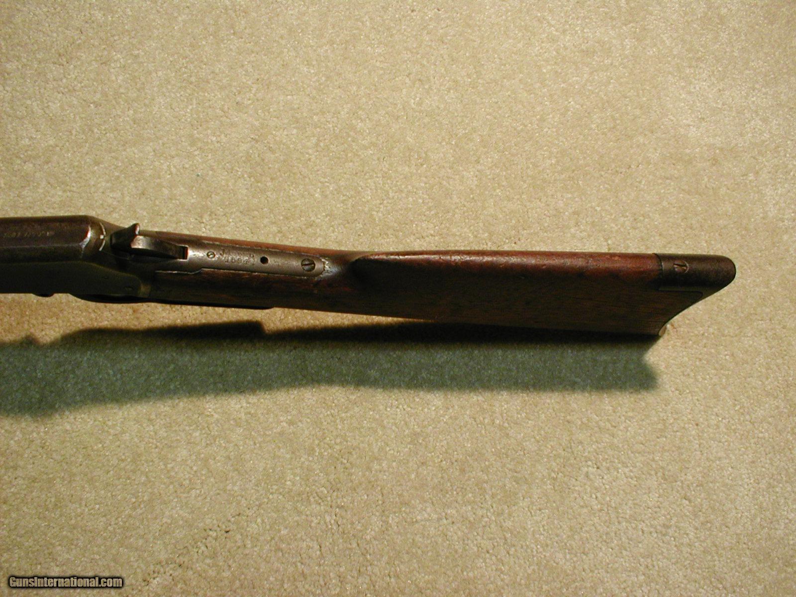 Description: VERY EARLY 1894 .38-40 OCTAGON RIFLE, MADE 1895, an interesting "attic condition" example that somehow after all these years has escaped any sort of cleaning or "helping." The wood looks dry, but has never been sanded or refinished and shows normal handling etc with a very slight age crack coming back from the upper tang for maybe an inch or so and goes nowhere- minor, mostly brown receiver, may have had a tang sight on at one time as one factory filler screw in the upper tang is missing, barrel and mag are a deep plum brown with some very surface dry rust still apparent, fine markings, fine+ bore may clean out to about exc., exc. tight action, original buckhorn rear sight (needs elevator bar only) and Rocky Mountain blade front sight, this one has "been there and done that" but is not abused, some light, careful cleaning would go a long way on this fine old rifle. SOLD Antique: Yes Manufacturer: Marlin Model: 1894 OCTAGON RIFLE Serial Number: 127XXX Caliber Info: 38-40 Condition: vg Barrels: 24" oct |
