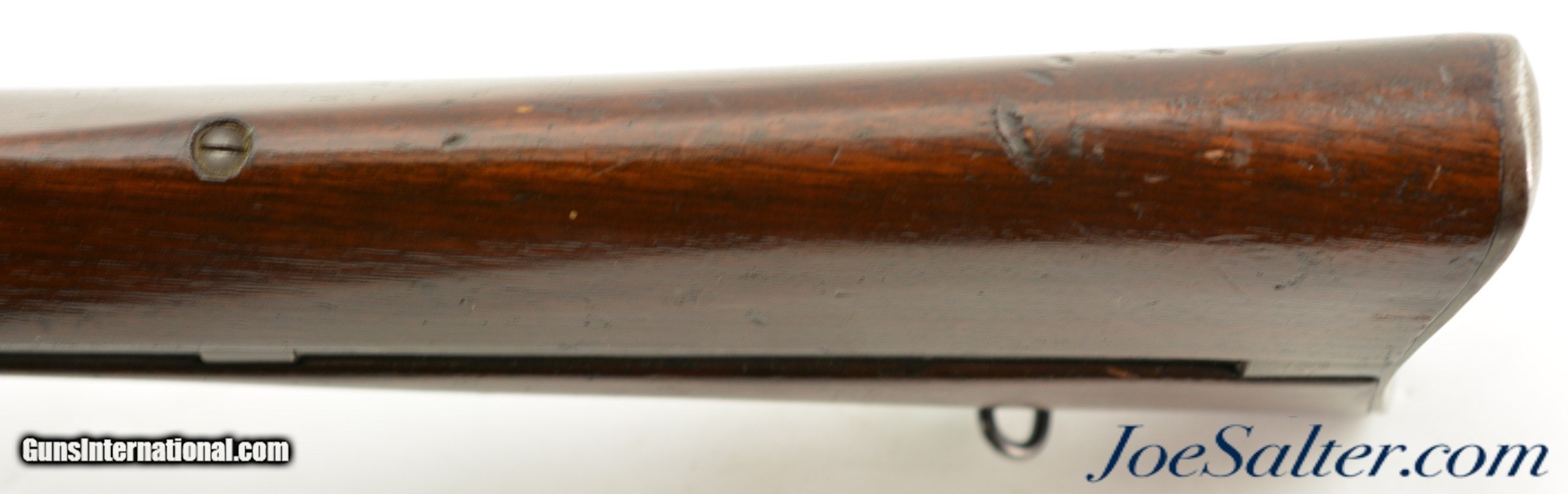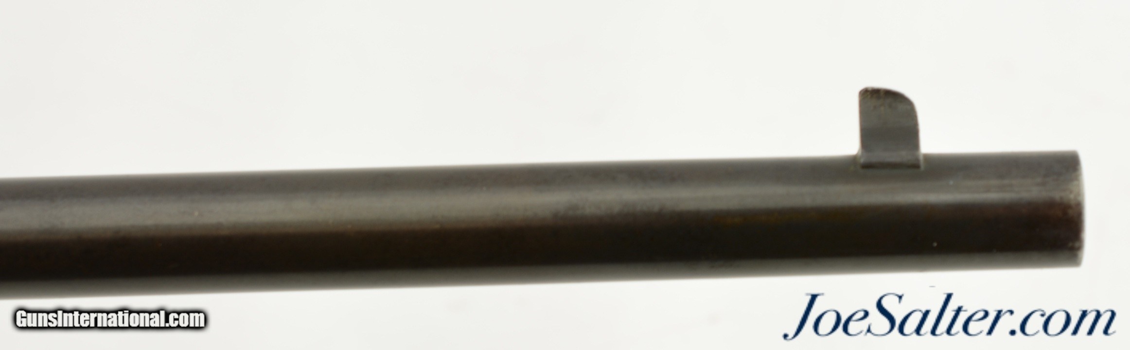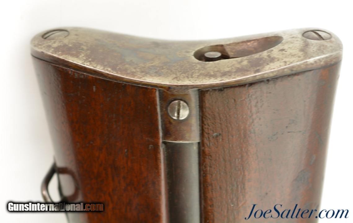 Description: NSN, .44 Evans, 22" barrel with an excellent, bright bore. This is a rare New Model Carbine, one of about 4,000 made, that retains about 90-92% of the original blue finish with mild fading and freckling along the edges and at the muzzle. The lever, hammer, and some of the buttstock fittings have retained a like amount of their original color case-hardening which has dulled slightly, but is still fairly bright. Additionally, some of the original bright, nitre blue is still present on the rear ladder sight base. The checkered walnut forend with schnabel tip and unique, two-piece buttstock are also in excellent condition with only some very minor handling marks in the original varnish finish. The mechanism is in excellent condition as well, and functions flawlessly. The Evans was the first firearm to be mass-produced in Maine and utilizes a helical magazine in the buttstock that originally held 34 rounds of ammunition, but by the time the New Model was released the capacity had been reduced to 28 rounds. This particular example retains an exceptionally high degree of original finish and is mechanically superb. It would make a fantastic addition to any collection of unusual firearms or early American repeaters. Antique; Antique: Yes Price: $2,995.00 Contact Seller |