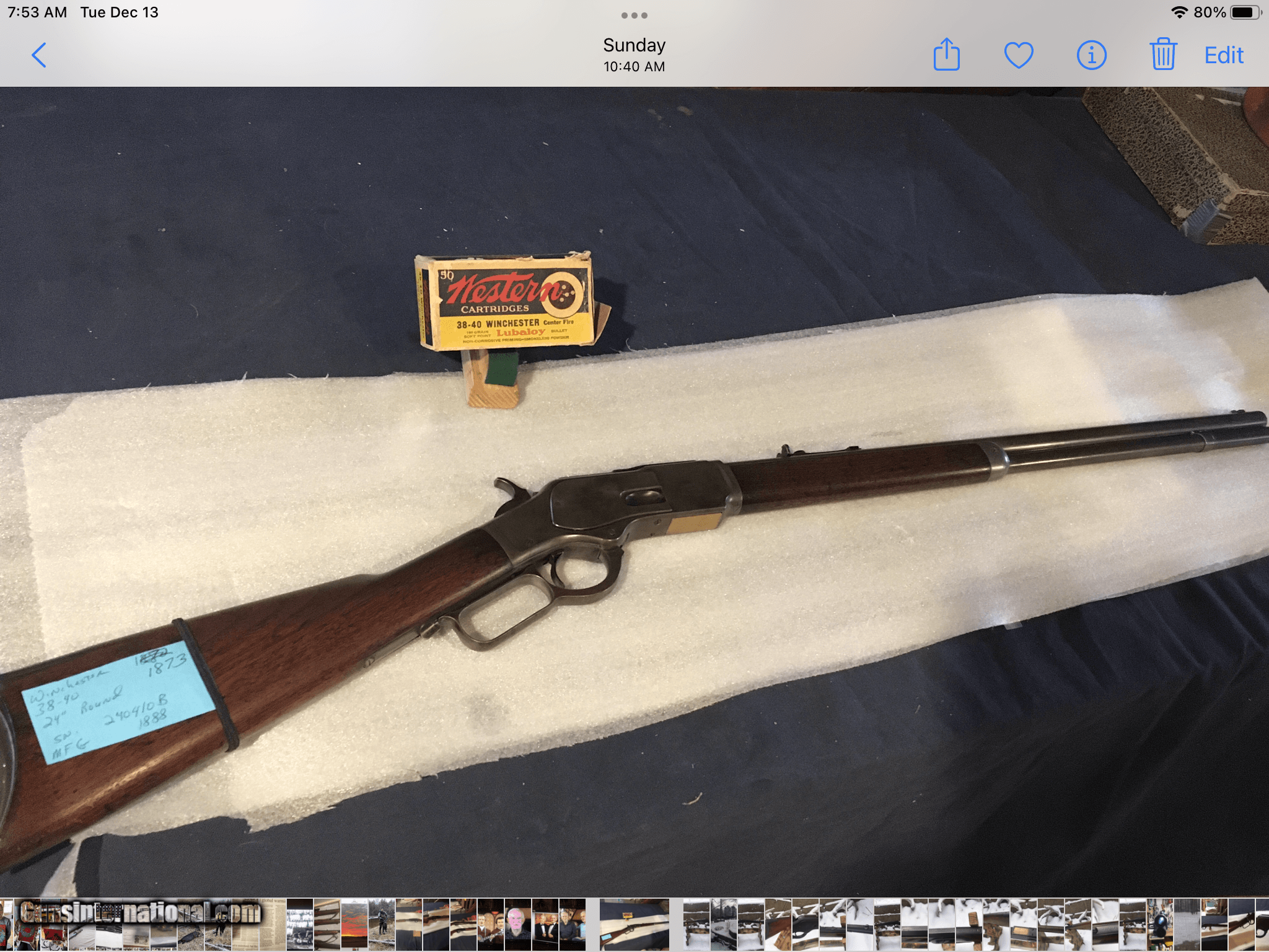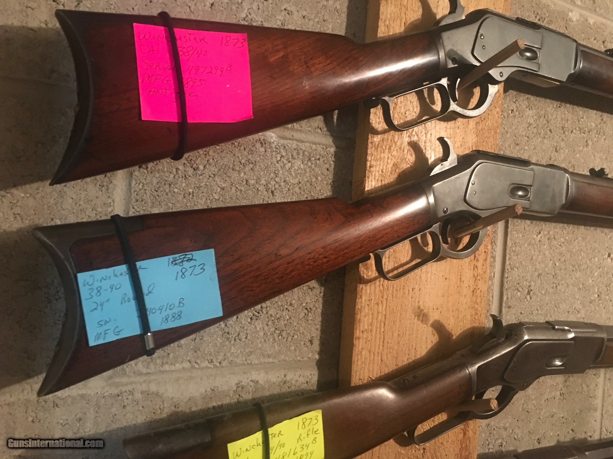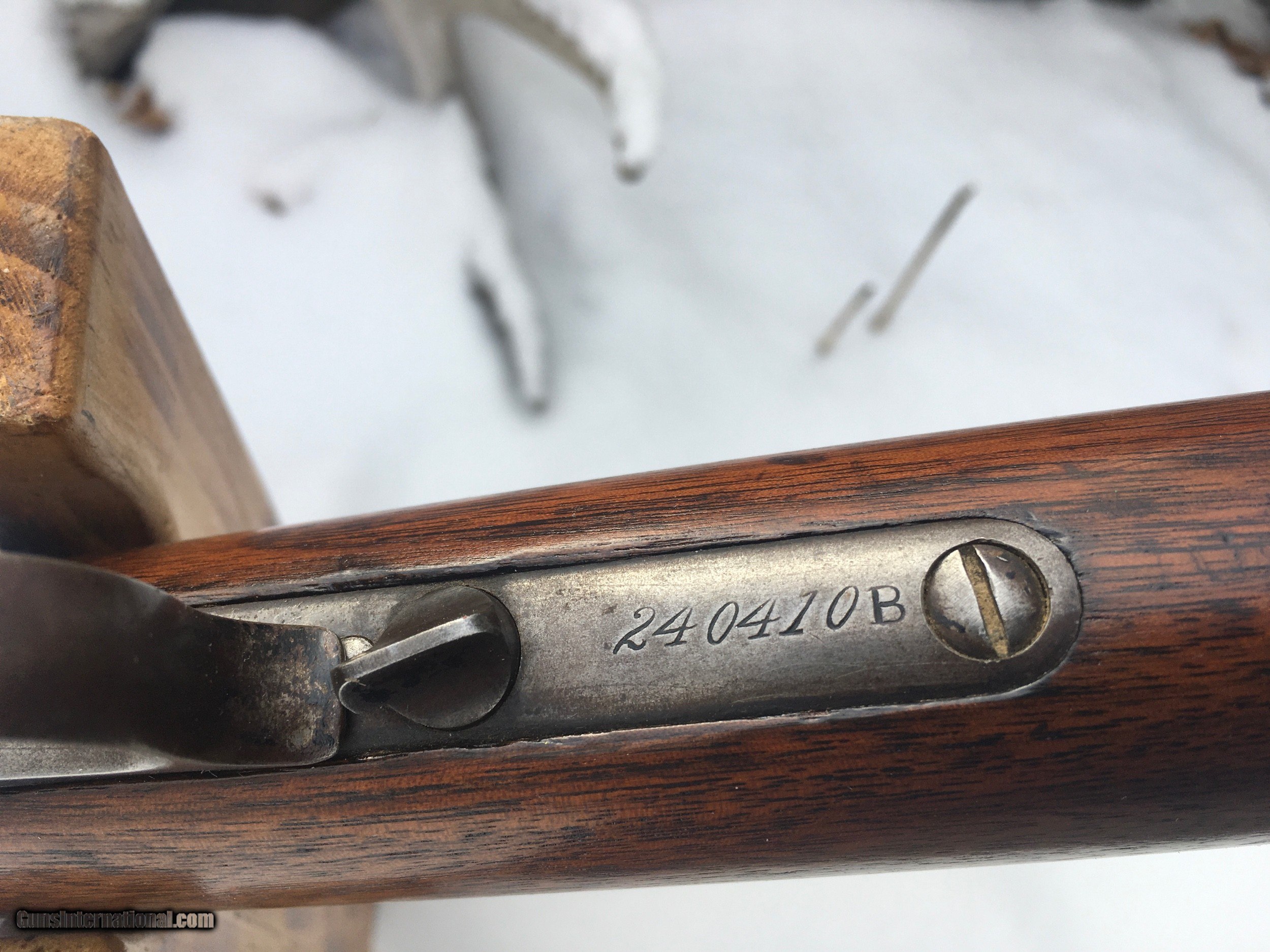 Description: SOLD Ray Ide 4-15-24 Listing a nice original Winchester 1873 round barreled 24" rifle in 38/40, this caliber was introduced in 1879 , this rifle serial 240410 was built in 1888. the round barreled rifles were I've read 1 in 9 as far as production numbers run. Pretty decent condition, original finish on both wood and meta |> . Some one marked bottom of reciever with a X , long time ago. Maybe had a ( fast Eddie ) in the group and wanted to protect what was his. I shoot this rifle, feeds and cycles fine. I've noticed many old 73's listed aren't sporting the best wood, people are hanging on to the nicer rifles that do come up. If you plan on Cowboy action shooting with the real deal , this gal would do it, or I guess you can spend about as much for one with plastic innards .any way I ship USPS , only to a FFL or your C&R, priority mail, insured,ntracking number, not to shoot and dismantle the rifle then come whining for a refund. Yes I dealt with one of them , not much the man didn't know ?? any questions or want to make a offer, call or text me at 920-590-3400 , mean time enjoy your day SOLD RAY Ide 4-15-24 SOLD Antique: Yes Rifle Caliber: .38-40 Winchester Manufacturer: Winchester Model: 1873 Serial Number: 240410 B Bore: Fine Condition: Original , fine Metal Condition: Original , nice Wood Condition: very good Bore Condition: great for its age Barrel Type: round Action: lever Triggers: single Stock: rifle Butt Pad: crescent Finish: aged Sights: original Manufacture Date: 1888 |