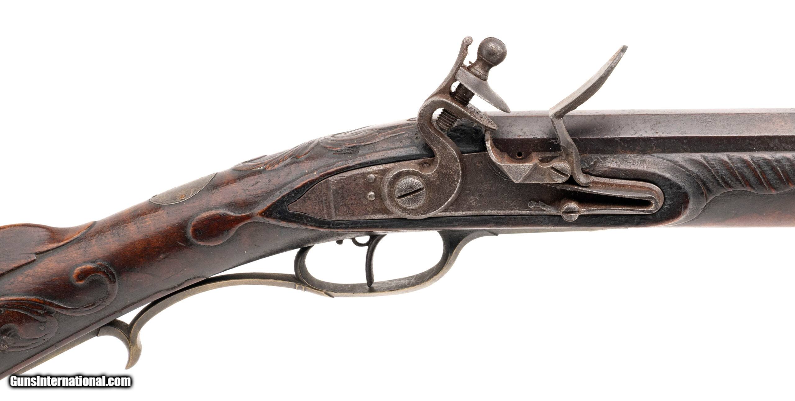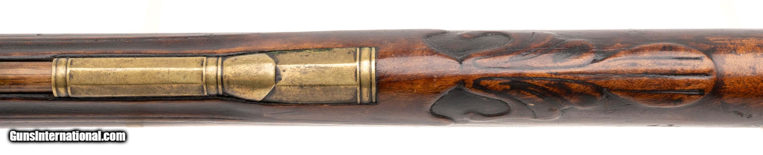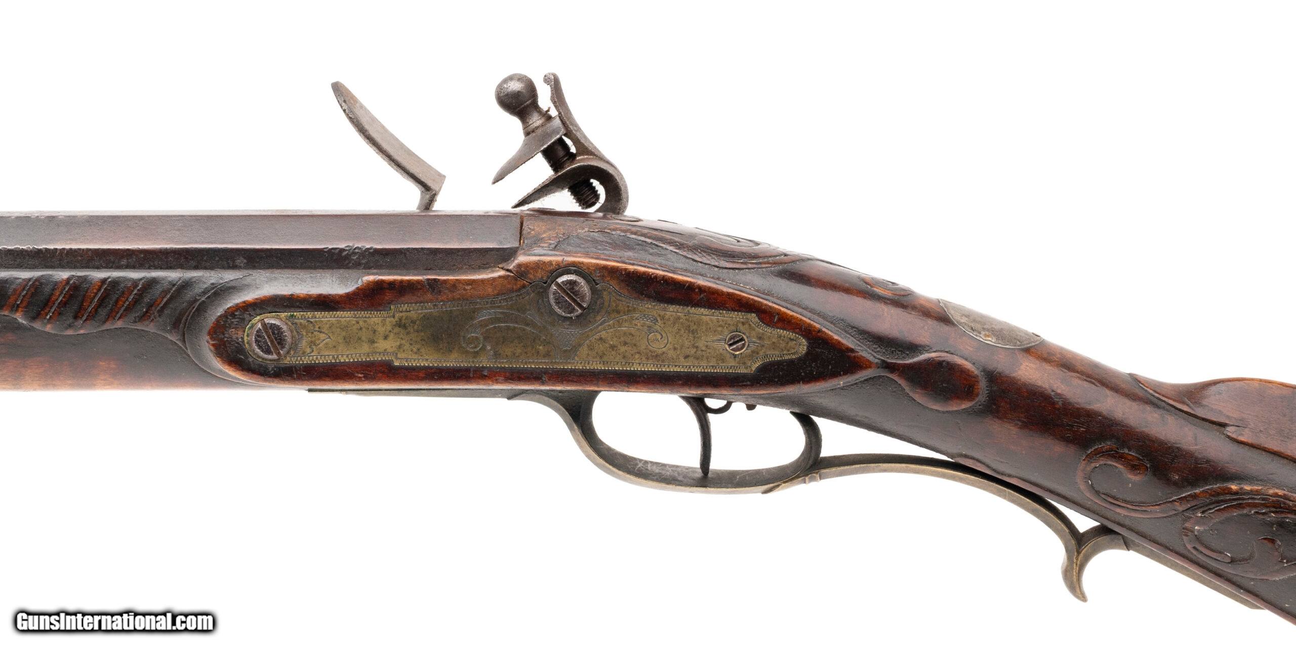 Description: "Made Circa 1790-1800. 44 caliber with a 43" barrel. This gun is untouched in all original condition, The barrel has a dark brown patina throughout. The top of the barrel is marked in cursive script “John Armstrong" The stock is magnificent with raised carved scrolls on the left hand side in his traditional style and carving around the tang and patch box. The patch box is excellent and is classic Armstrong design with the crossed scrolls on the Patch box itself. Armstrong made his own barrels, locks and stocks. He also did his own engraving. His rifles are renown for the quality and balance. Even dealer catalogs going back as far as 1910 show John Armstong rifles as being highly prized. In the book Thoughts On The Kentucky Rifle in its Golden Age by Joe Kindig Jr, Mr. Kindig says “I definitely consider John Armstrong one of the high quality makers of the Golden Age even though I prefer the fine gunsmiths who changed their designs more frequently. Most men who did not vary their designs were not superb workmen, and their designs are usually stilted. John Armstrong ‘s workmanship is magnificent, and his designs are just about perfection. I cannot overemphasize the beauty of his rifles." This is a a fantastic example of a Kentucky rifle Antique: Yes Price: $125,000.00 Contact Seller |