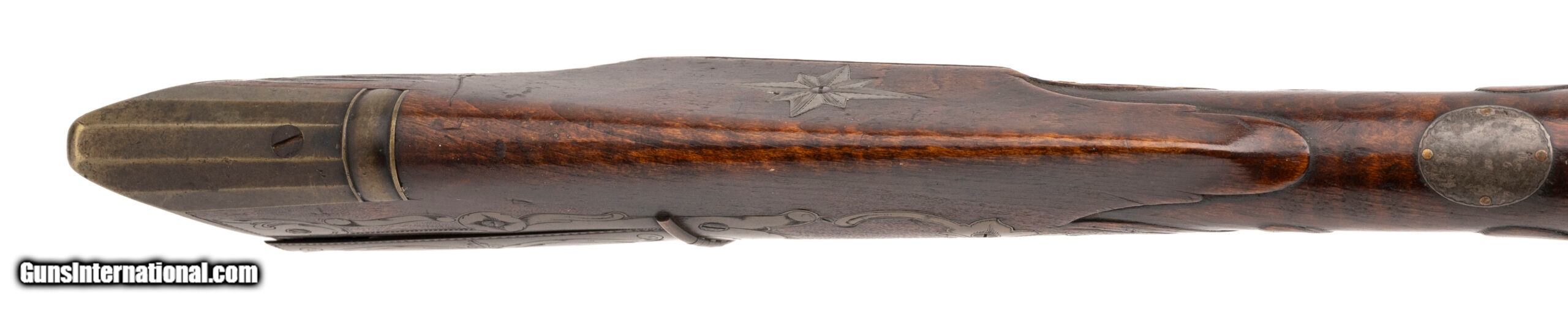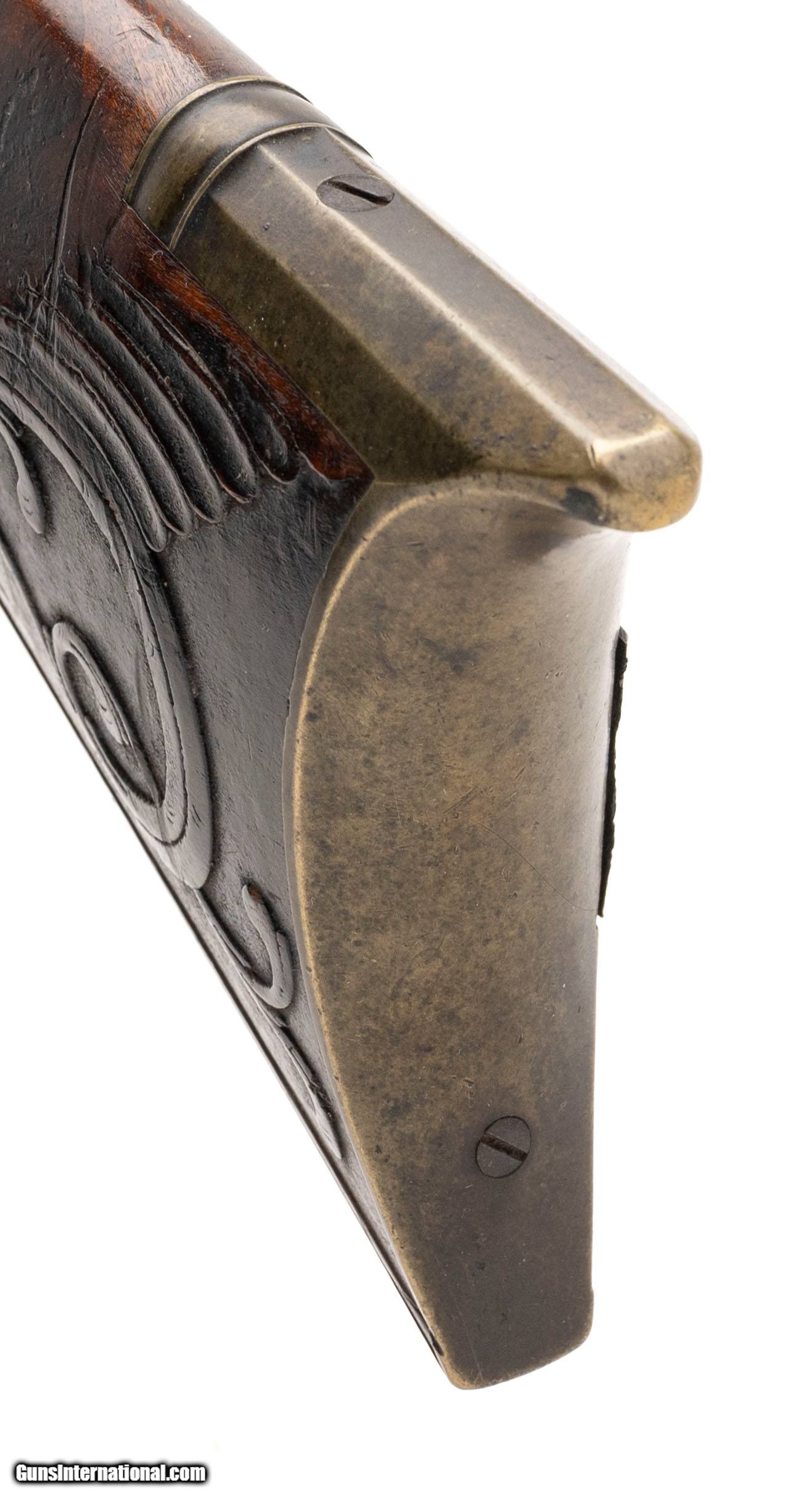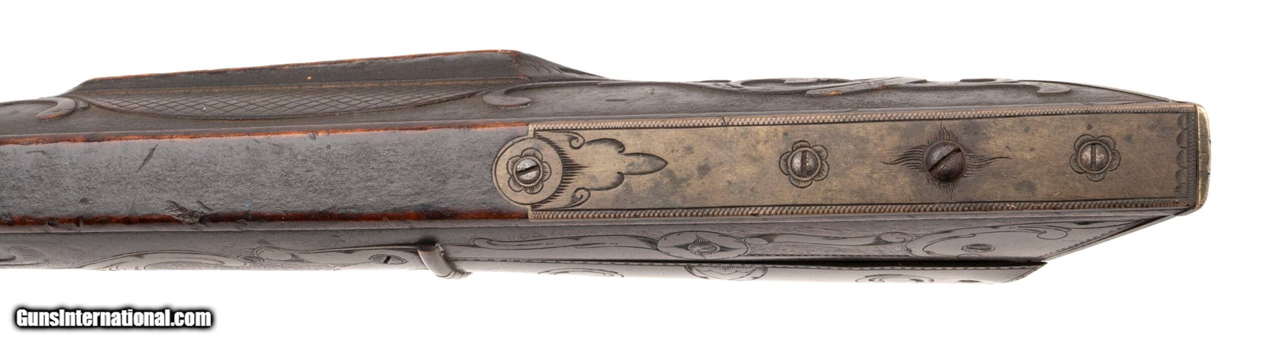 Description: "Made Circa 1790-1800. 44 caliber with a 43" barrel. This gun is untouched in all original condition, The barrel has a dark brown patina throughout. The top of the barrel is marked in cursive script “John Armstrong" The stock is magnificent with raised carved scrolls on the left hand side in his traditional style and carving around the tang and patch box. The patch box is excellent and is classic Armstrong design with the crossed scrolls on the Patch box itself. Armstrong made his own barrels, locks and stocks. He also did his own engraving. His rifles are renown for the quality and balance. Even dealer catalogs going back as far as 1910 show John Armstong rifles as being highly prized. In the book Thoughts On The Kentucky Rifle in its Golden Age by Joe Kindig Jr, Mr. Kindig says “I definitely consider John Armstrong one of the high quality makers of the Golden Age even though I prefer the fine gunsmiths who changed their designs more frequently. Most men who did not vary their designs were not superb workmen, and their designs are usually stilted. John Armstrong ‘s workmanship is magnificent, and his designs are just about perfection. I cannot overemphasize the beauty of his rifles." This is a a fantastic example of a Kentucky rifle Antique: Yes Price: $125,000.00 Contact Seller |