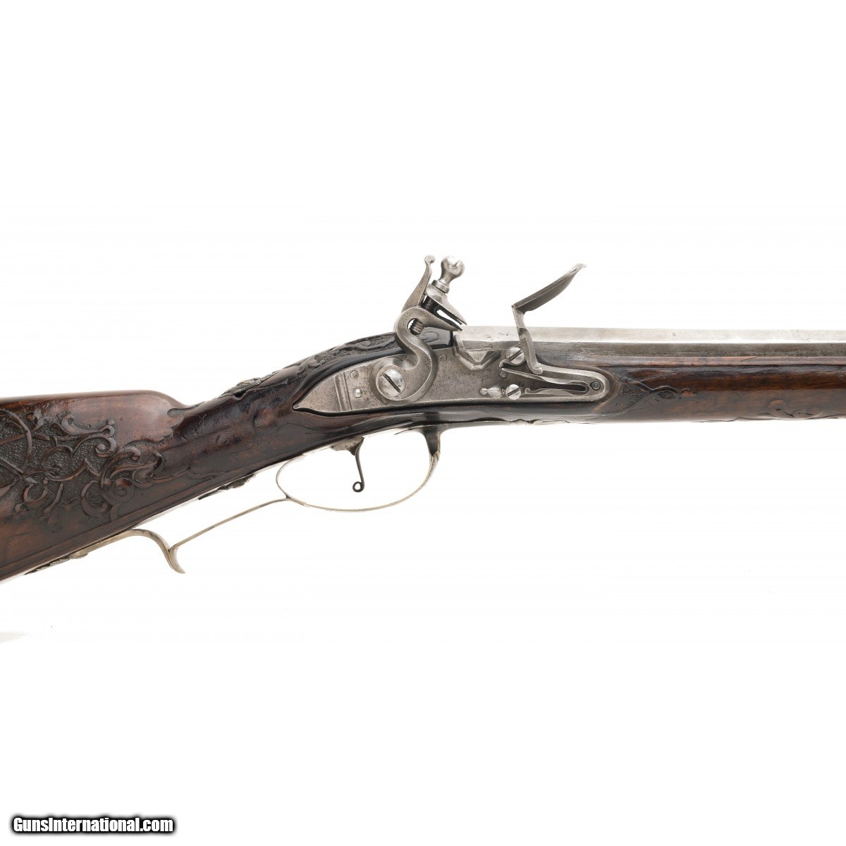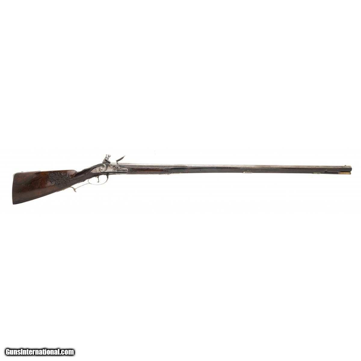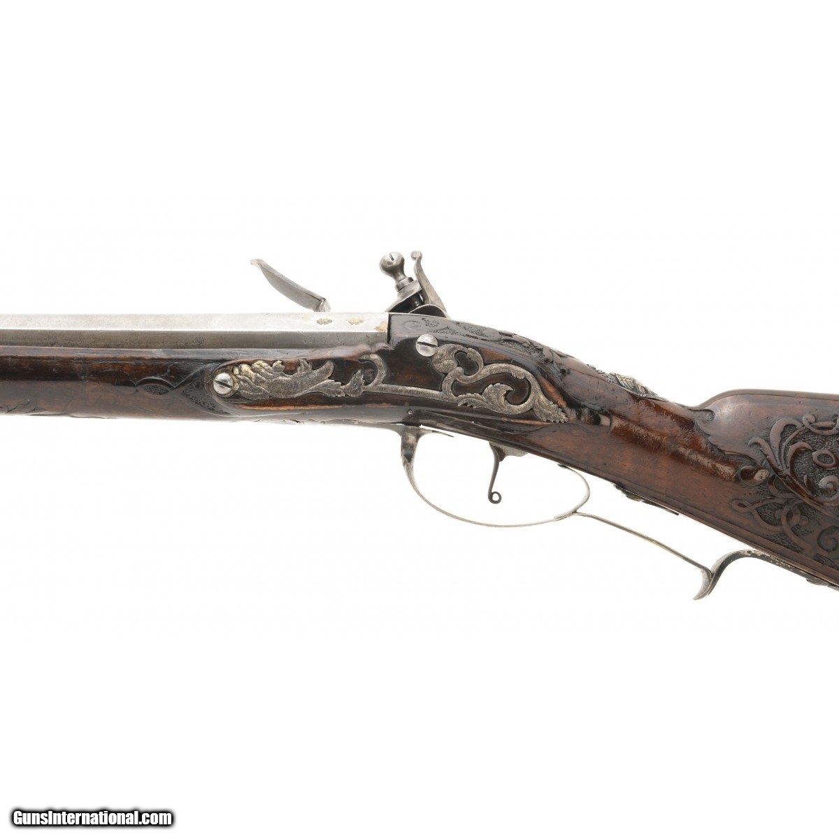 Description: " This is a very nice looking circa 1750 Italian flintlock fowling piece. The overall length is approx. 56.5"". The approx. 41"" octagon to round approx. 60 caliber ""Spanish form"" barrel with Pistoia mark has a dark, smooth bore. The Pistoia marks still retain their original brass. The barrel is cleaned bright with evidence of old pitting. The lock is unmarked with a gooseneck cock and unbridled reshod frizzen. The lock plate is gray with evidence of old light pitting. the thumb piece features an Italian eagle with a rabbit in its talons. The silvered triggerguard mounts feature acanthus finials. The silvered mounts retain much original silver, now black with tarnish. The open work sideplate has a mythological creature. The figured full stock is carved with strap work on a pebbled ground. The stock carving is very good. The forend has been replaced from the rear ramrod pipe forward. This is an attractive Neapolitan fowling piece. SOLD Antique: Yes |