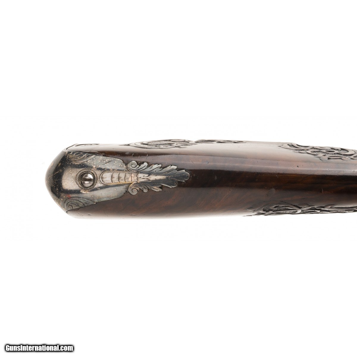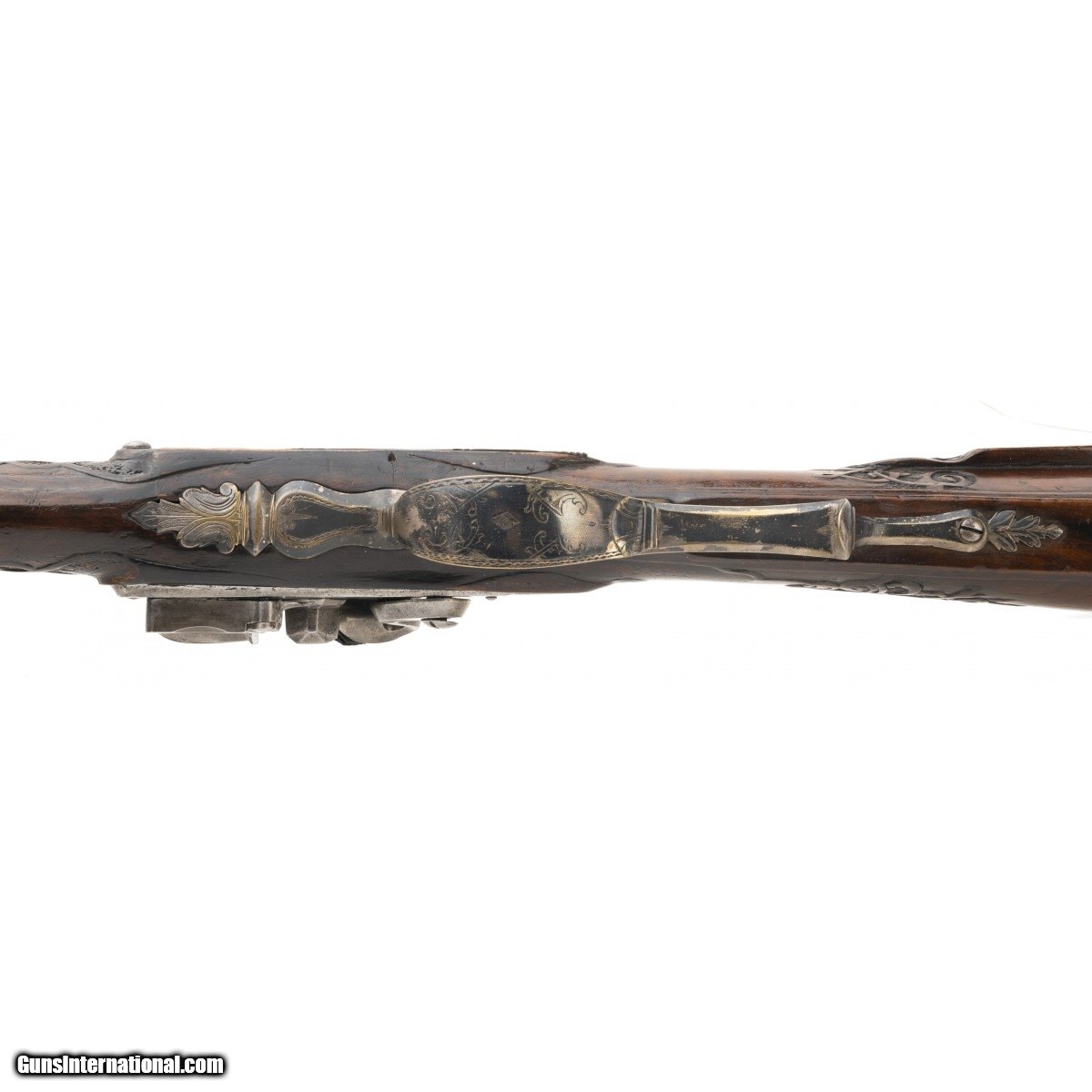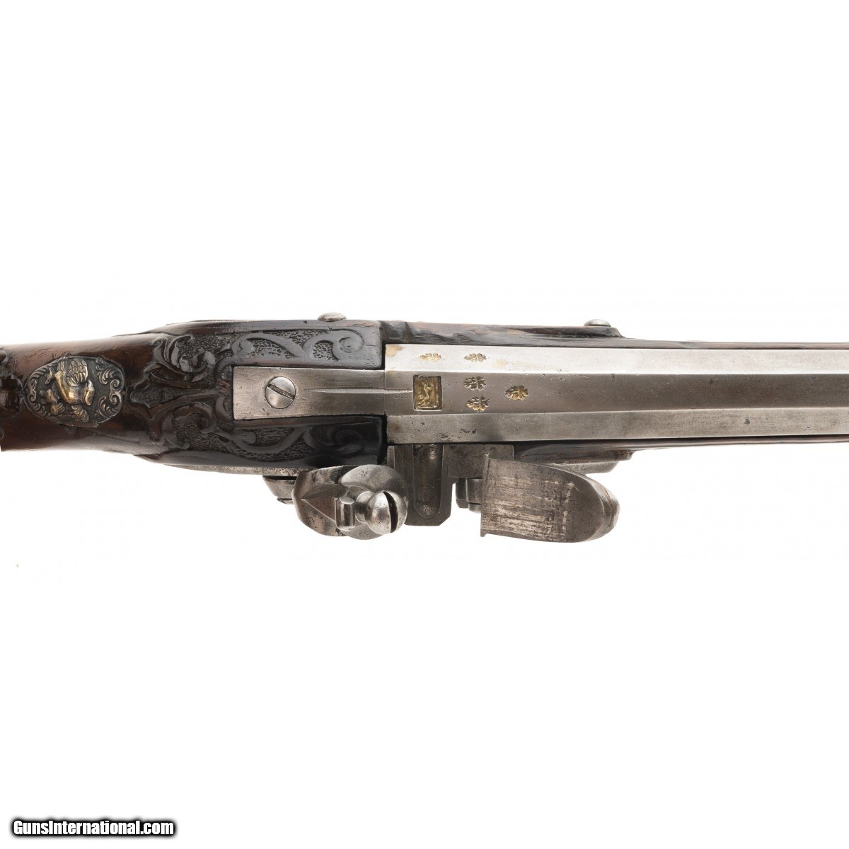 Description: " This is a very nice looking circa 1750 Italian flintlock fowling piece. The overall length is approx. 56.5"". The approx. 41"" octagon to round approx. 60 caliber ""Spanish form"" barrel with Pistoia mark has a dark, smooth bore. The Pistoia marks still retain their original brass. The barrel is cleaned bright with evidence of old pitting. The lock is unmarked with a gooseneck cock and unbridled reshod frizzen. The lock plate is gray with evidence of old light pitting. the thumb piece features an Italian eagle with a rabbit in its talons. The silvered triggerguard mounts feature acanthus finials. The silvered mounts retain much original silver, now black with tarnish. The open work sideplate has a mythological creature. The figured full stock is carved with strap work on a pebbled ground. The stock carving is very good. The forend has been replaced from the rear ramrod pipe forward. This is an attractive Neapolitan fowling piece. SOLD Antique: Yes |