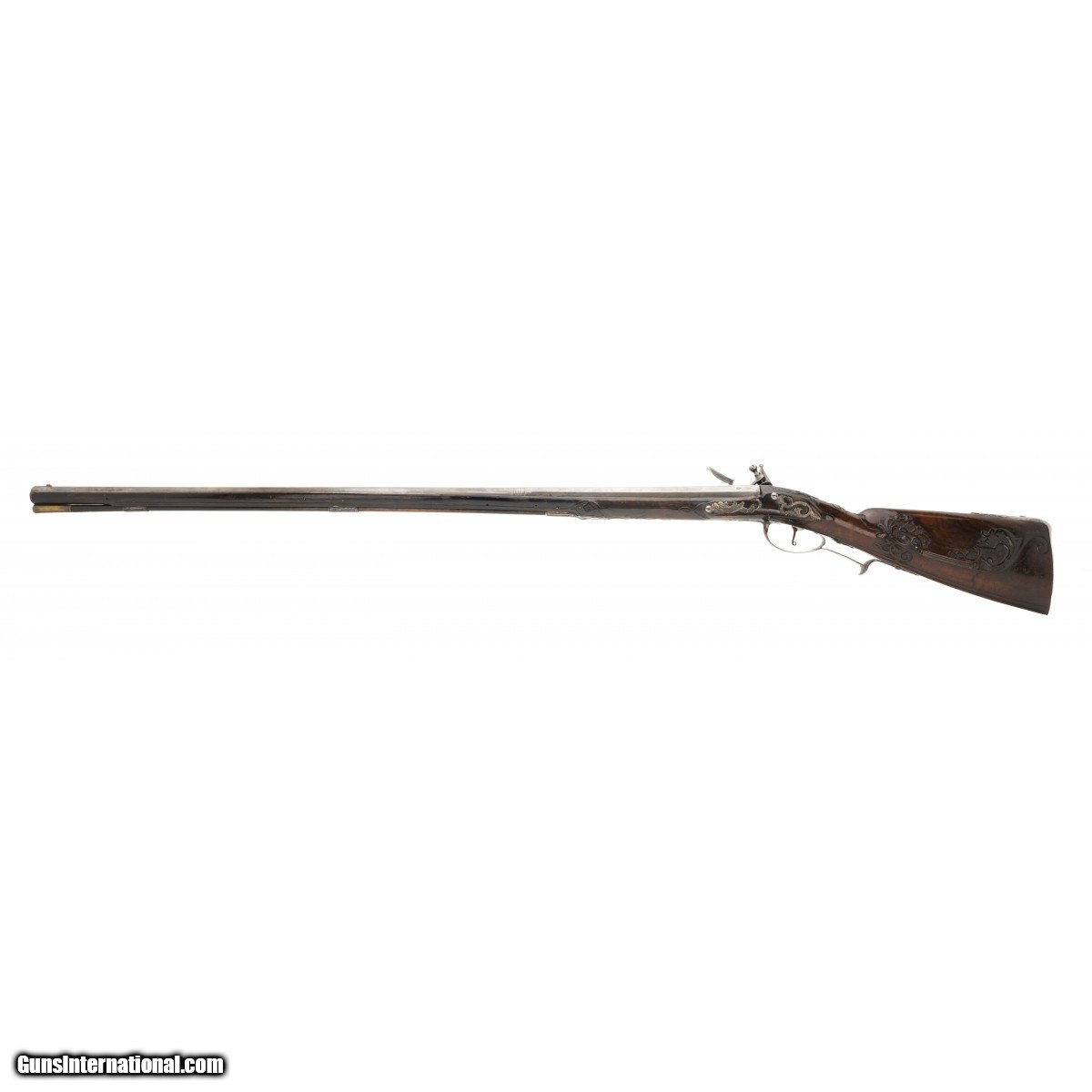 This is a very nice looking circa 1750 Italian flintlock fowling piece. The overall length is approx. 56.5"". The approx. 41"" octagon to round approx. 60 caliber ""Spanish form"" barrel with Pistoia mark has a dark, smooth bore. The Pistoia marks still retain their original brass. The barrel is cleaned bright with evidence of old pitting. The lock is unmarked with a gooseneck cock and unbridled reshod frizzen. The lock plate is gray with evidence of old light pitting. the thumb piece features an Italian eagle with a rabbit in its talons. The silvered triggerguard mounts feature acanthus finials. The silvered mounts retain much original silver, now black with tarnish. The open work sideplate has a mythological creature. The figured full stock is carved with strap work on a pebbled ground. The stock carving is very good. The forend has been replaced from the rear ramrod pipe forward. This is an attractive Neapolitan fowling piece.