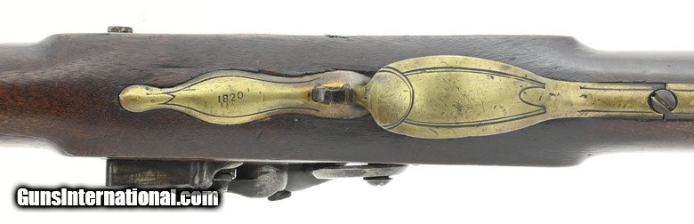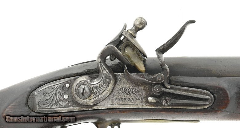 Description: " Blunderbuss with funnel muzzle is 2¼" diameter. Lock is marked “Jos Golcher" (Joseph Golcher was a lock maker only in Philiadelpia). Flintlock with Roller frizzen, so probably manufactured approximately 1810-1820. Barrel length 26½" and 40" overall length. Trigger guard finial marked “1820". There are some worn letters on the breech end of the barrel that are not legible. No proof marks. This is possibly an American made blunderbuss. Action works perfectly. Very unusual blunderbuss! SOLD Antique: Yes |
